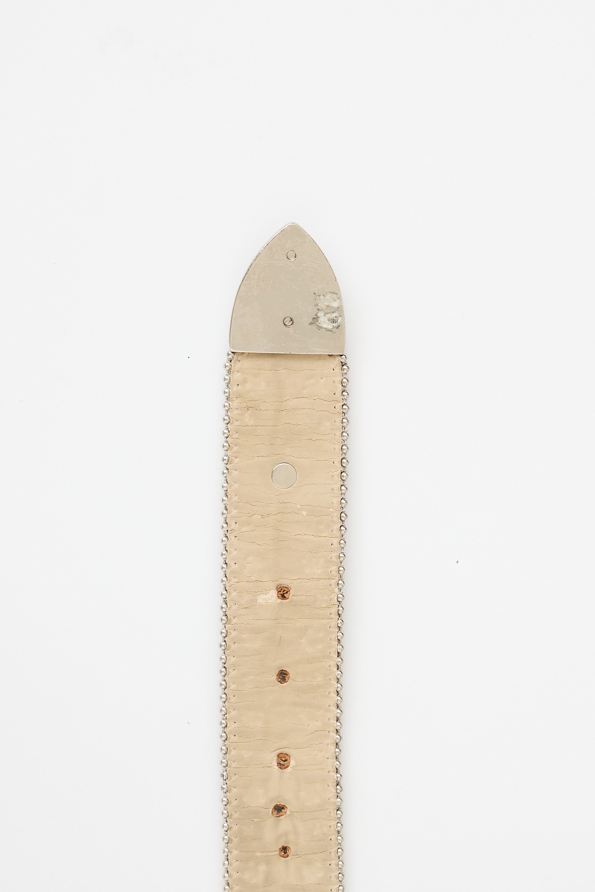 As is Heavy cracking in leather at interior, heavy scratches on metal buckle, additional holes added.