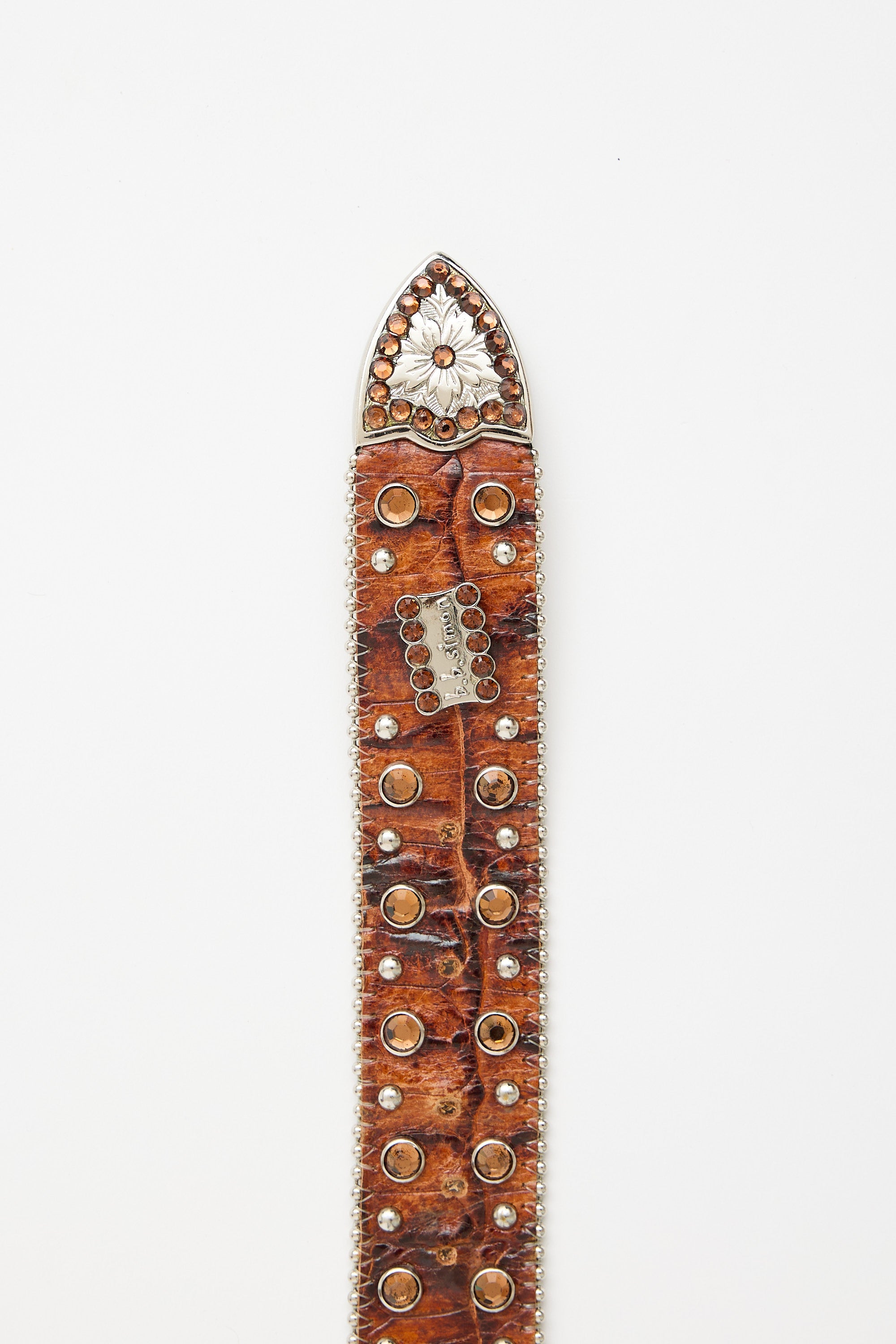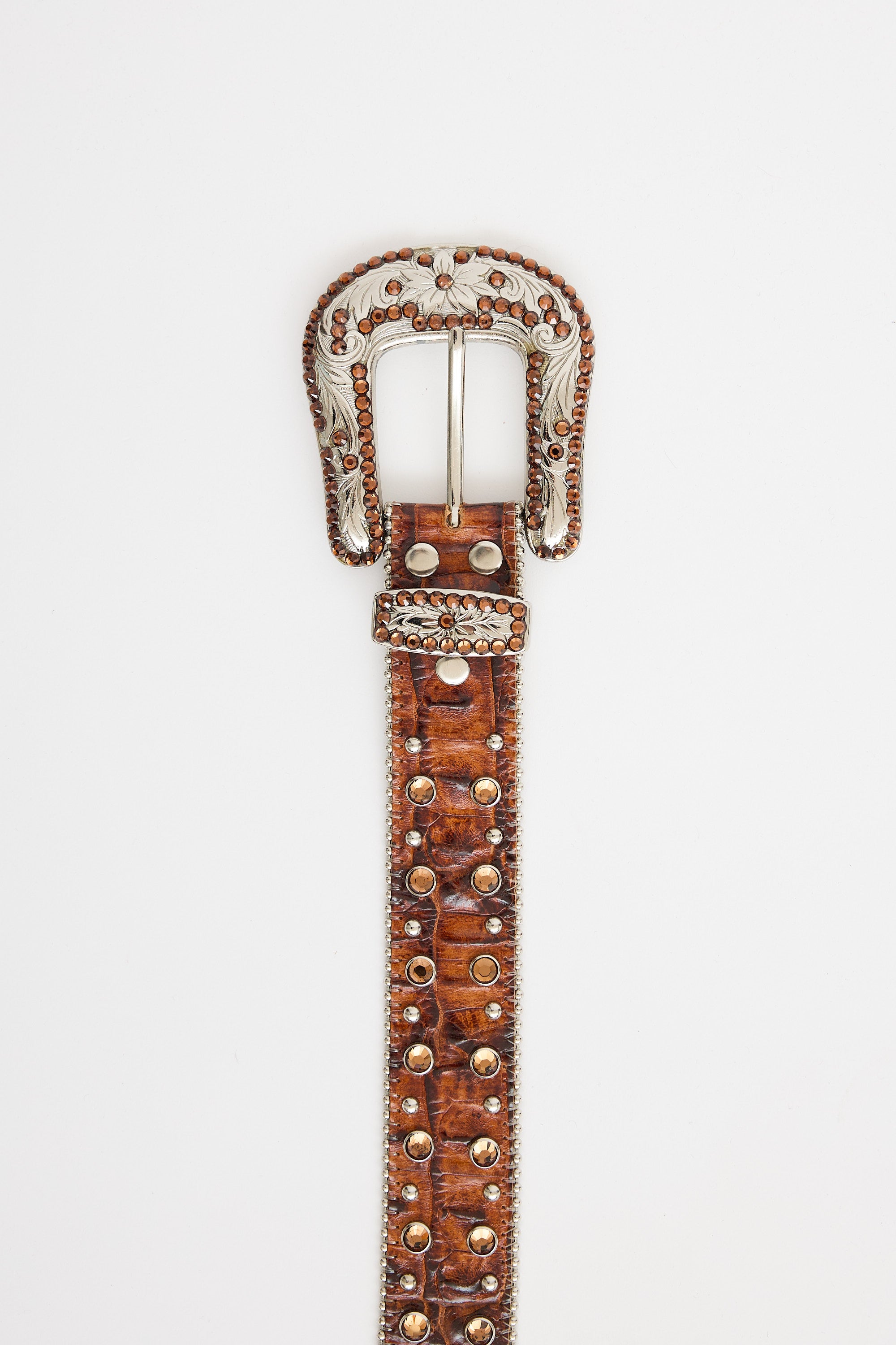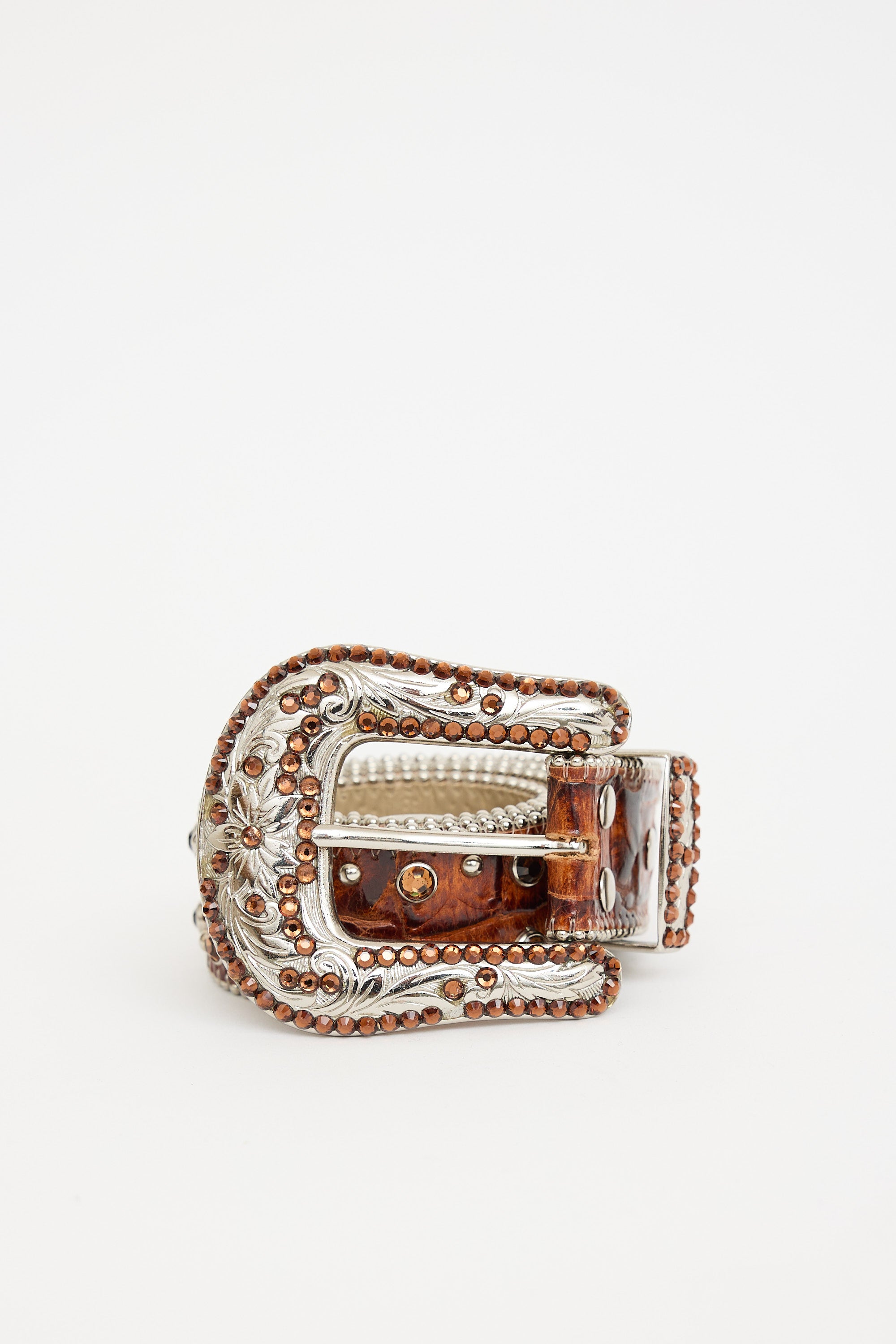Pre-owned B.B. Simon brown croc embossed leather belt featuring silver tone beaded trim, crystal and metal embellishments and large metal buckle with embossed floral pattern.