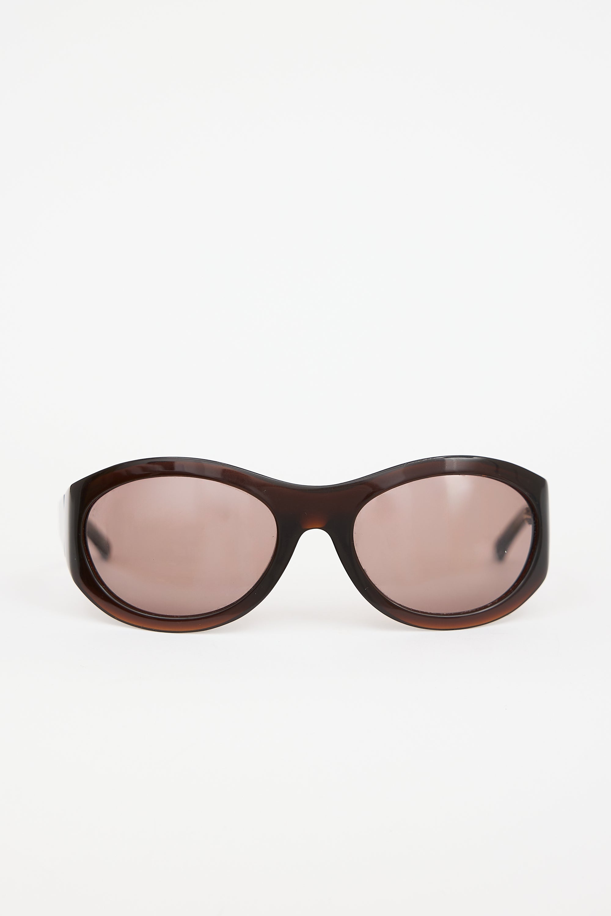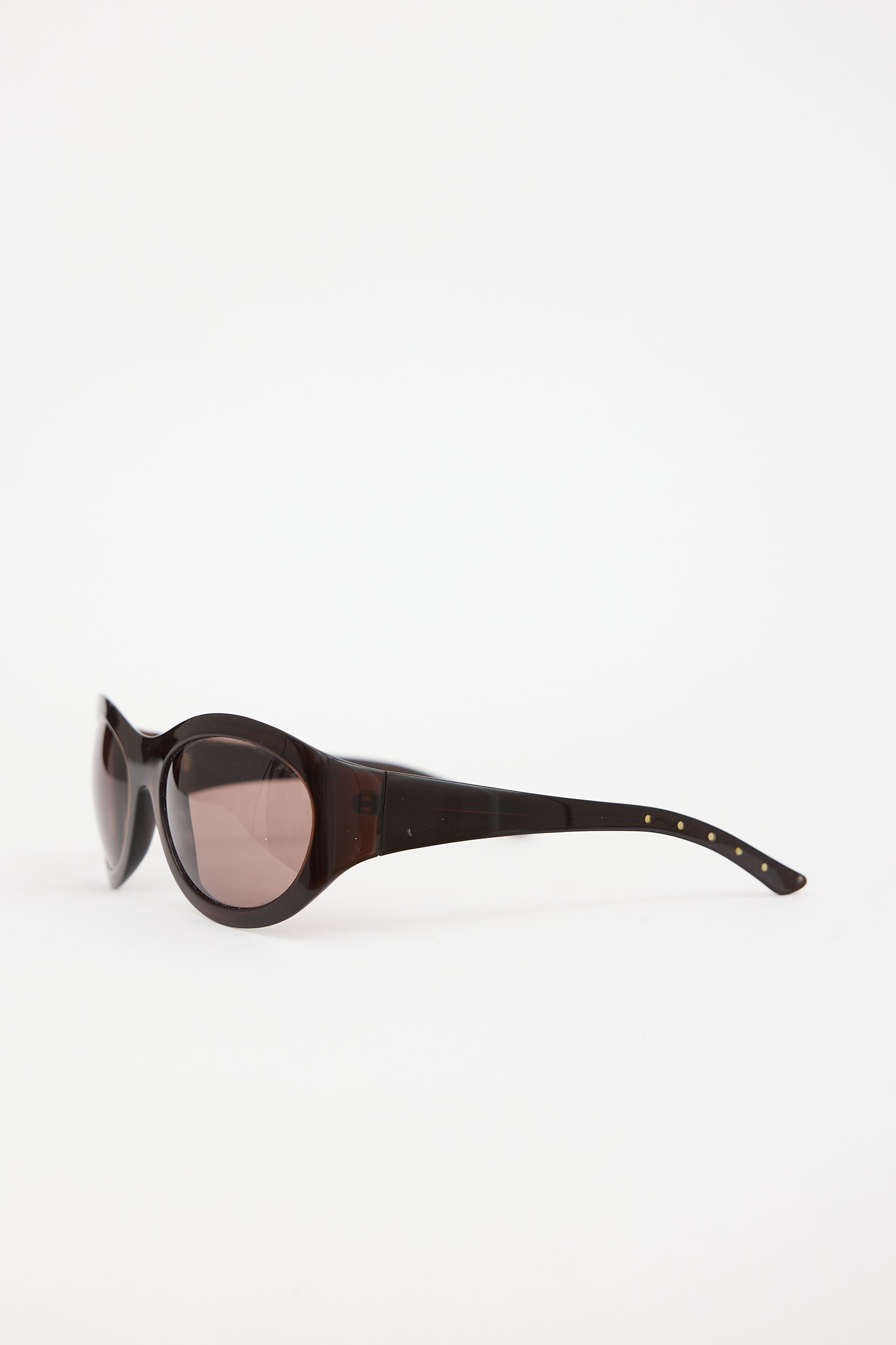Pre-owned Bottega Veneta BV07/S sunglasses featuring brown tinted lenses, brown acetate oval frame, and inlaid dot accents along arms. Comes with original case.