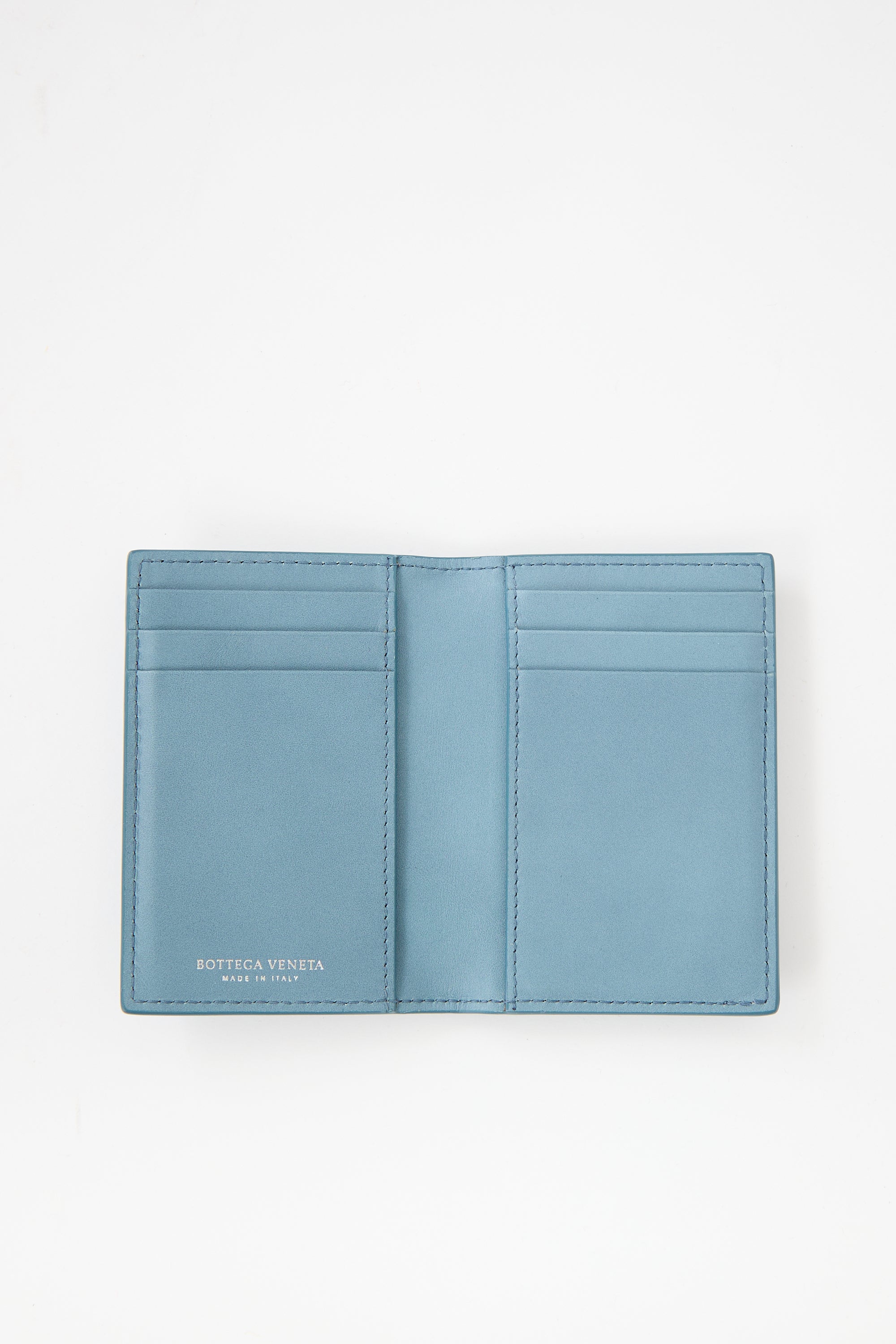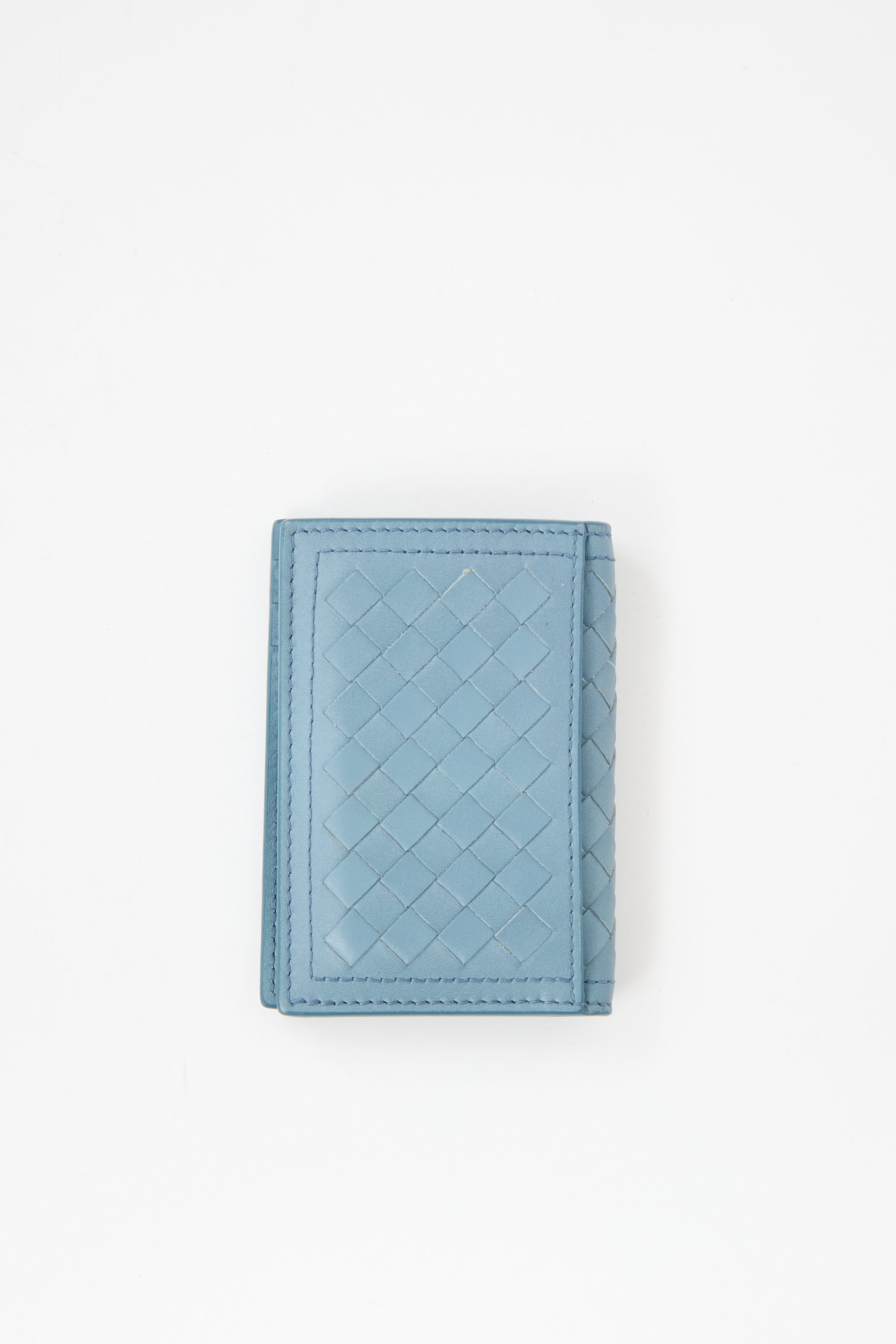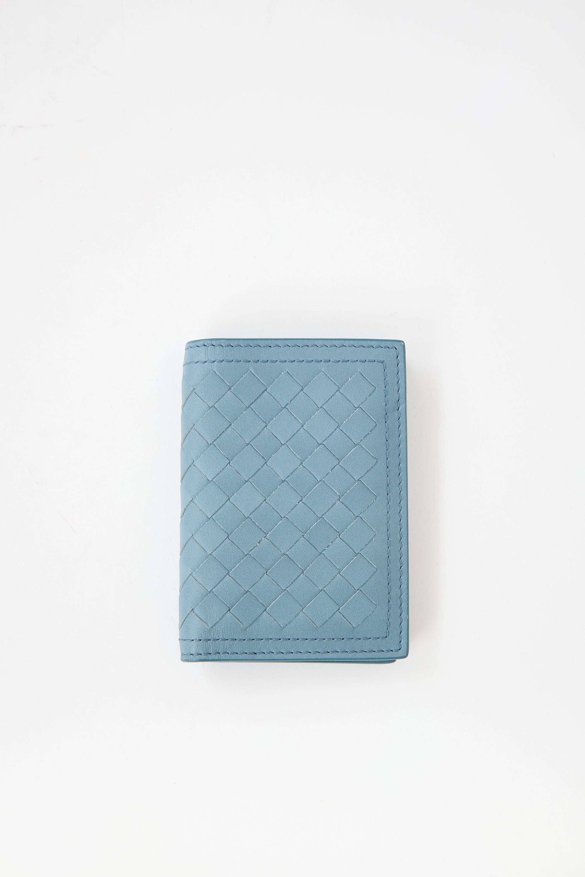 Pre-owned Bottega Veneta blue Intrecciato woven leather bifold wallet featuring one exterior slip pocket, two interior bill slots, six card slots, and silver tone stamped logo at interior. Comes with original box.