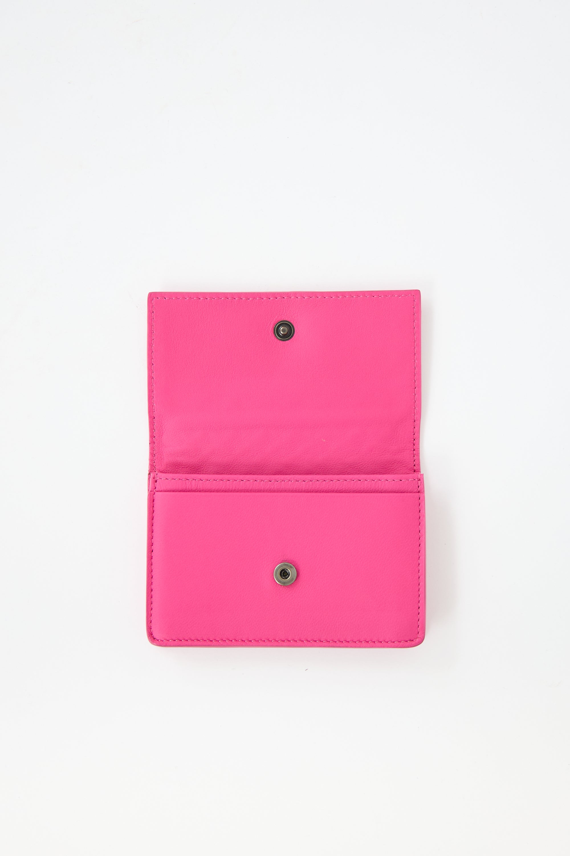 Pre-owned Bottega Veneta pink business card case featuring a Intrecciato woven leather top flap with snap button closure, one exterior slip pocket, one interior slip pocket, and one main compartment. Comes with original dust bag.