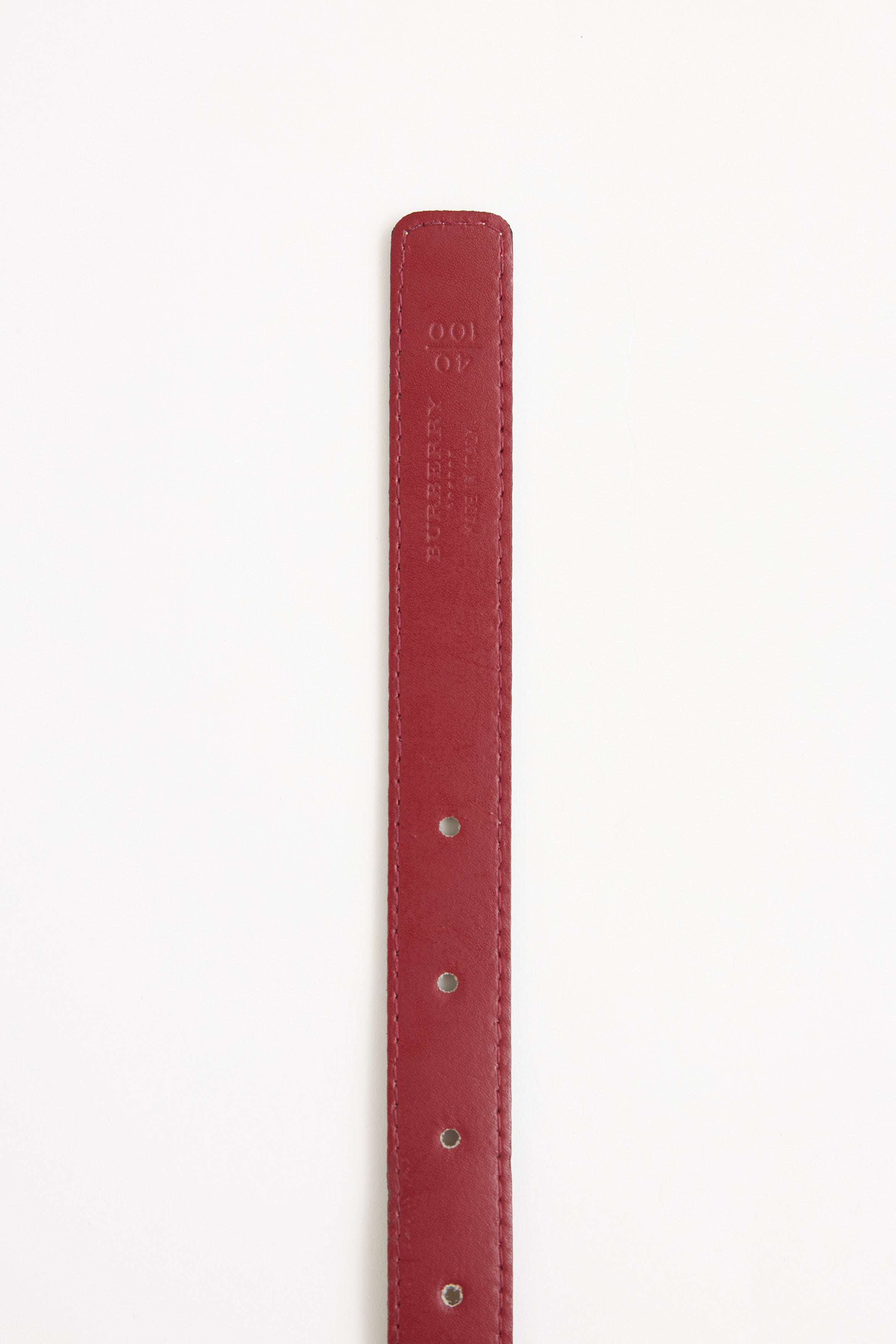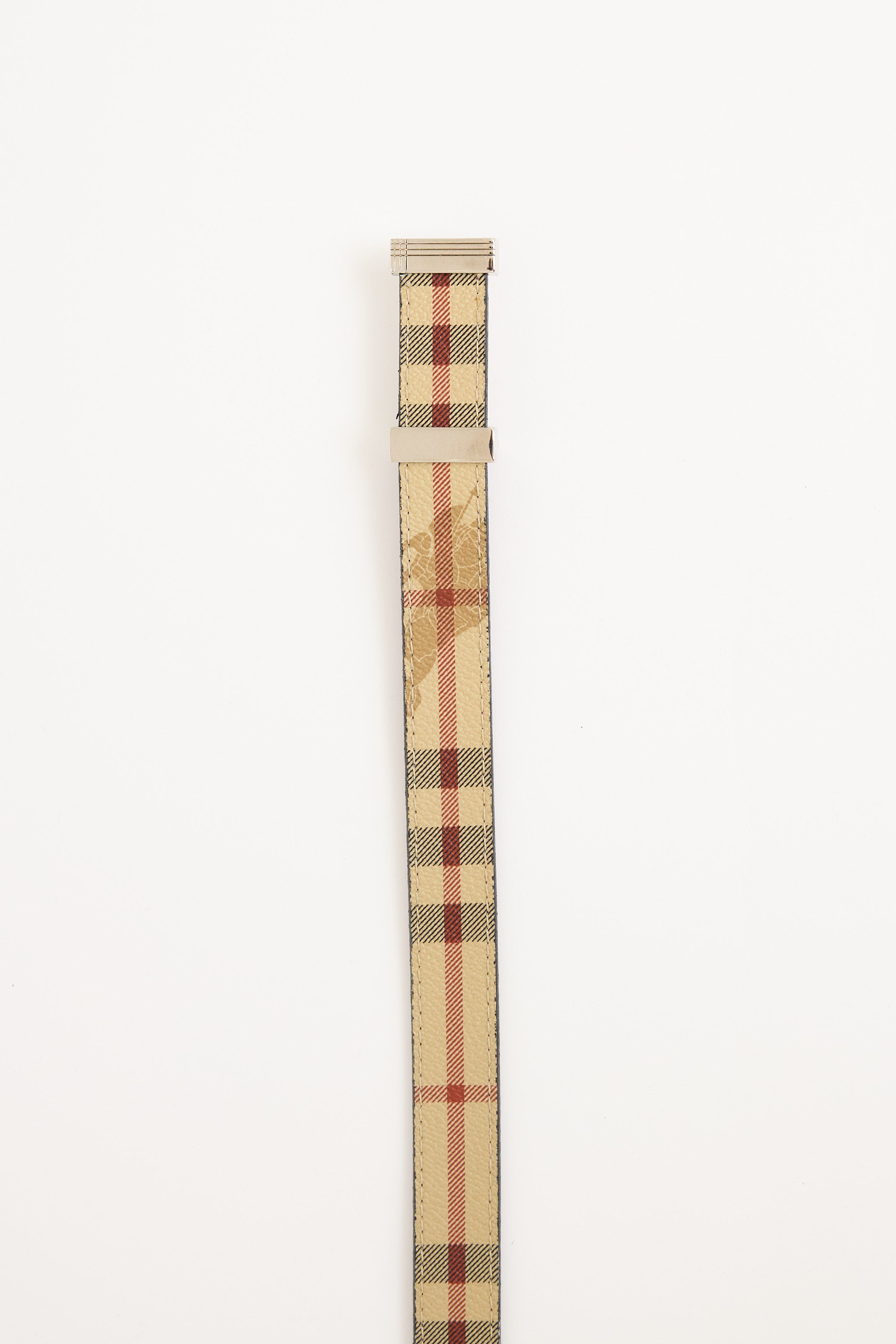 Pre-owned Burberry beige and red leather belt featuring silver tone adjustable push pin closure, reversible styling, and Haymarket Check.