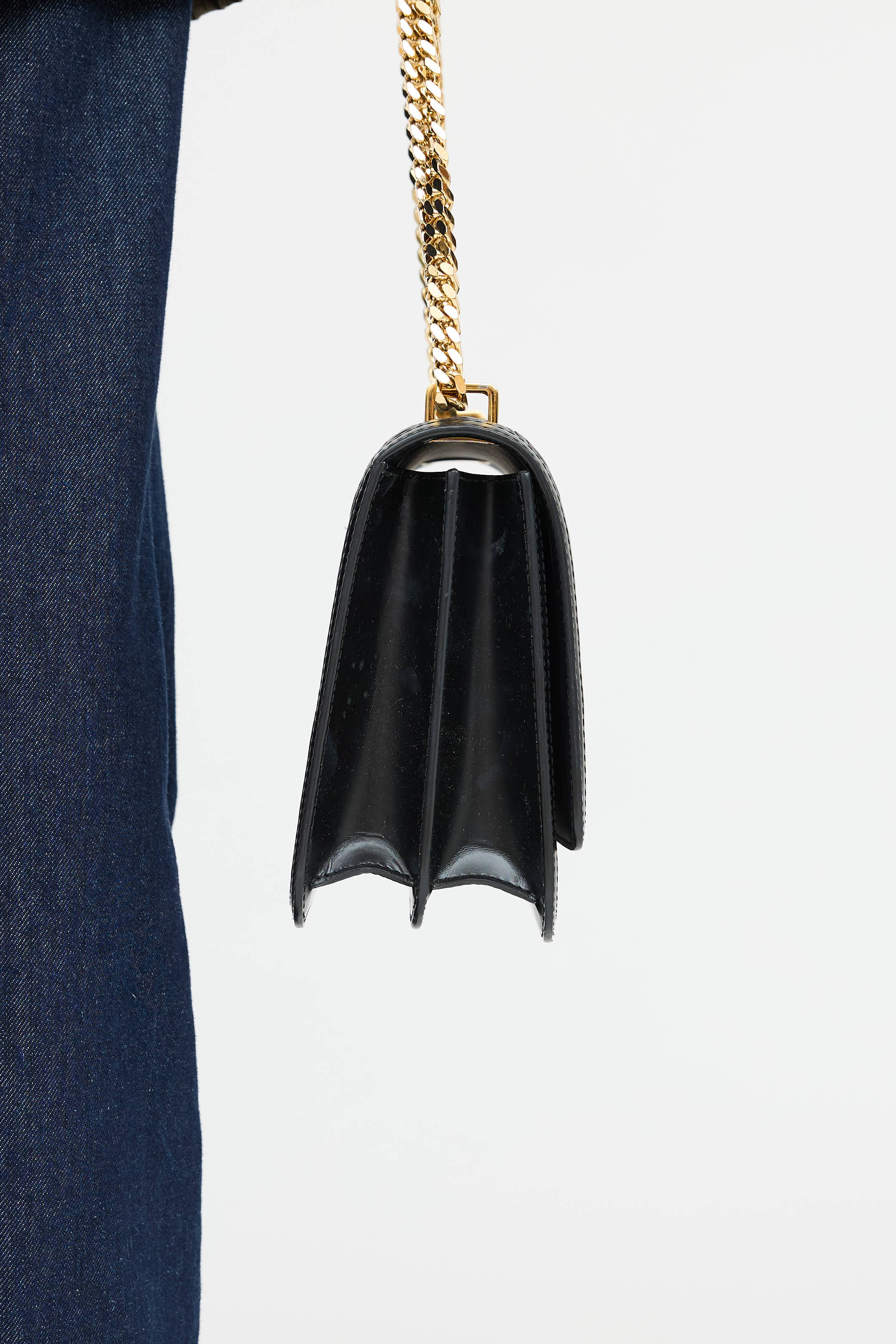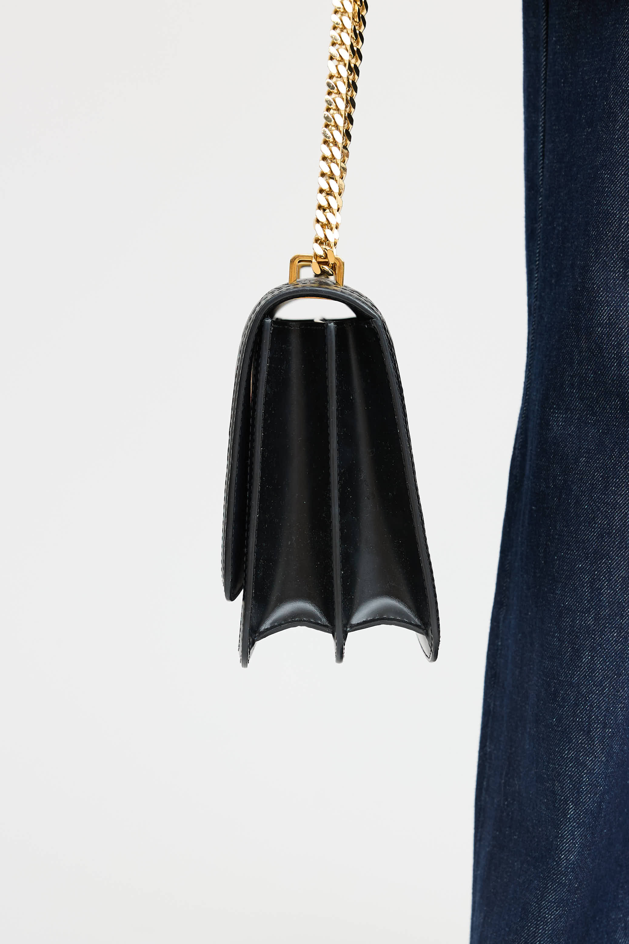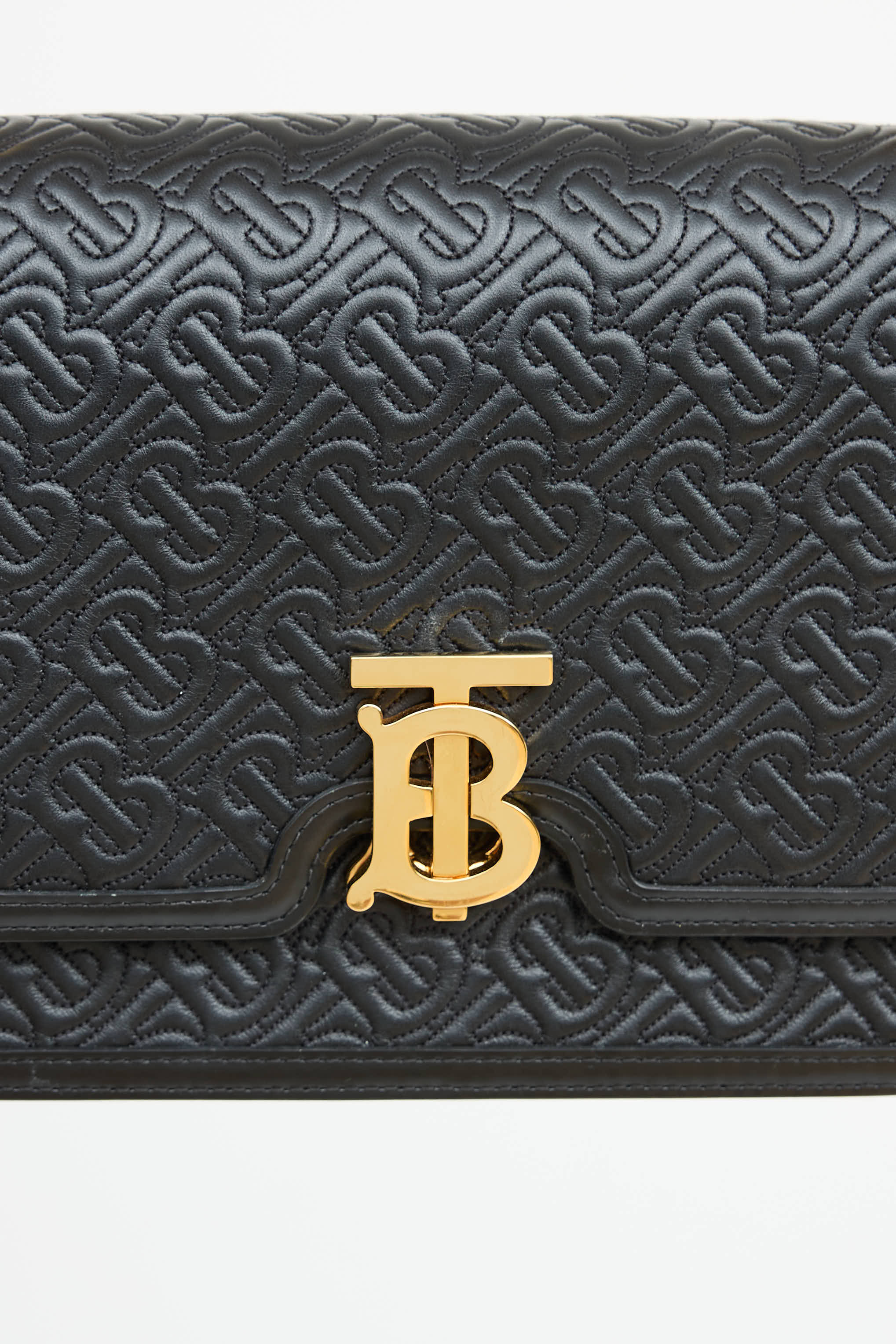 Pre-owned Burberry black leather shoulder bag featuring a quilted TB monogram pattern throughout, top flap, chain link shoulder strap, two main compartments with one zip pocket, and gold tone TB logo latch closure.