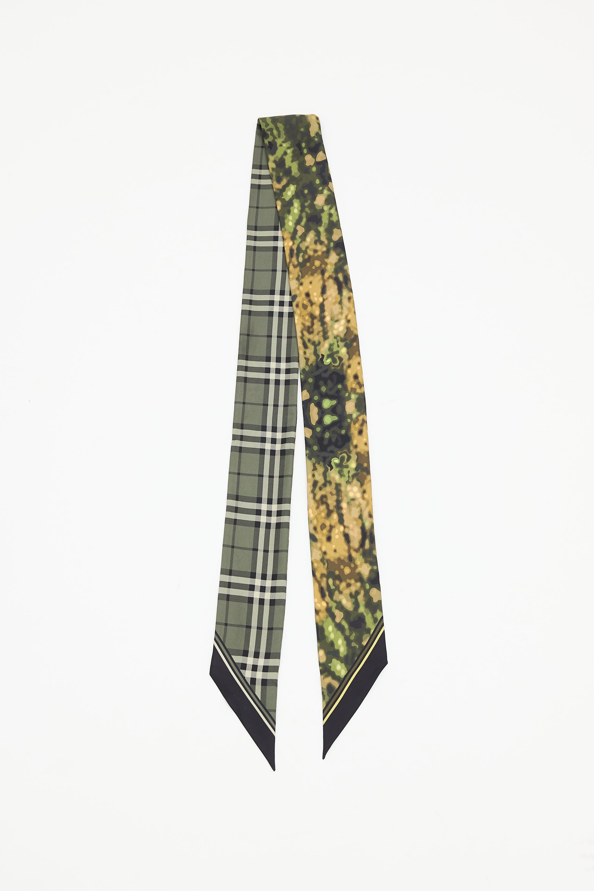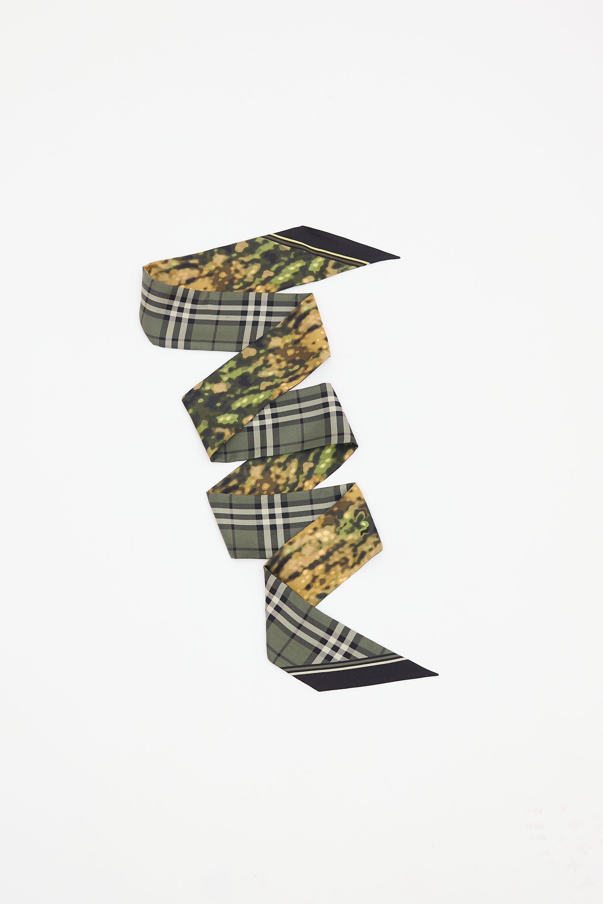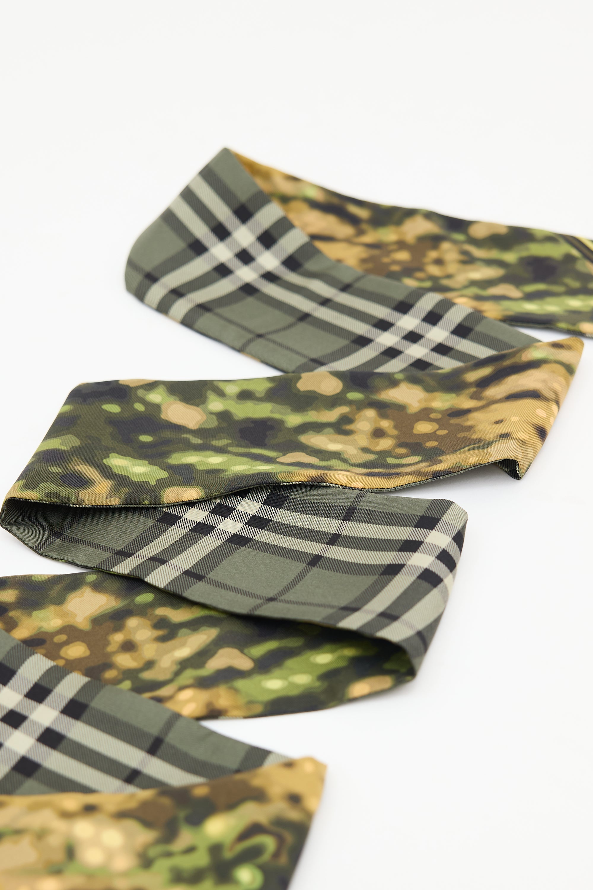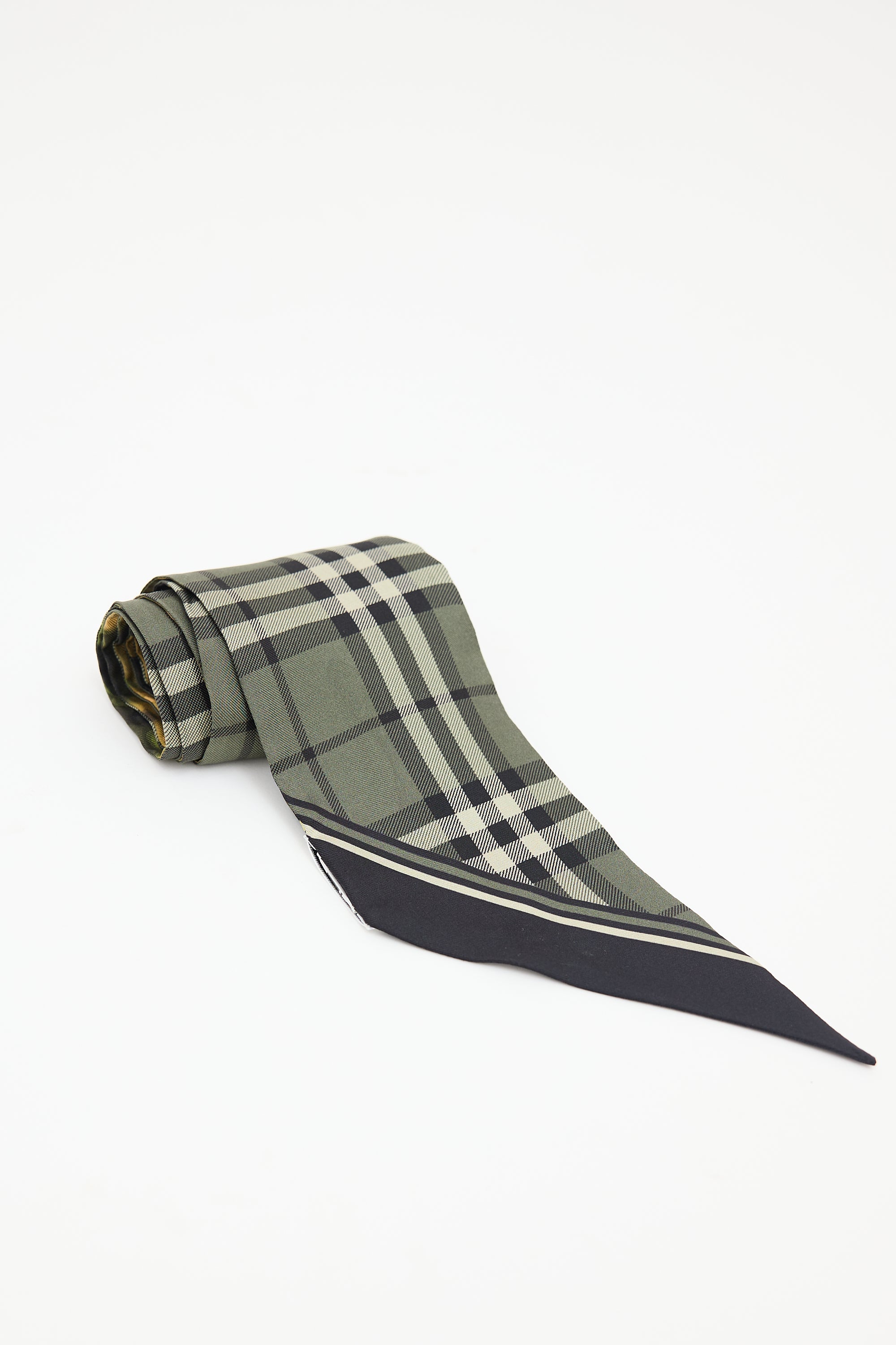 Pre-owned Burberry green silk skinny scarf featuring Vintage Check print, abstract reverse, and pointed ends.