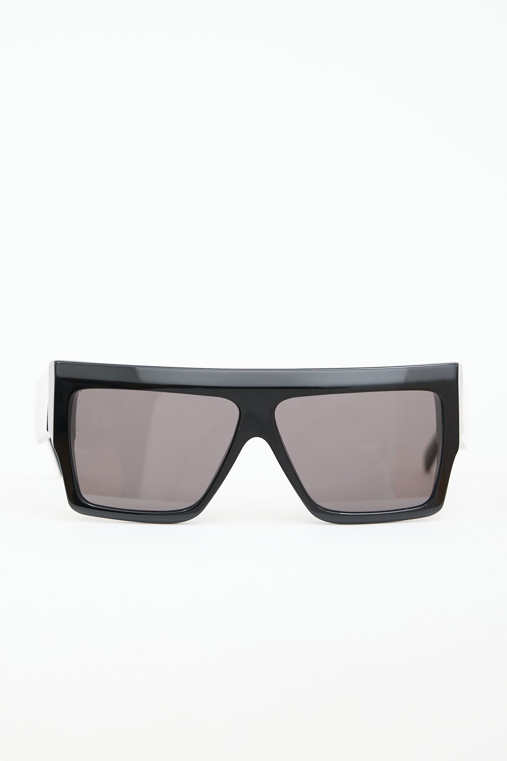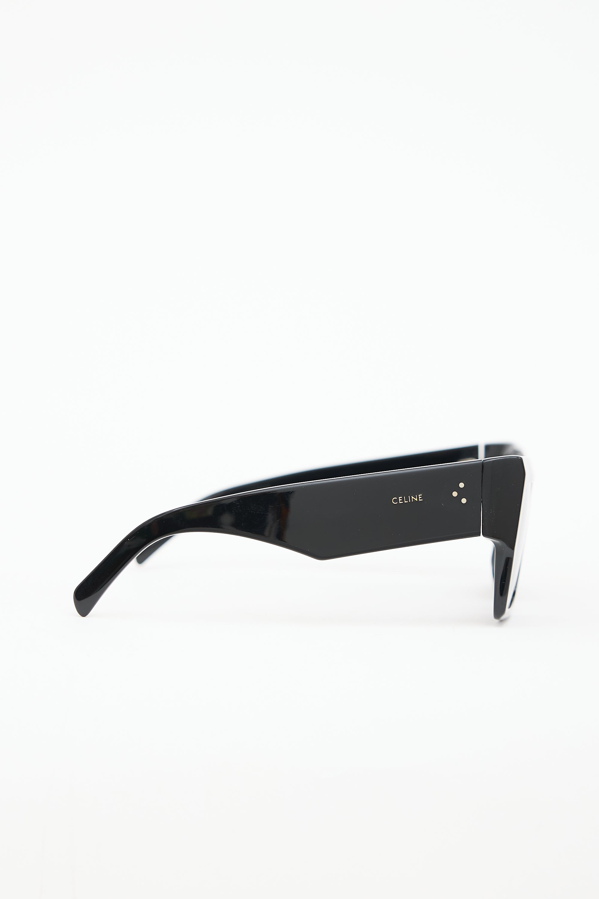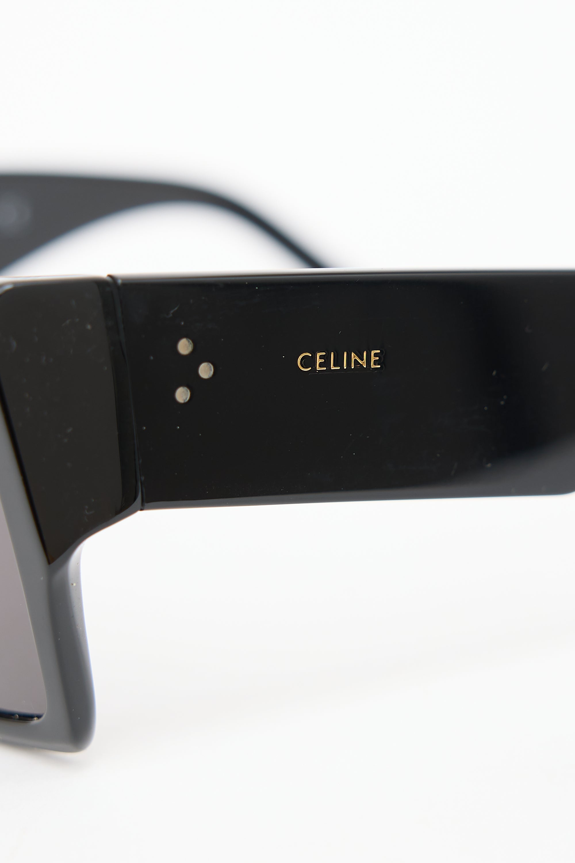 Pre-owned Celine black CL400921 sunglasses featuring straight brow, tonal lens, thick arms, and silver tone hardware. Includes original case. Hedi Slimane era design.