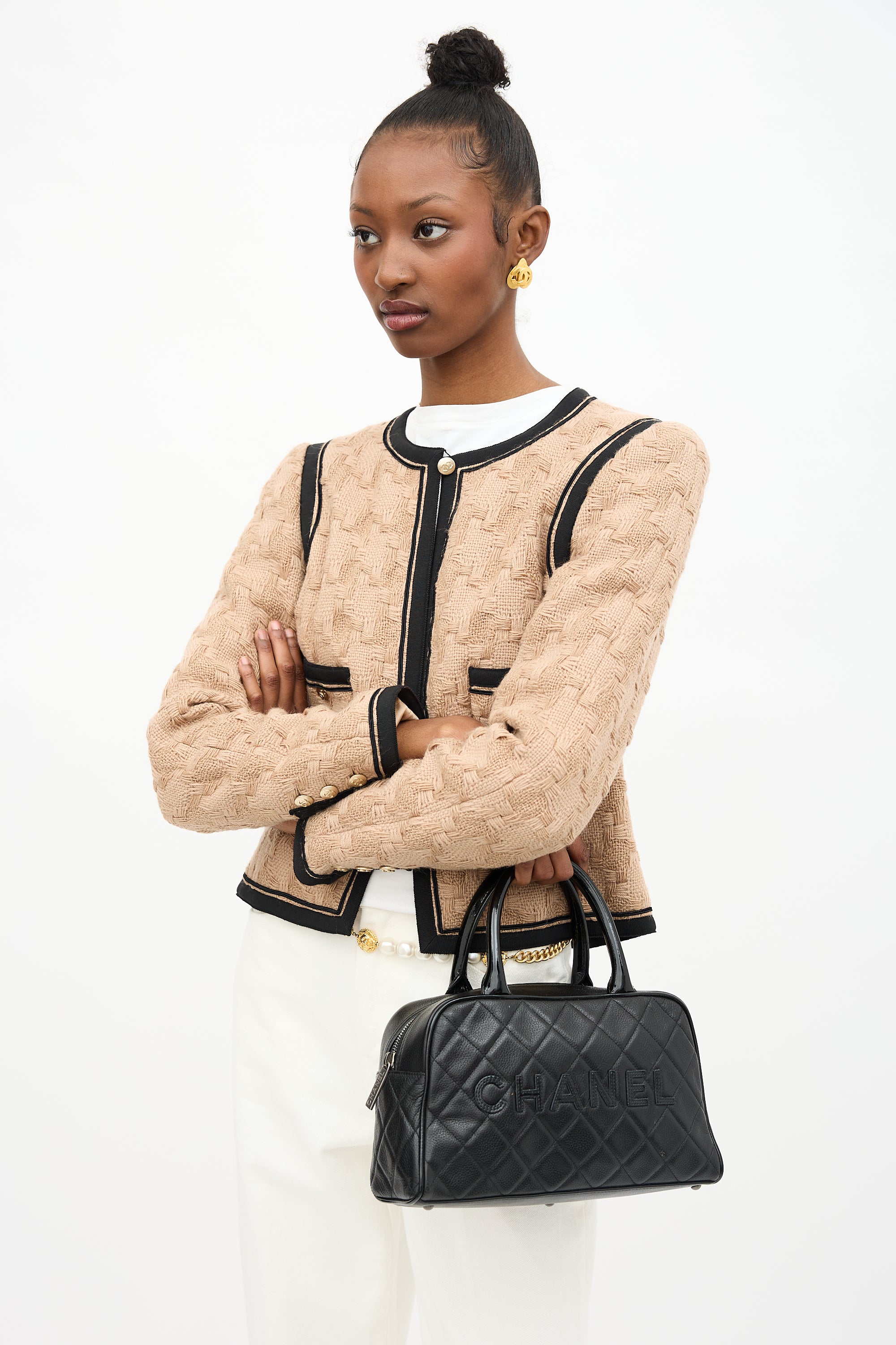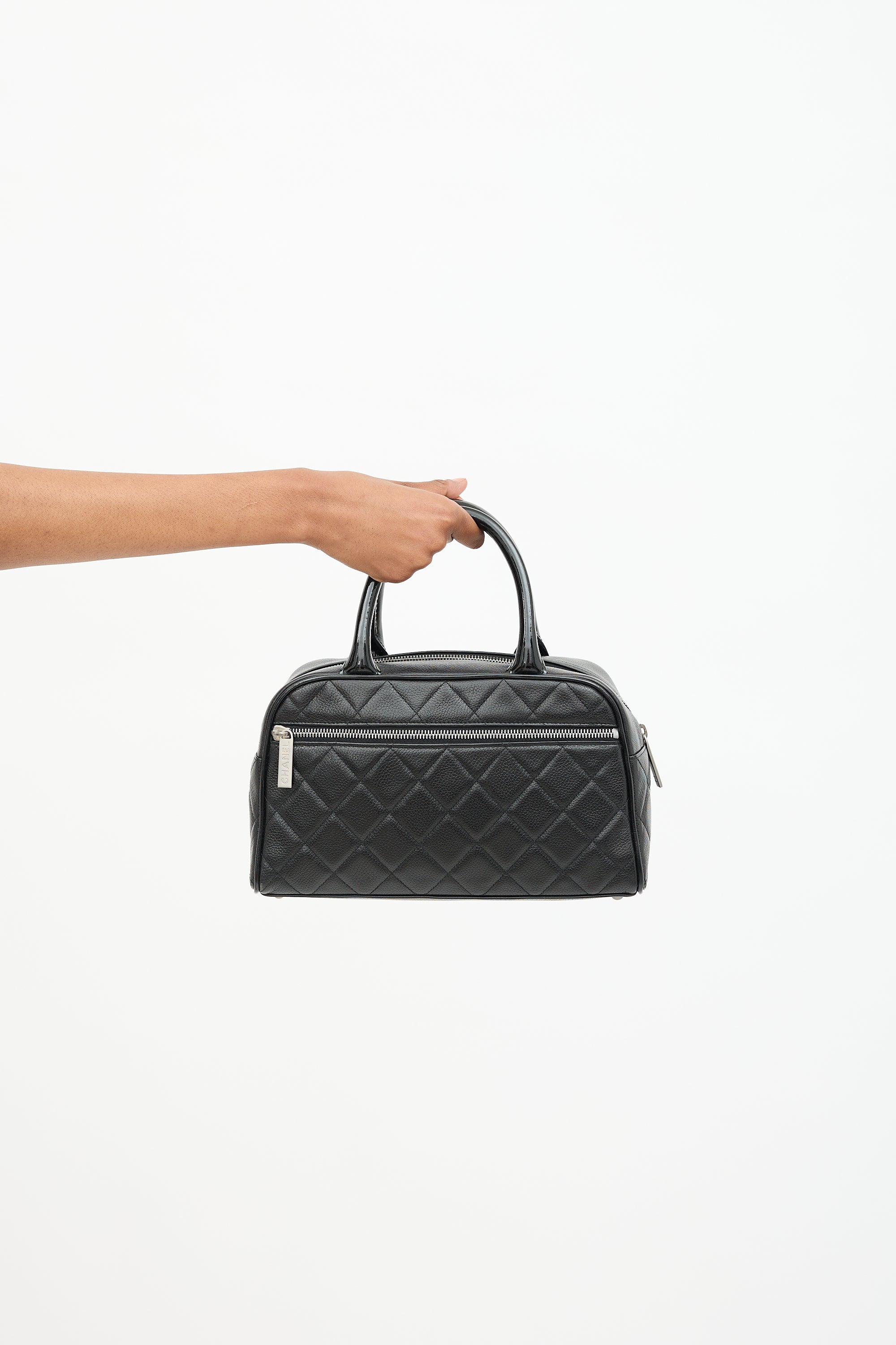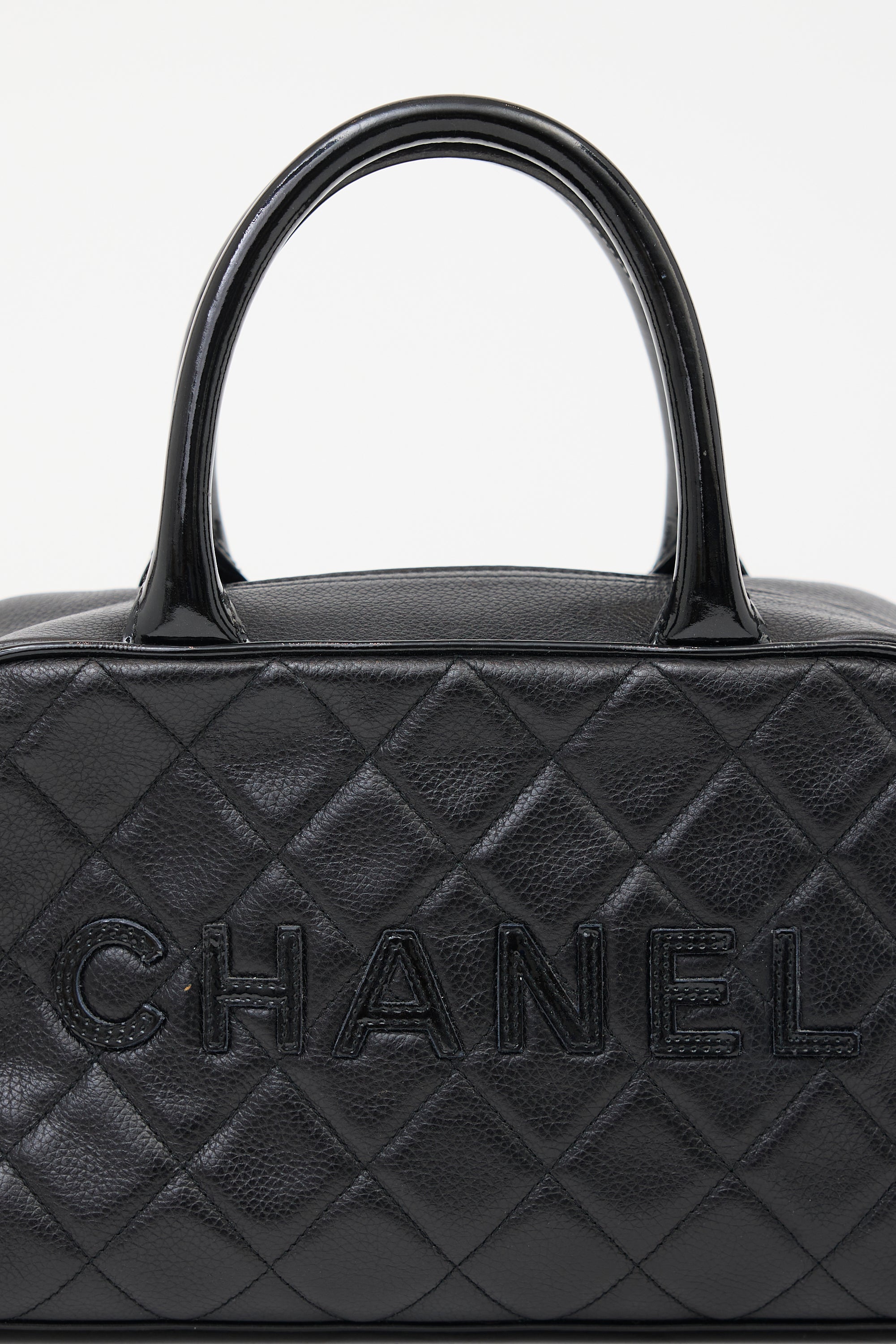Pre-owned Chanel 2000-2002 black Caviar leather bowling bag featuring five feet, diamond quilt stitching, front patch logo, back zip pocket, black patent leather trim and rolled top handles, top zip closure, and one lined main compartment with one zip pocket. Comes with original dust bag, care guide, and certificate of authenticity card.