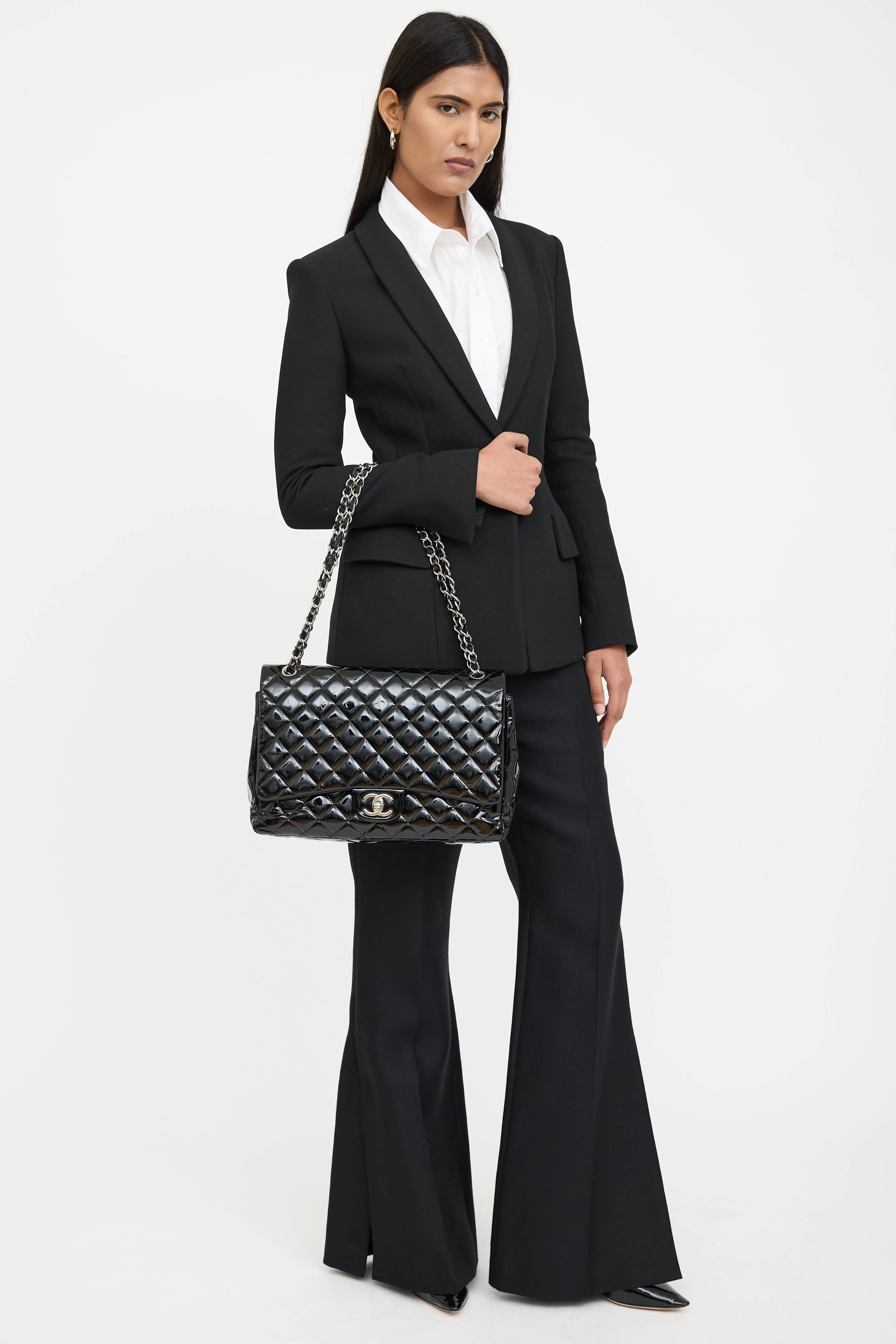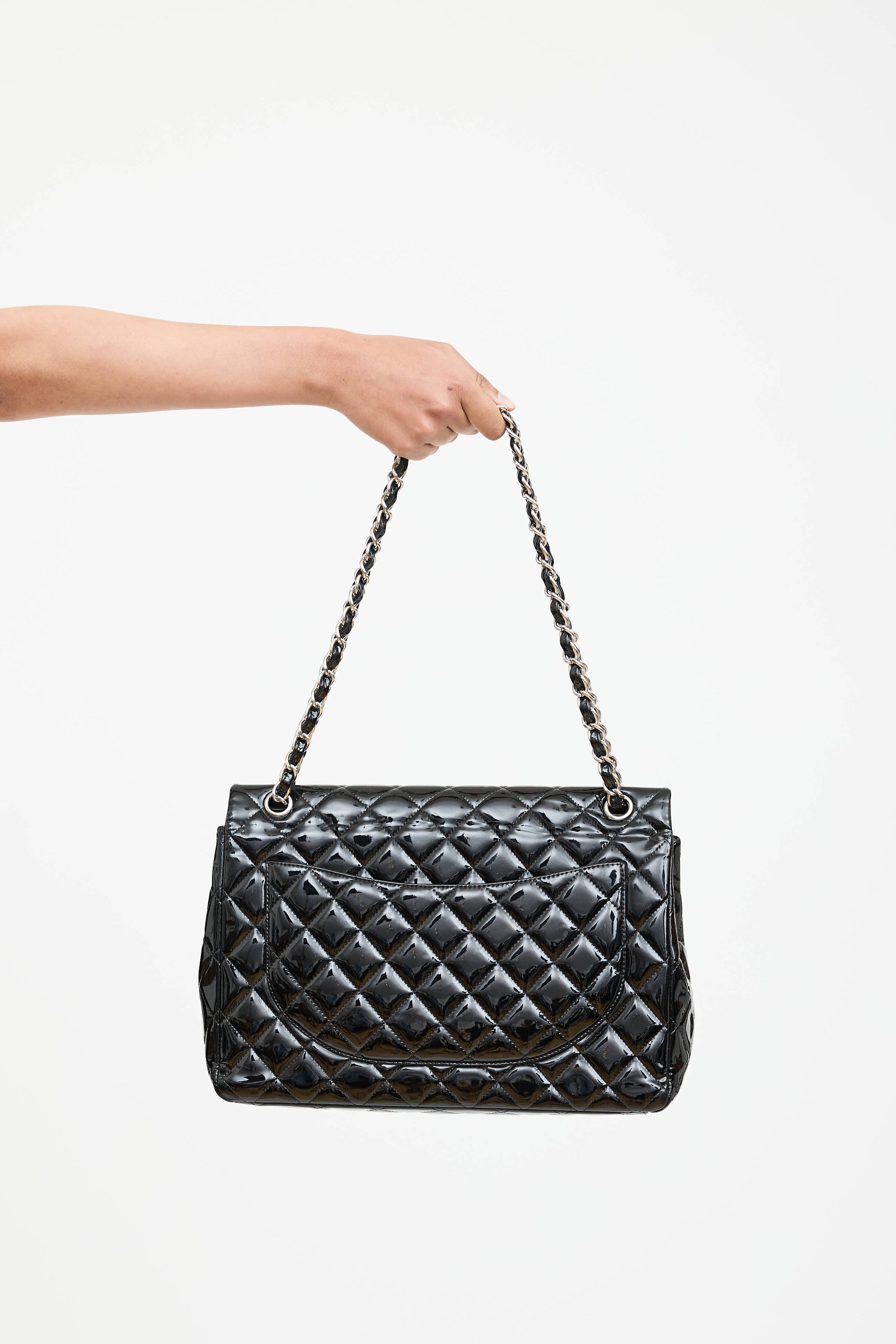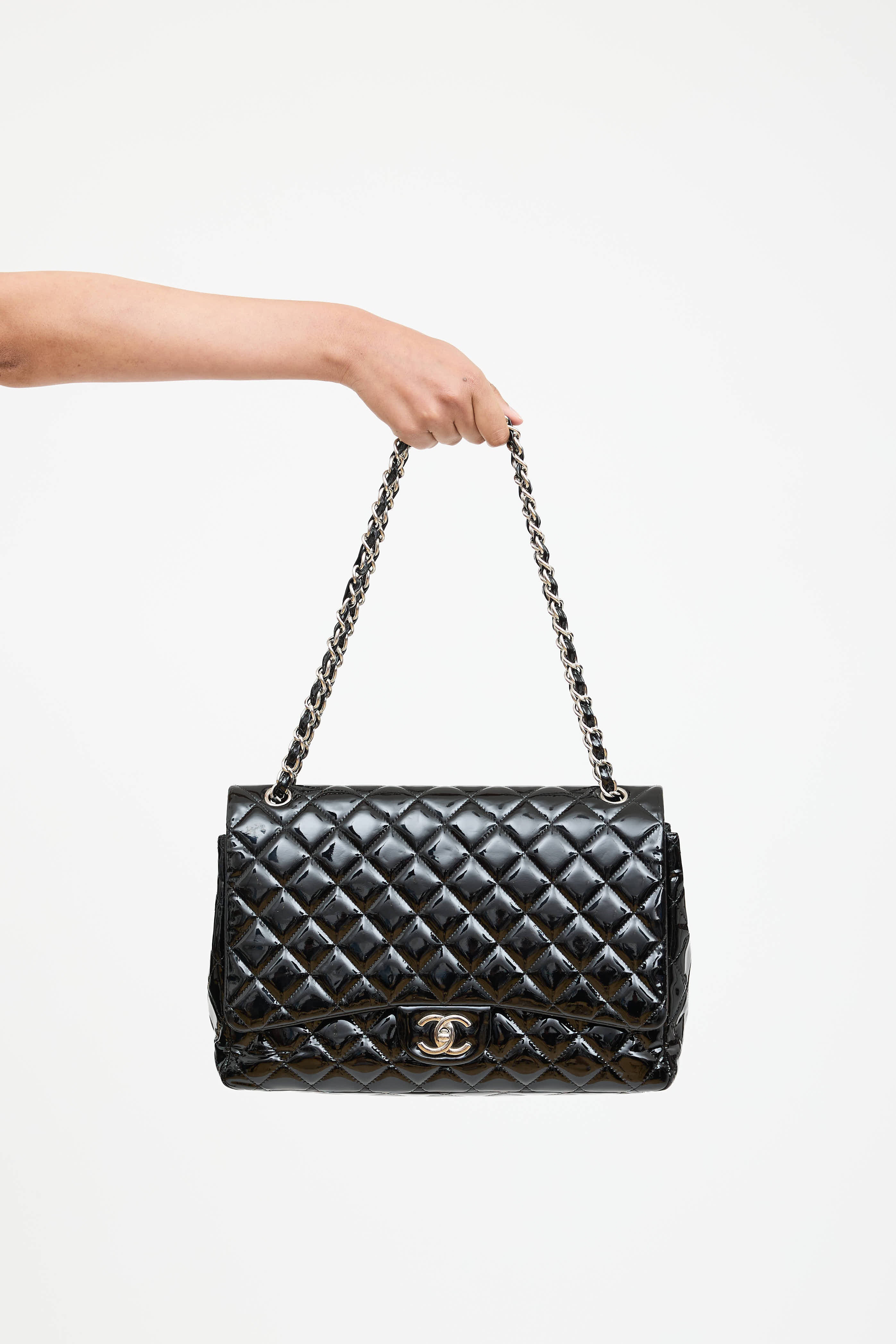 Pre-owned Chanel 15 series black Double Flap maxi bag in quilted patent leather featuring a top flap, one zip pocket under flap, one slip pocket at front, one main compartment with two slip pockets, braided leather and chain shoulder strap, one slip pocket at back, and silver tone CC logo turnlock closure. From the 2011 Collection by Karl Lagerfeld.