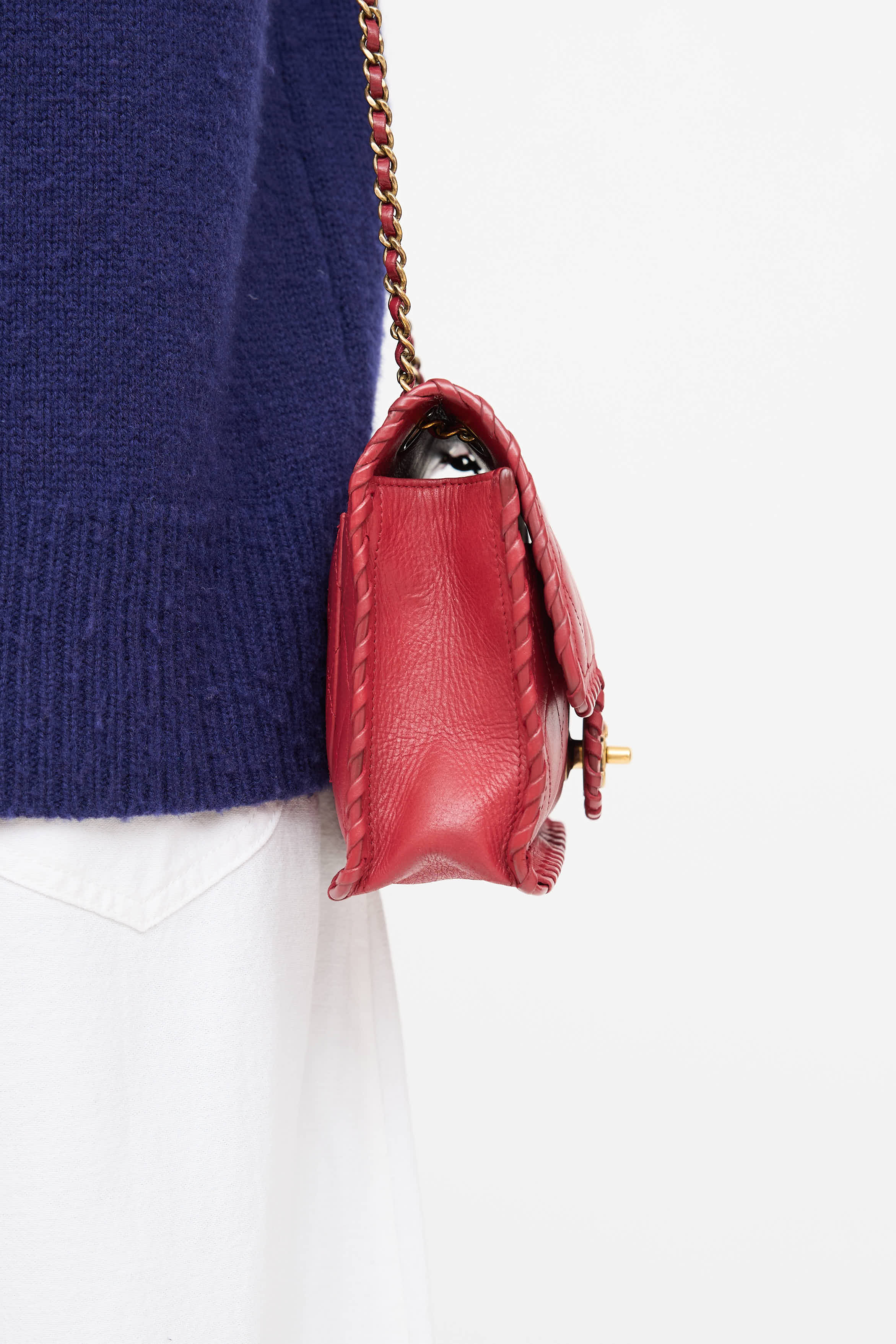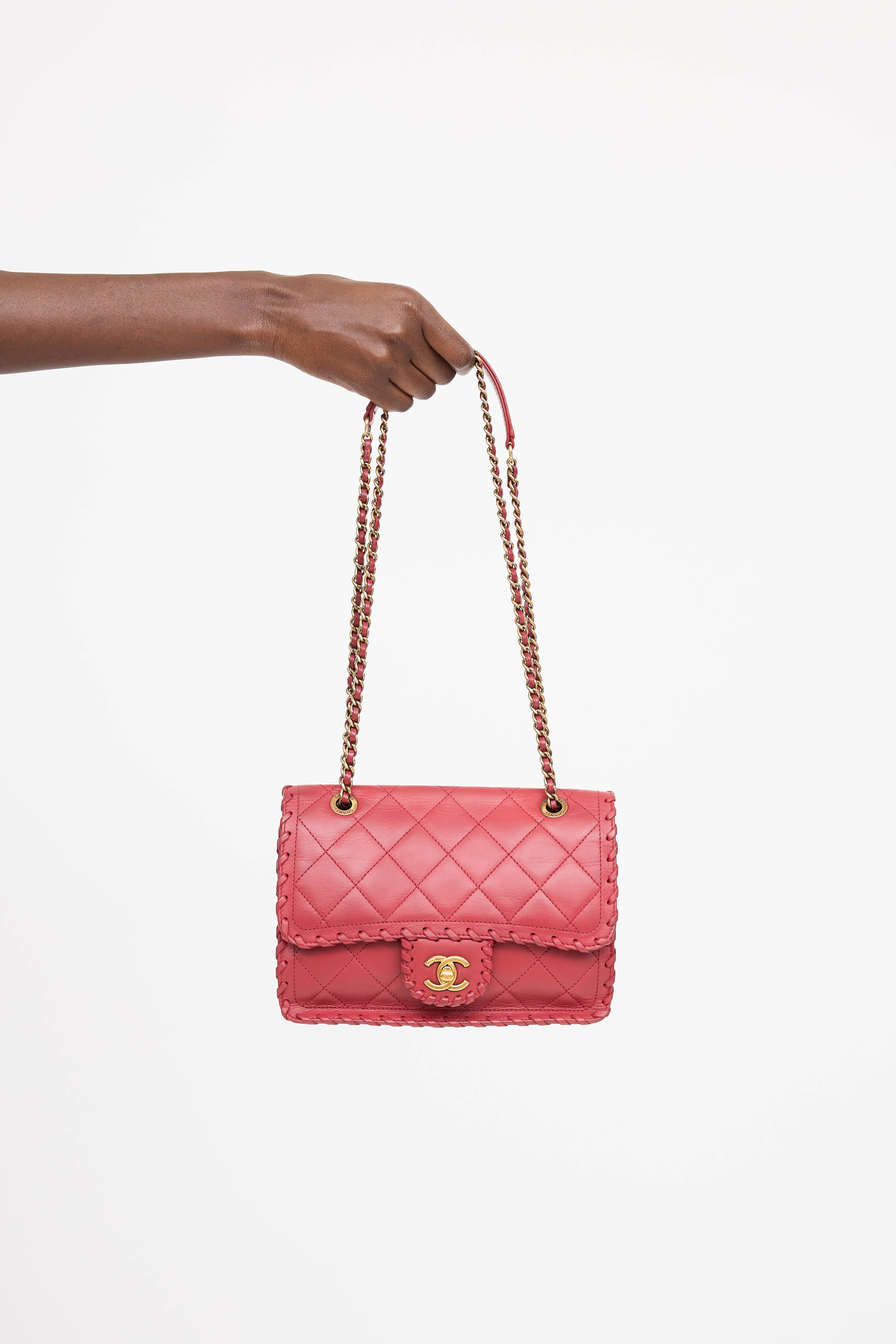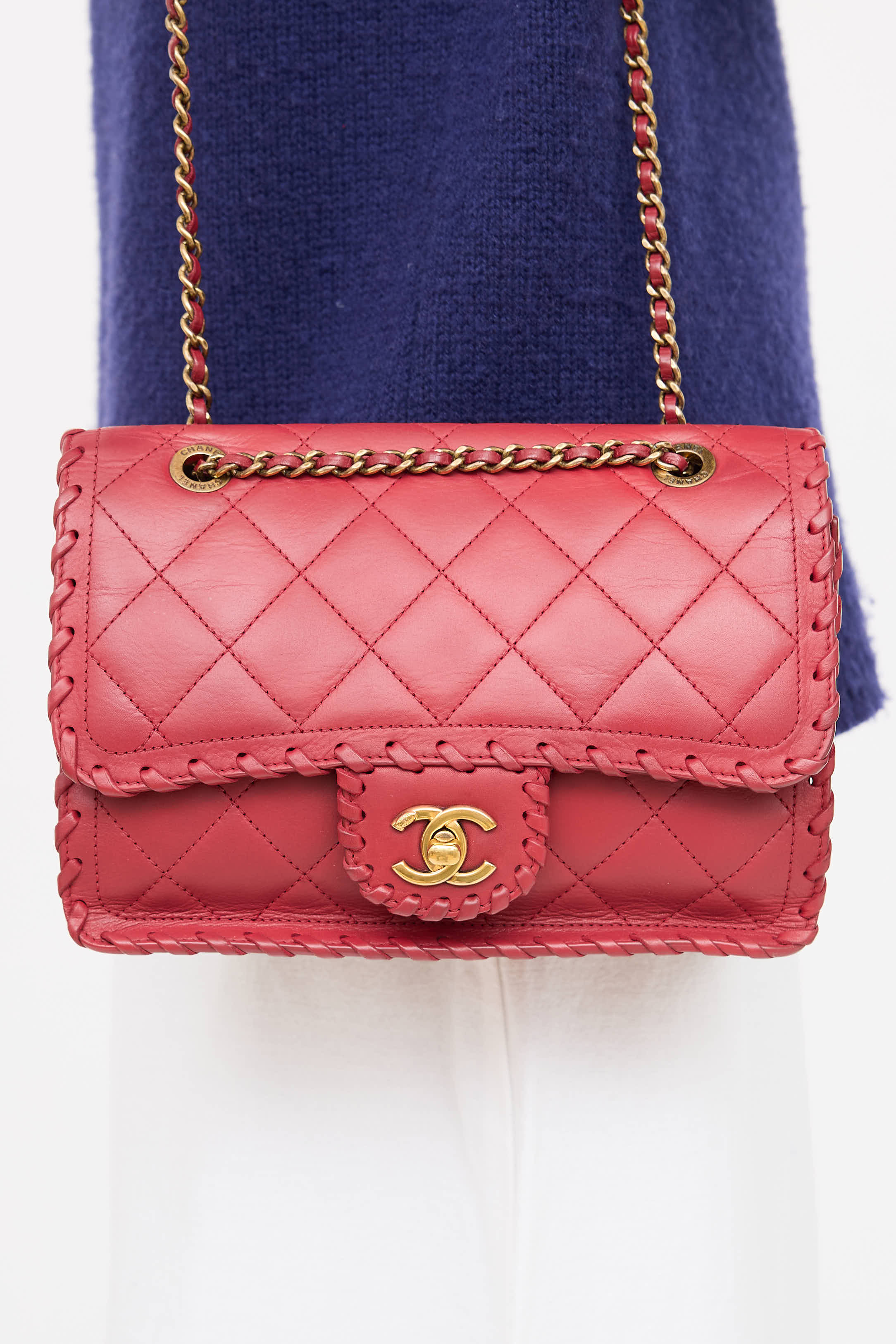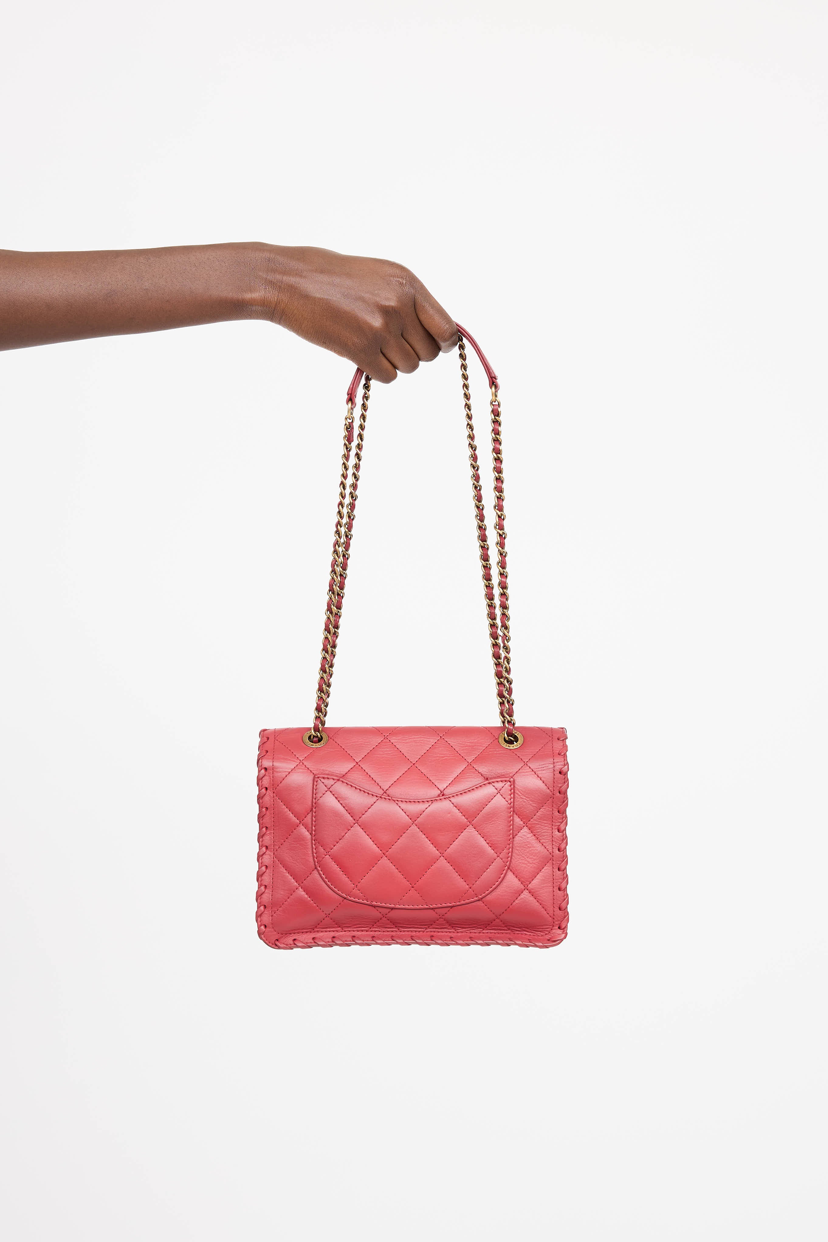 Pre-owned Chanel series 20 red Happy Stitch bag in quilted leather featuring a top flap, whip stitch detailing, one main compartment with one zip pocket, braided leather and chain shoulder strap, one slip pocket at face, one slip pocket at back, and gold tone CC logo twistlock closure. From the 2015 Collection by Karl Lagerfeld.