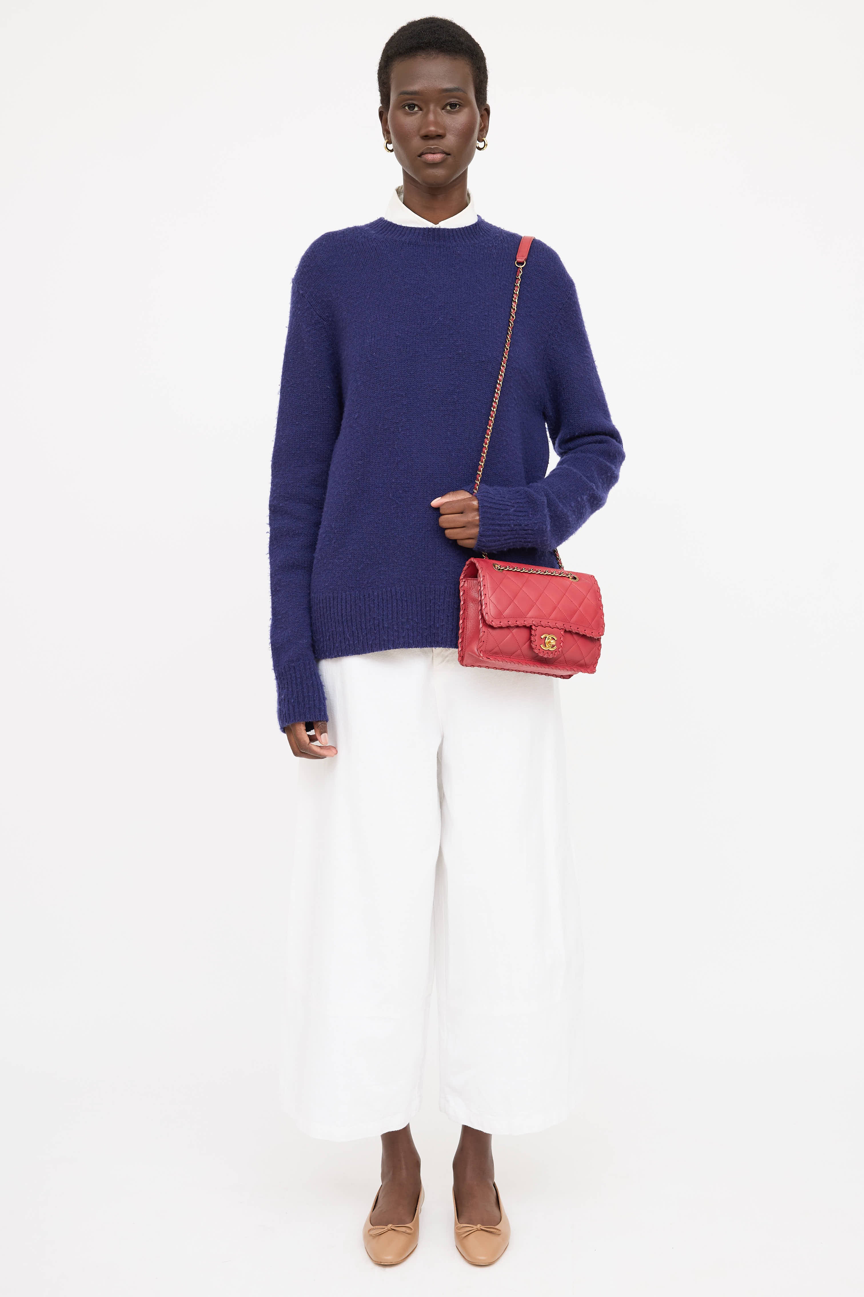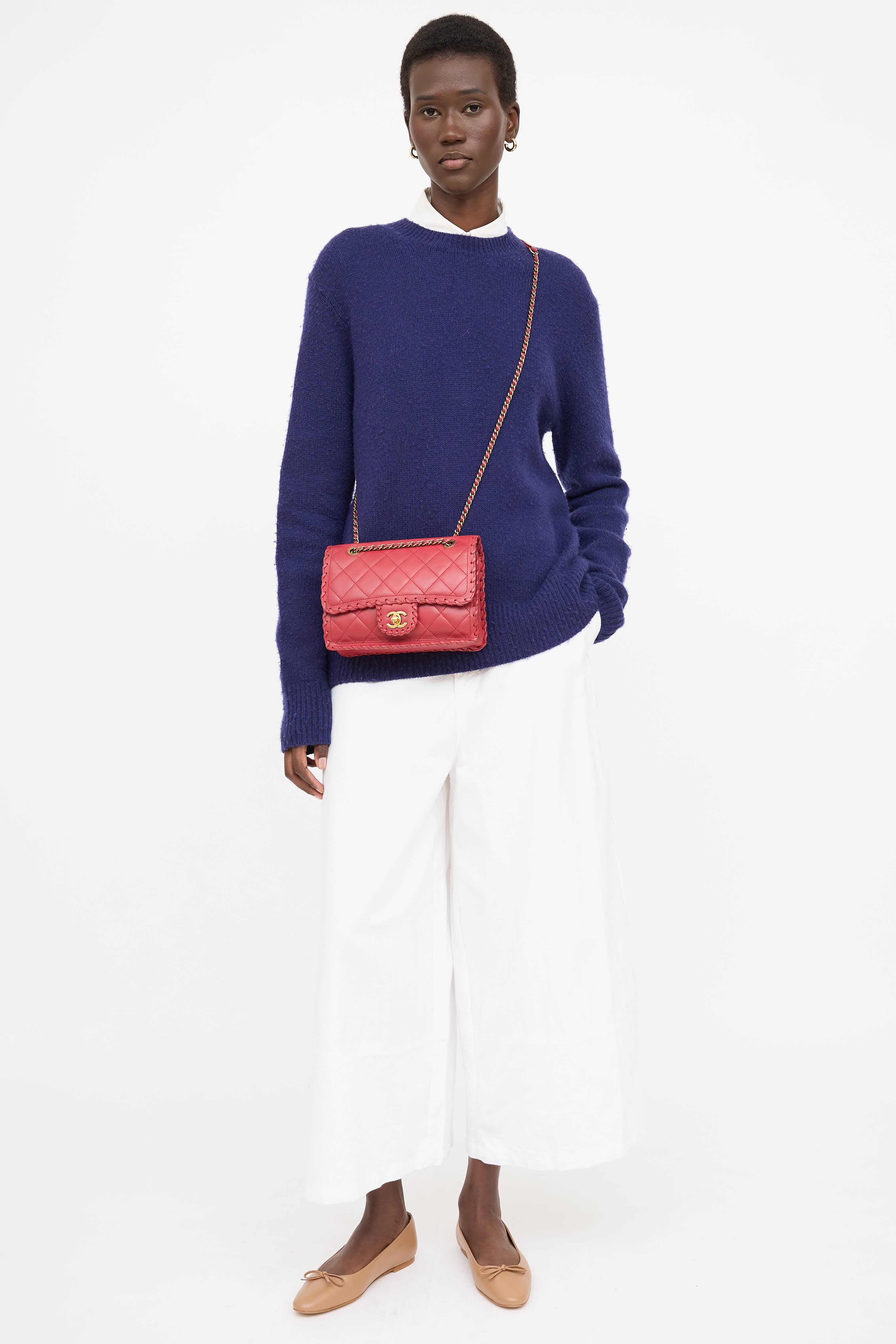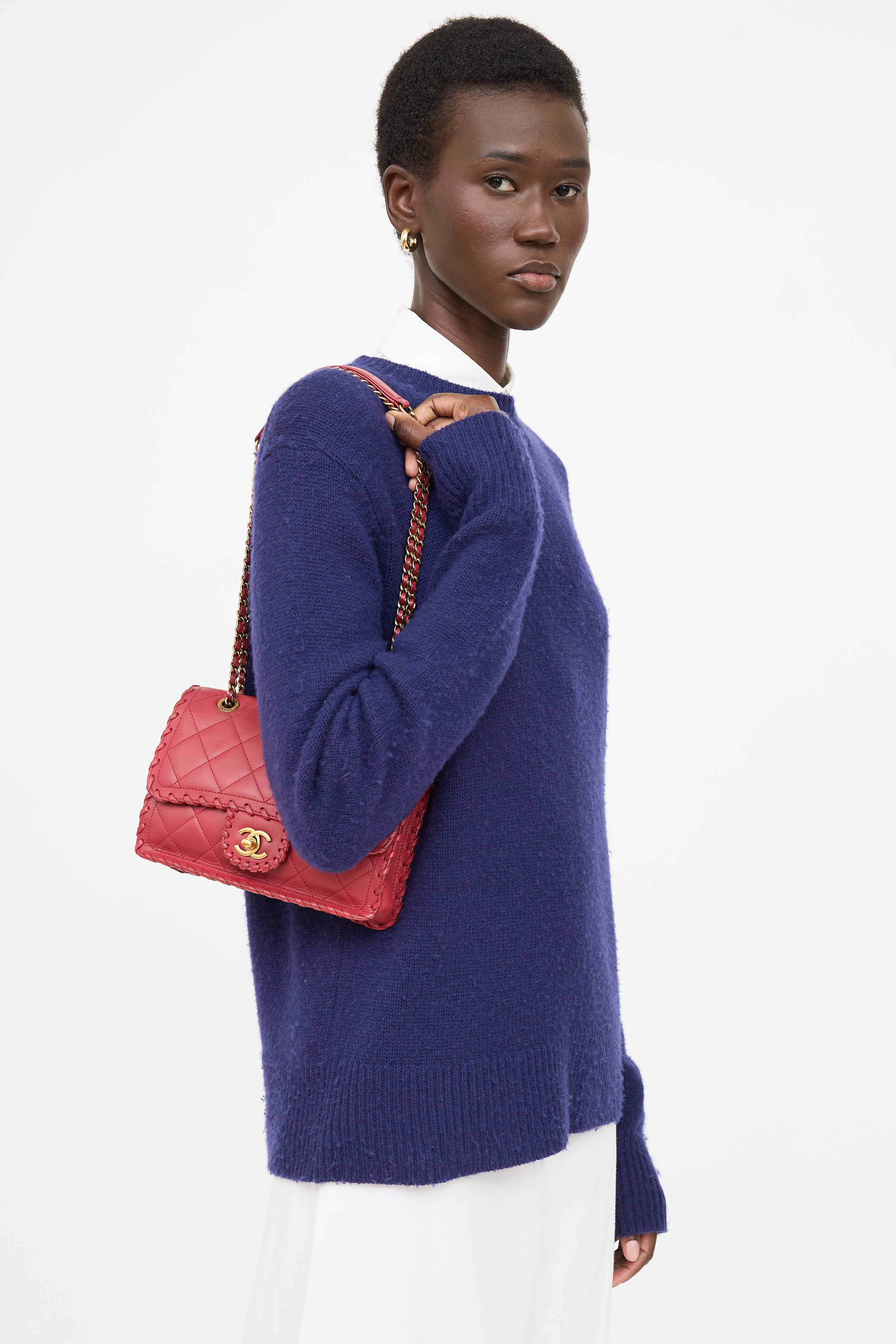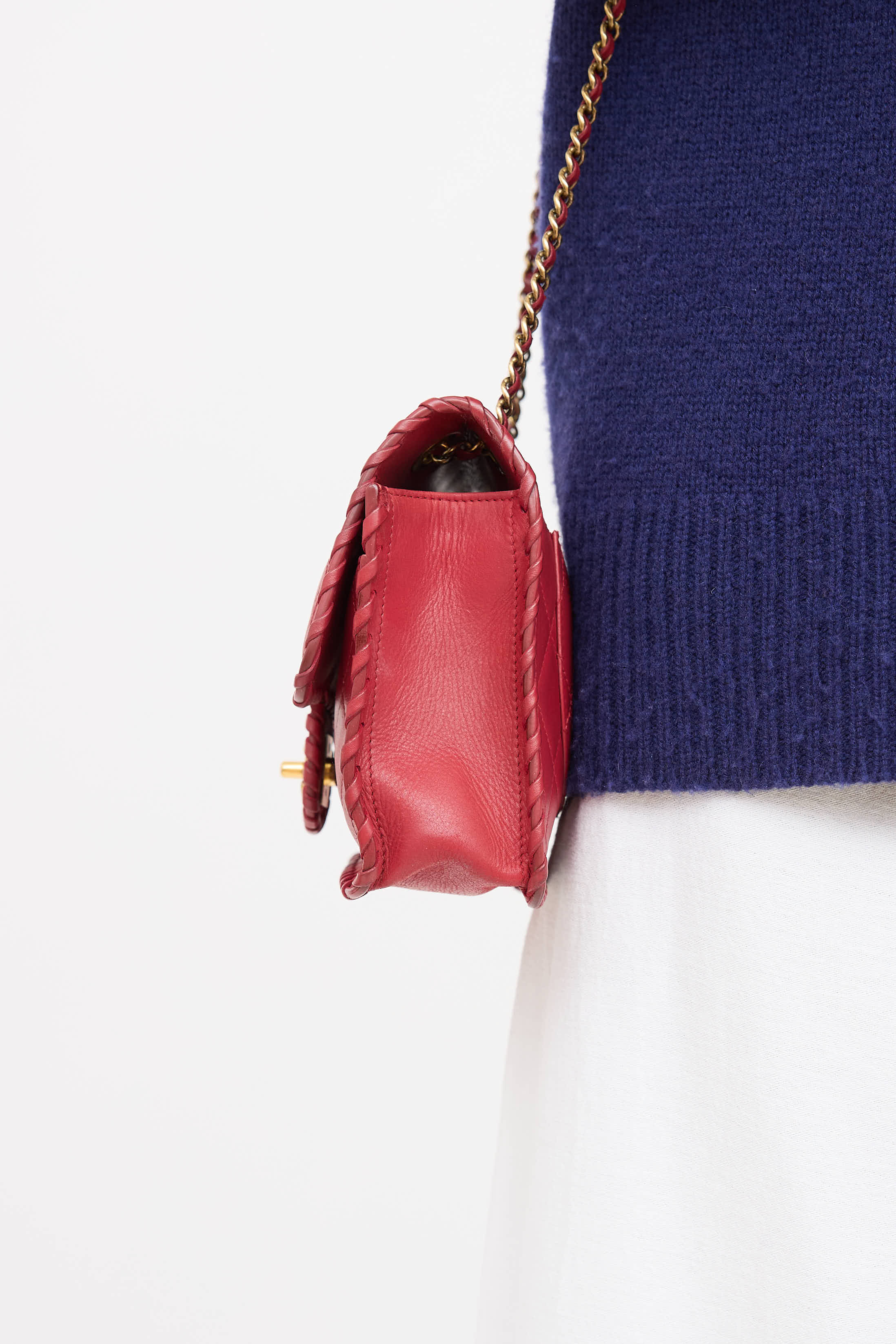 Pre-owned Chanel series 20 red Happy Stitch bag in quilted leather featuring a top flap, whip stitch detailing, one main compartment with one zip pocket, braided leather and chain shoulder strap, one slip pocket at face, one slip pocket at back, and gold tone CC logo twistlock closure. From the 2015 Collection by Karl Lagerfeld.