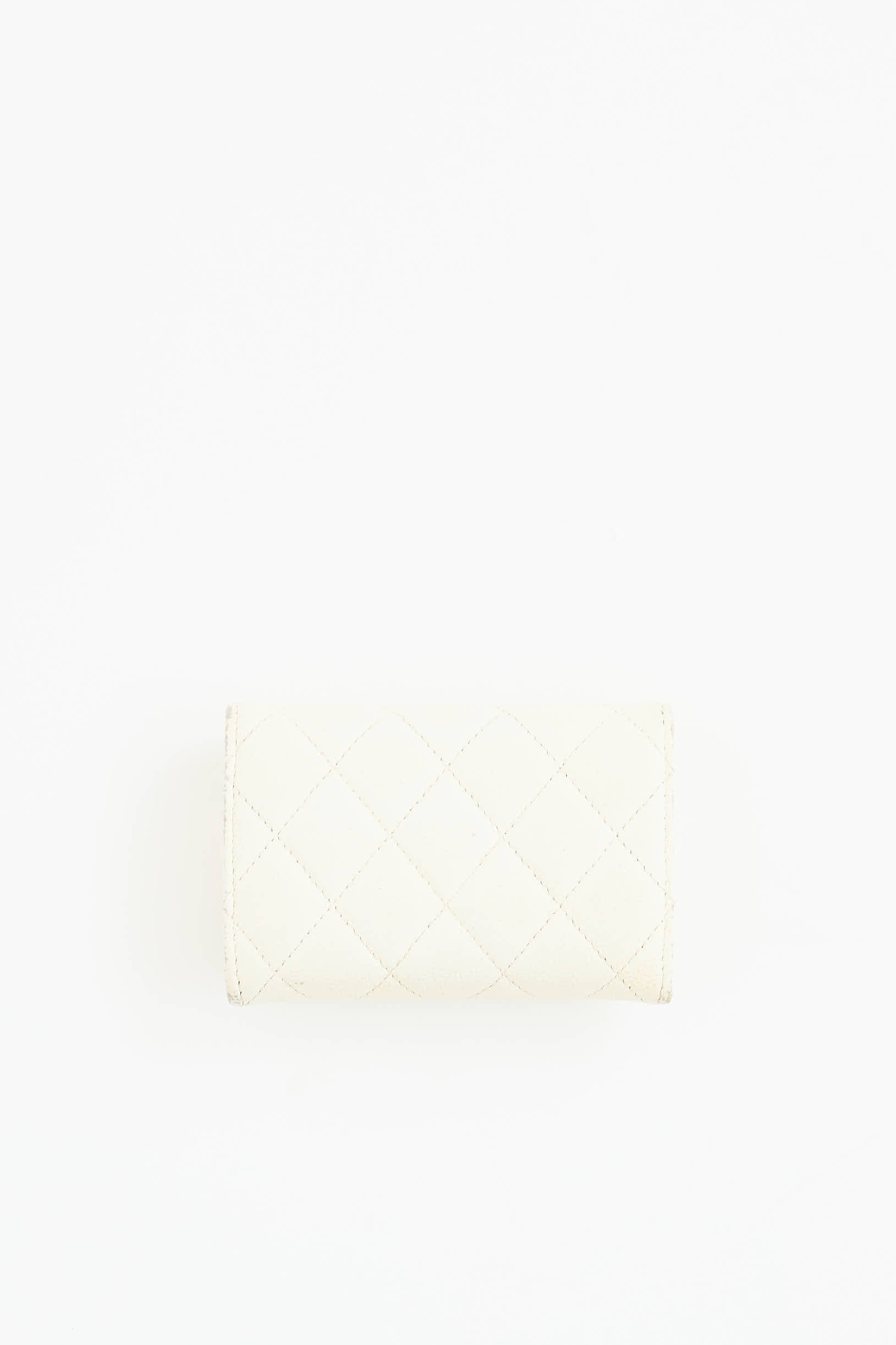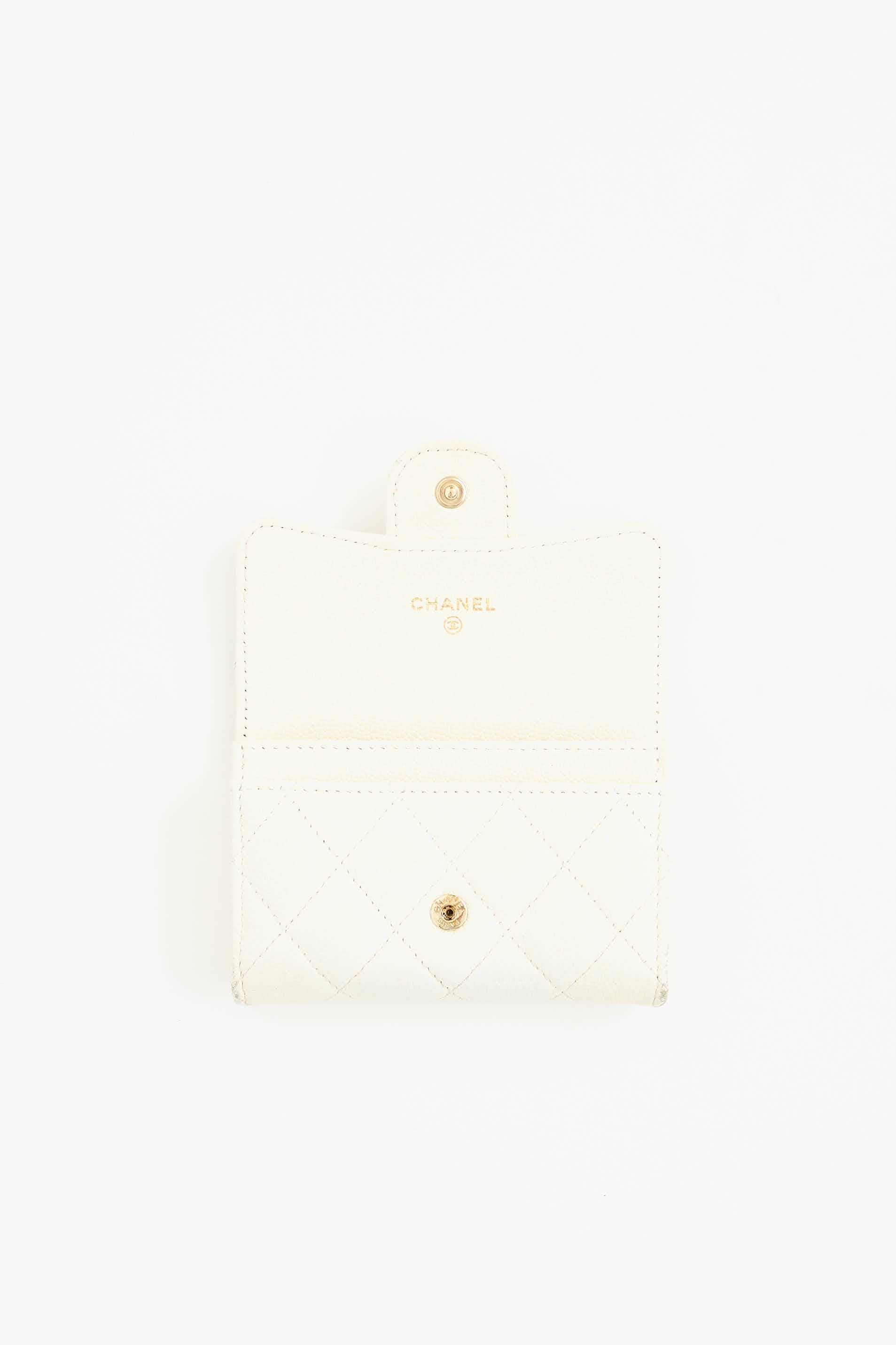Pre-owned Chanel white Caviar cardholder featuring quilted caviar leather, gold tone hardware, top flap with CC logo hardware at front, snap button closure, and one main compartment with one interior slip pocket.