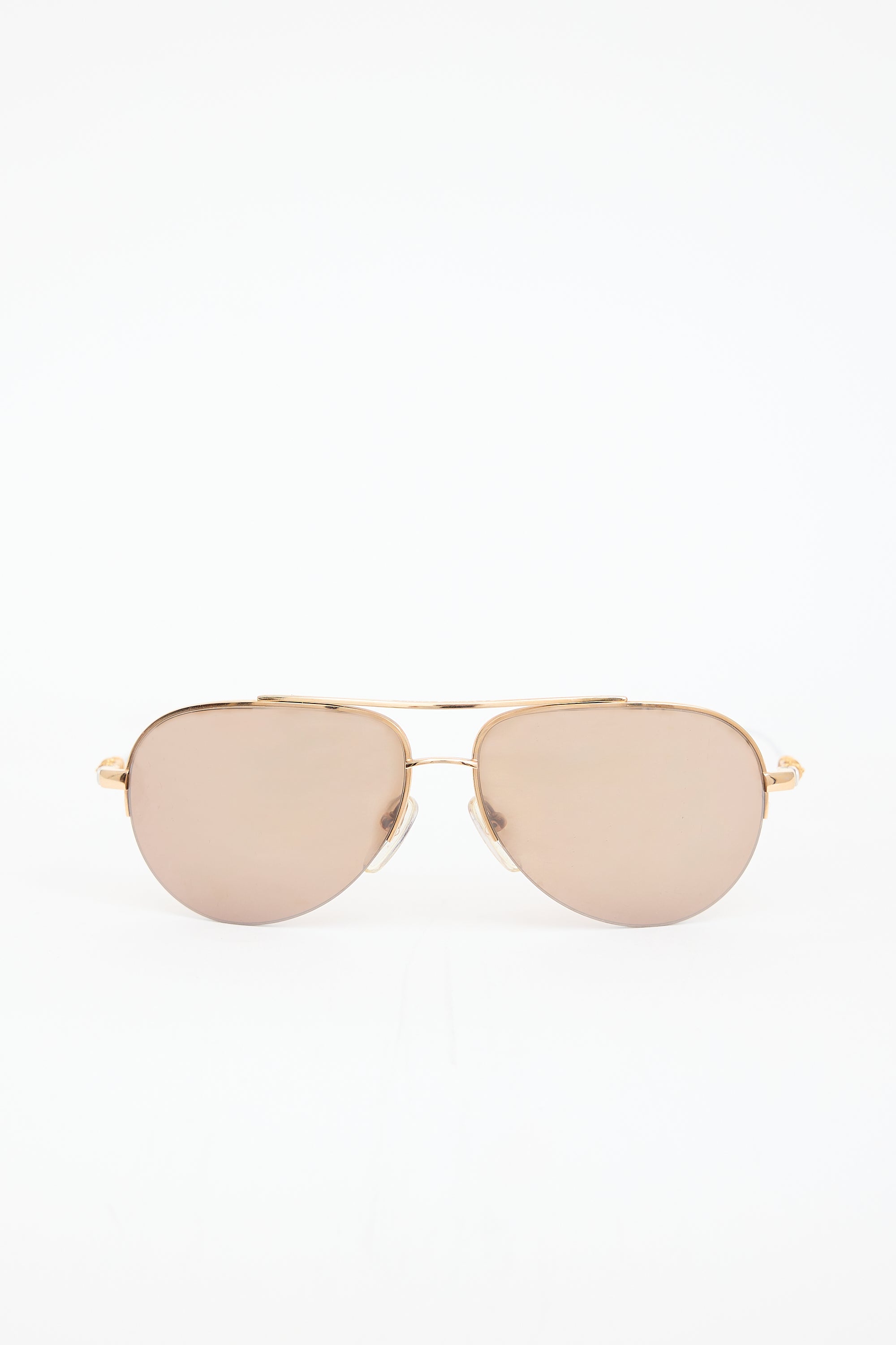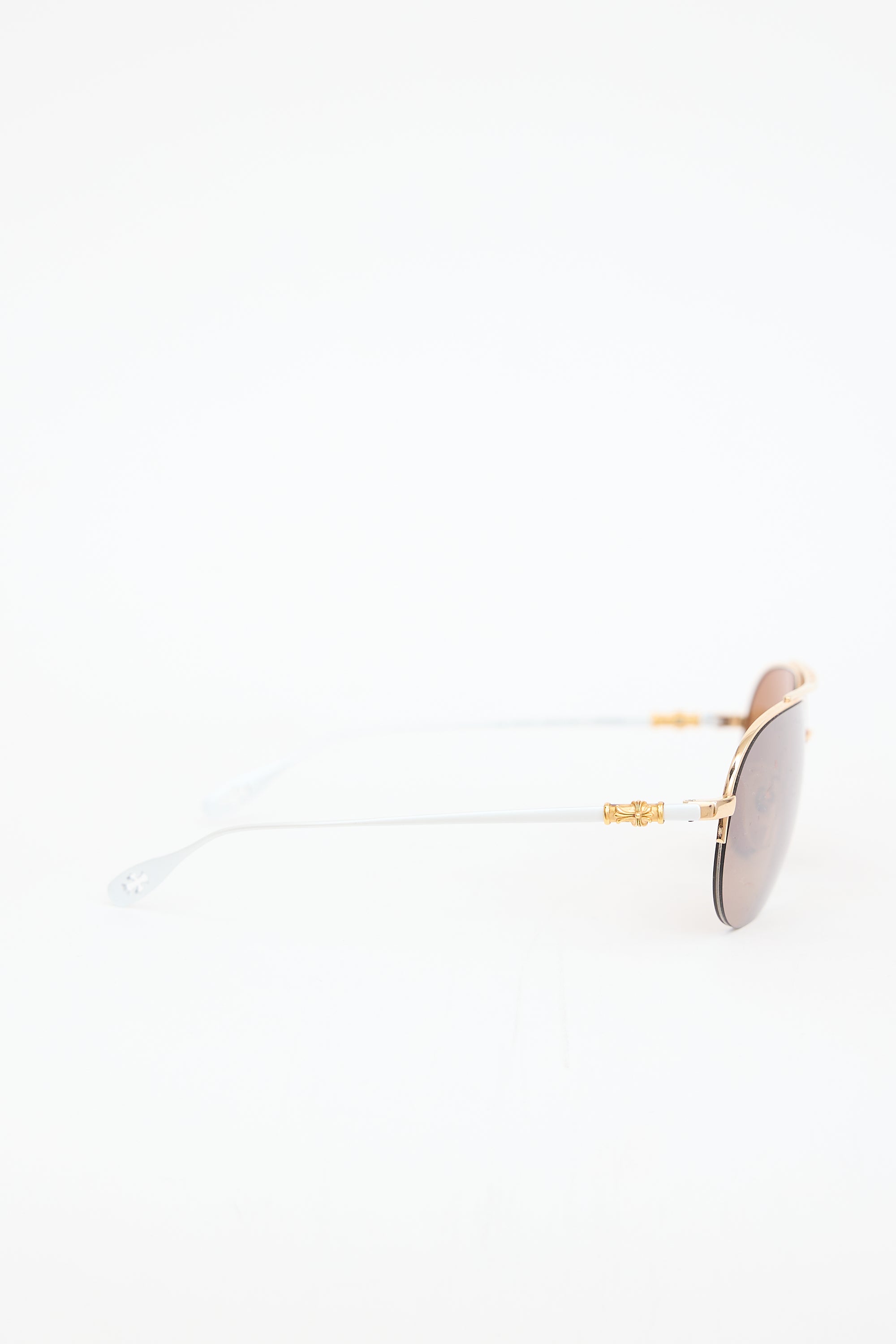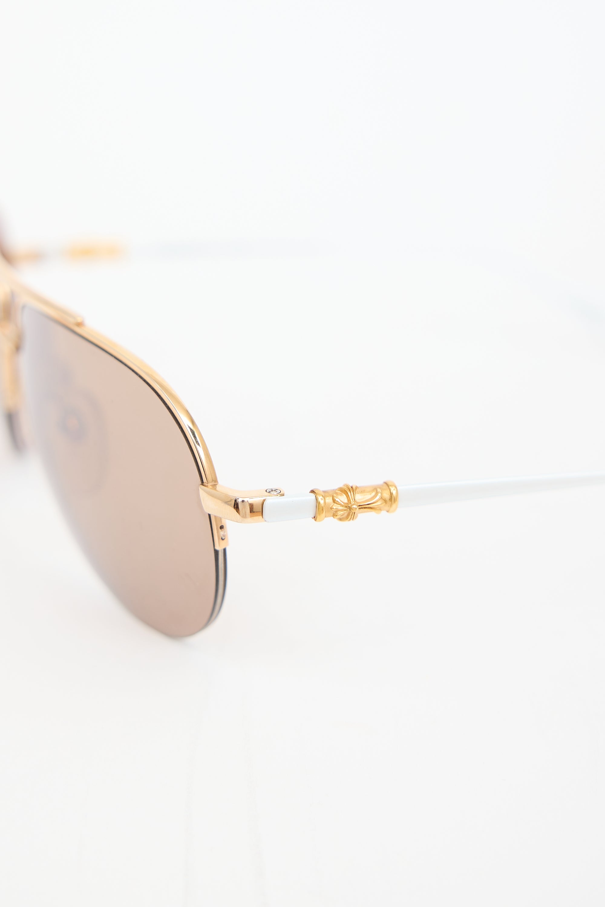 Pre-owned Chrome Hearts gold and white Stains sunglasses featuring brown tinted lenses, nose pad bridge, wire aviator frame, gold tone cross embellishment at temples, and cross cut outs at ends. Comes with original case and wipe cloth.