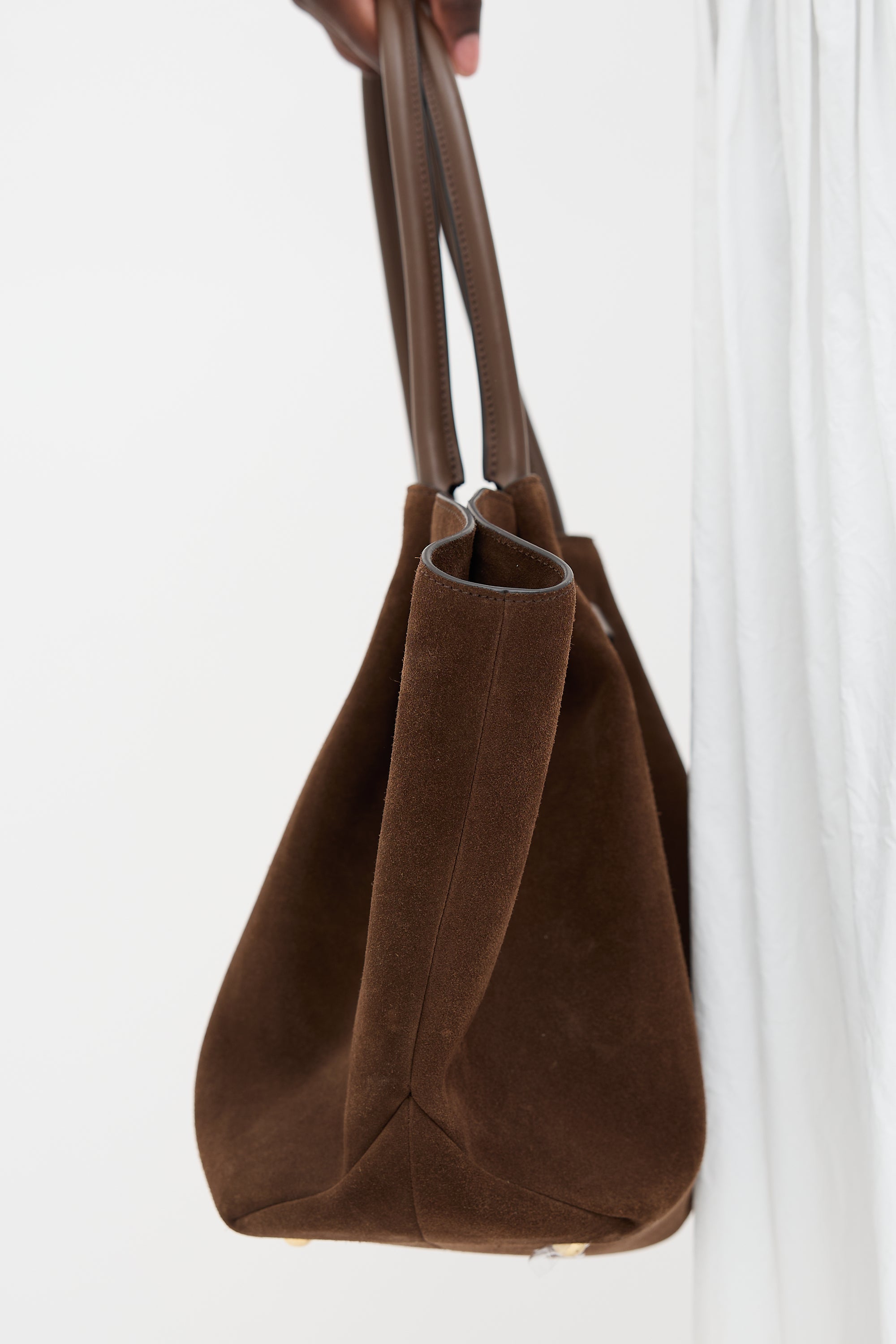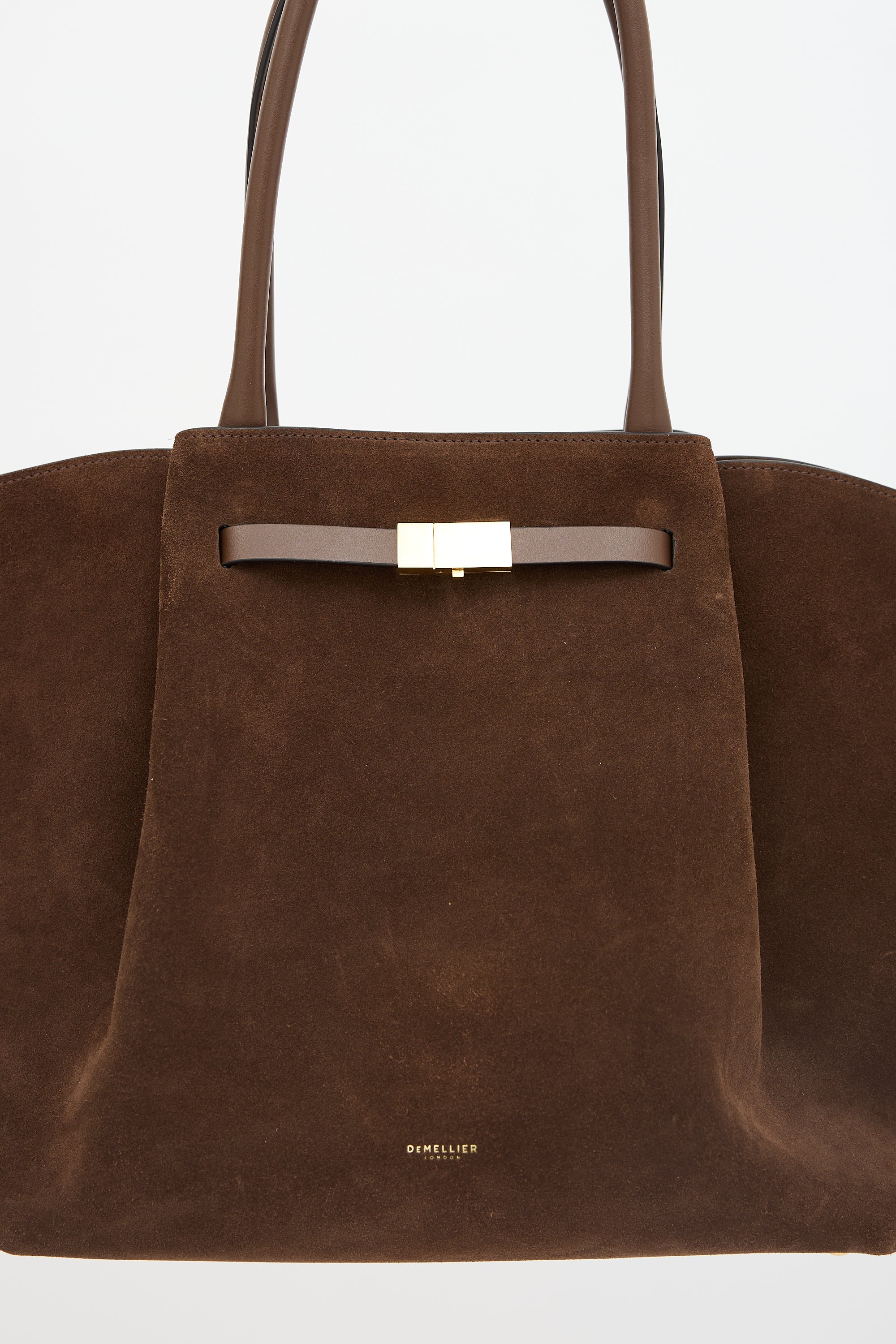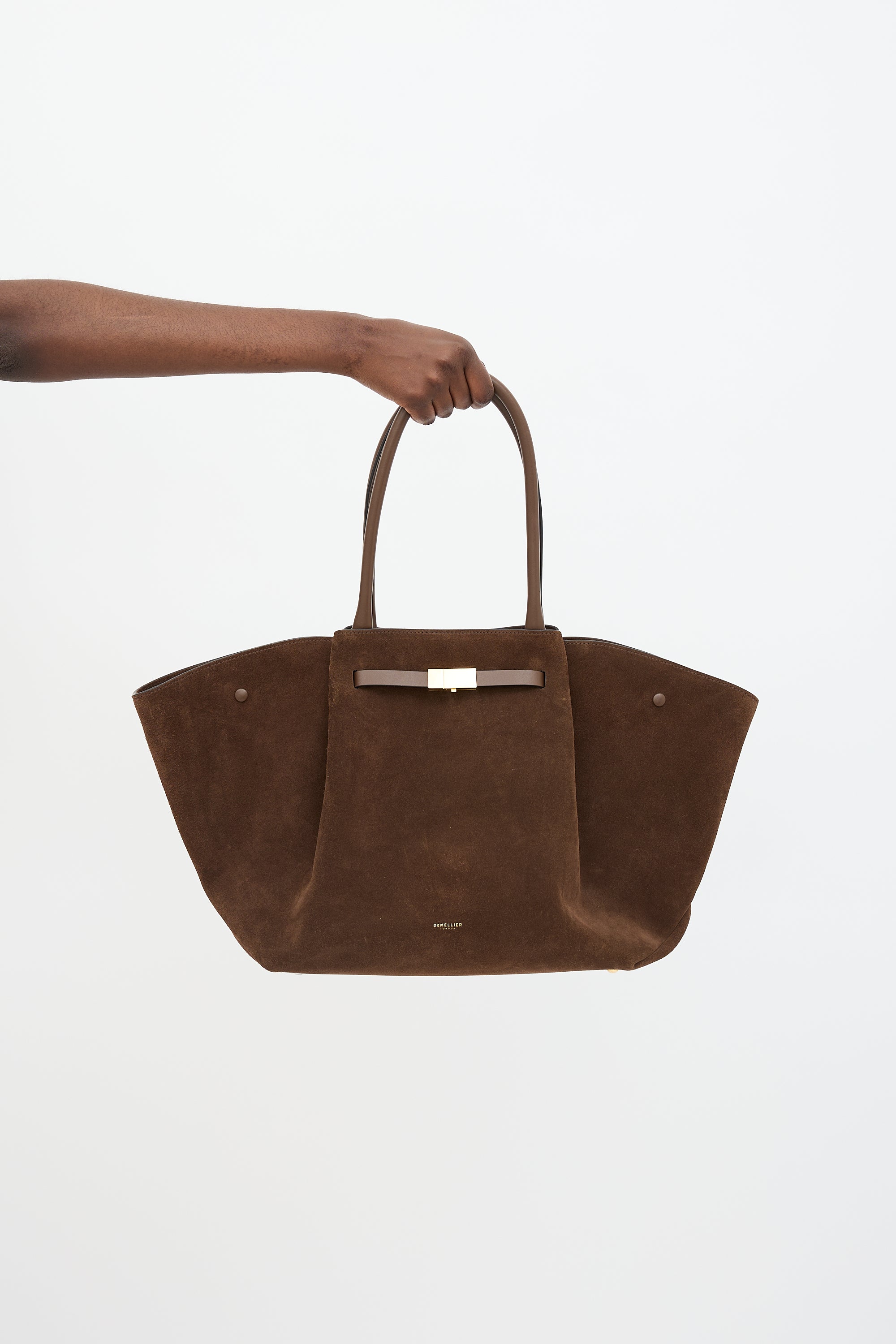 Pre-owned DeMellier brown suede New York tote bag featuring gold tone hardware, gold stamped logo at front face, dual rolled leather top handles, pleated front and back, protective feet at base, open top with snap closures, and one lined main compartment with one zip pockets and one slip pocket.