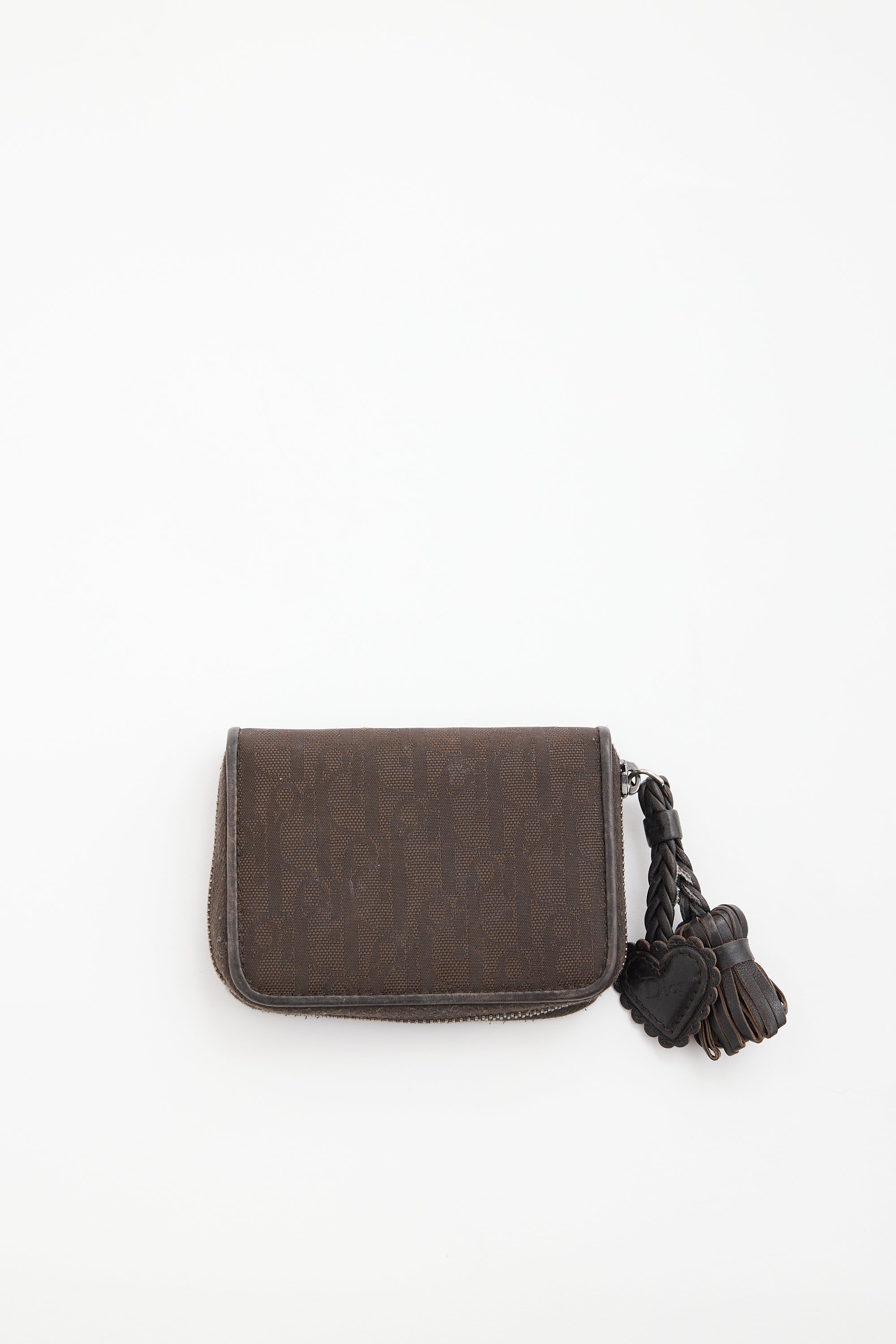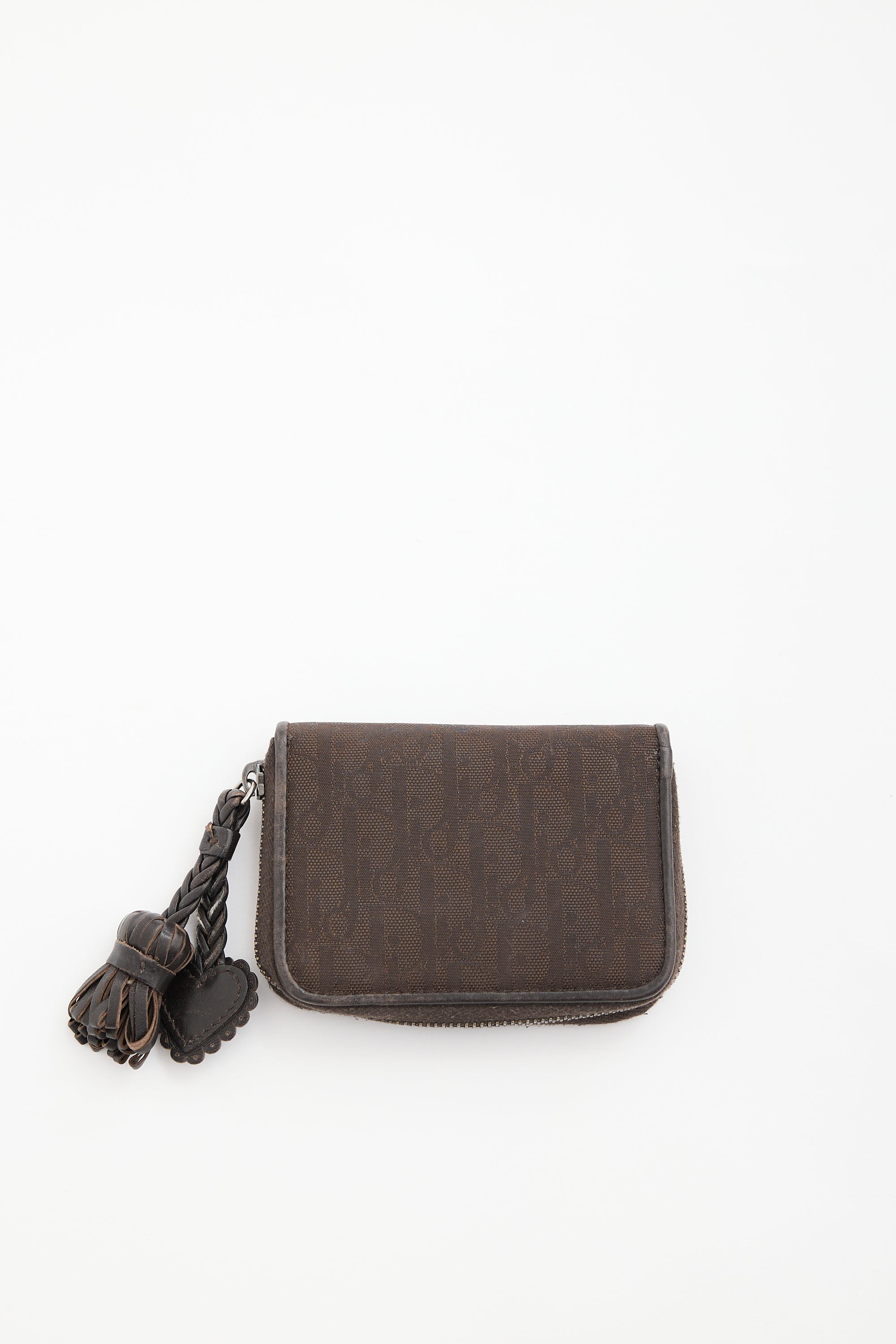 Pre-owned Dior 2007 brown mini wallet featuring oblique canvas and leather, zip around closure with braided tassel and heart motif pull tabs, and two main compartments with four card slots.