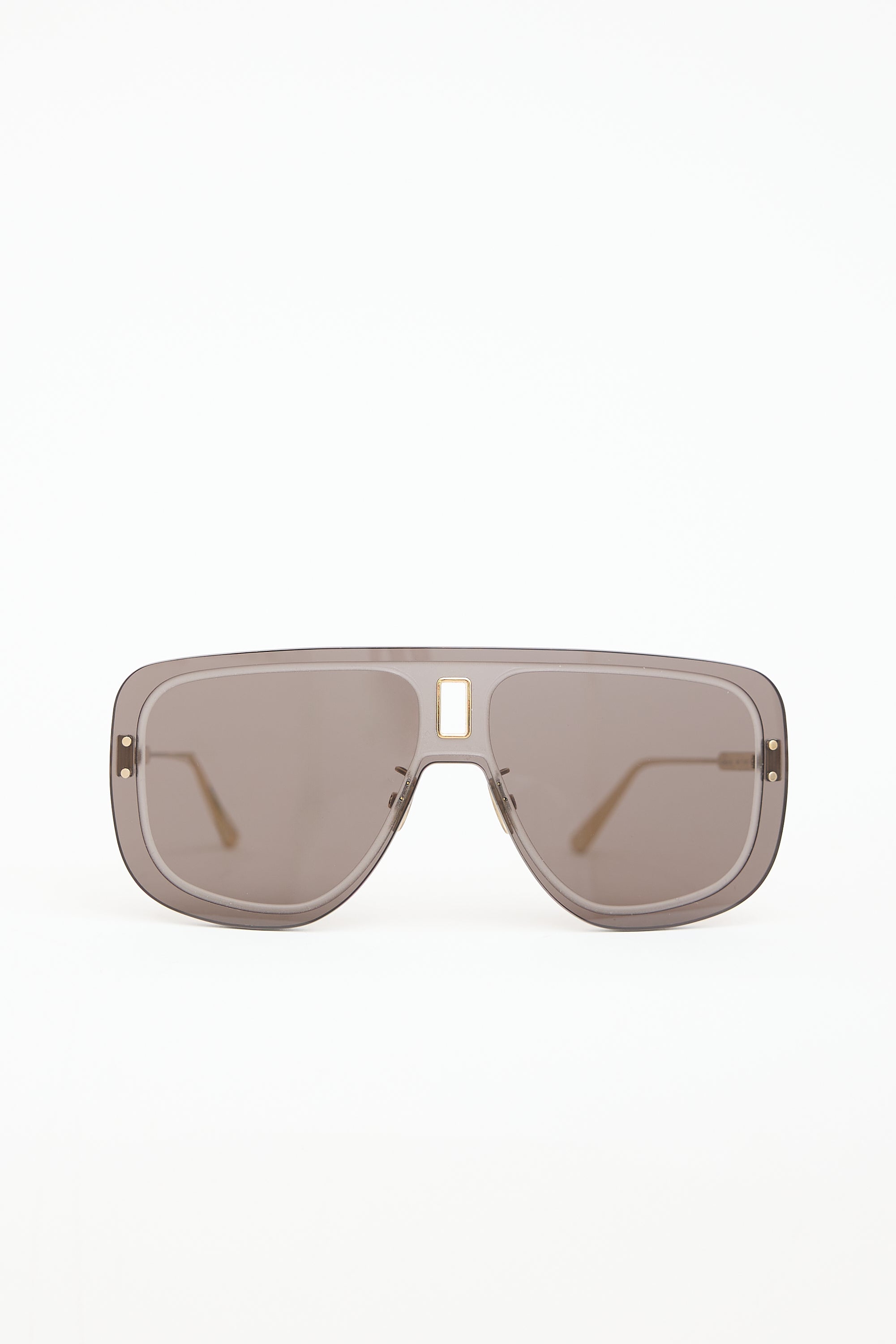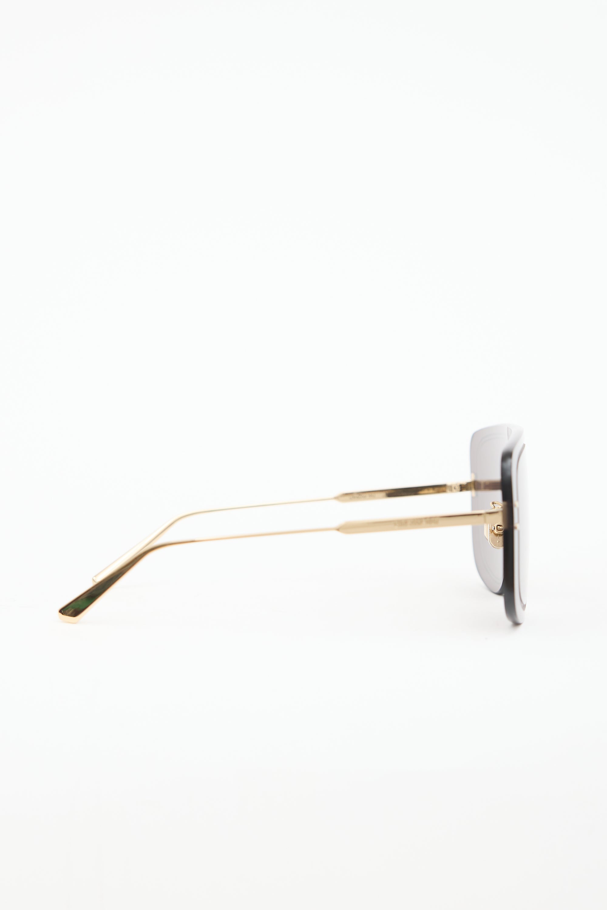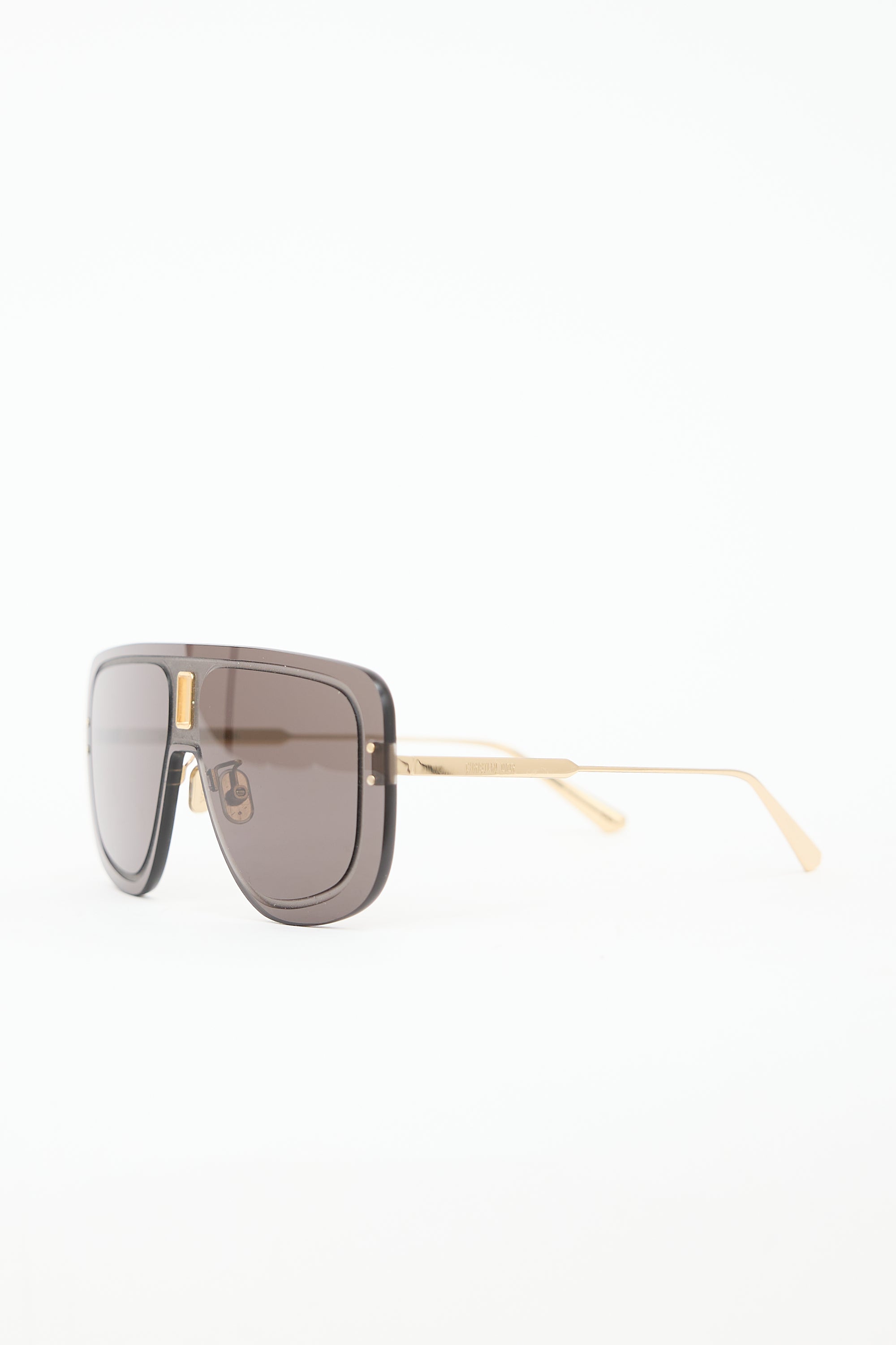 Pre-owned Christian Dior gold B0A0 UltraDior MU sunglasses featuring grey tinted lenses with cutout detail, aviator frame, nose pad bridge, and debossed logo at temples. Comes with original box, pouch, and wipe cloth.
