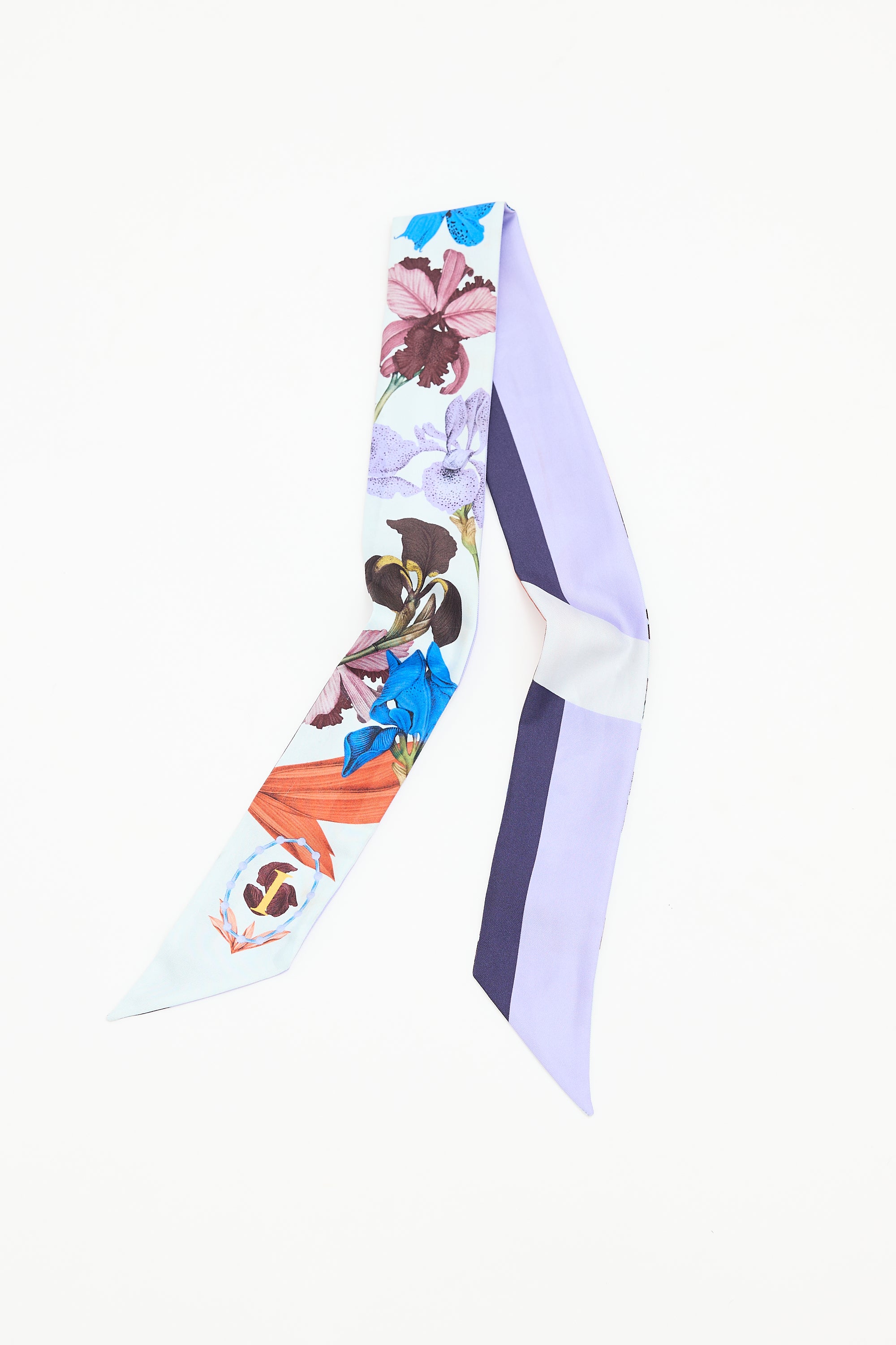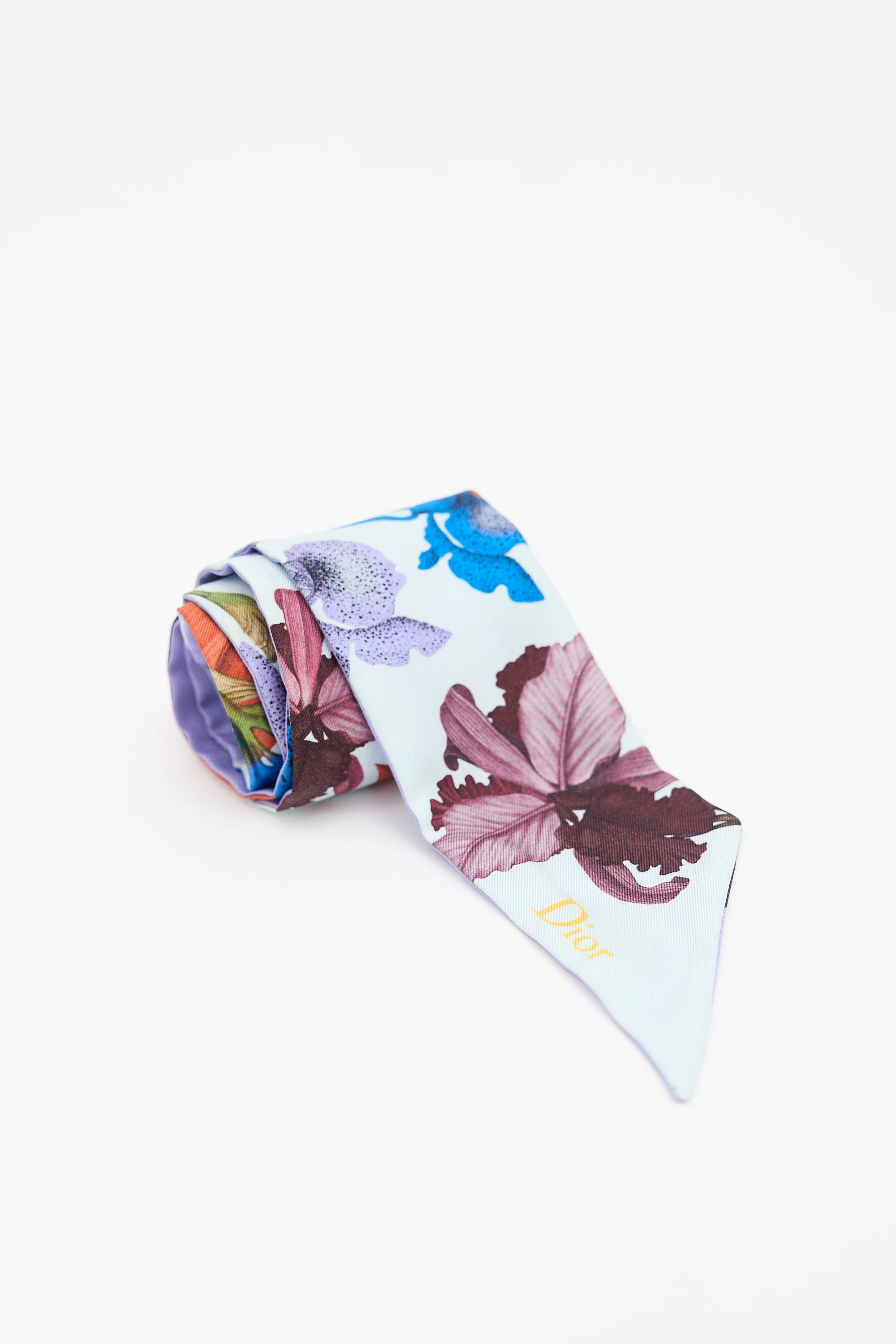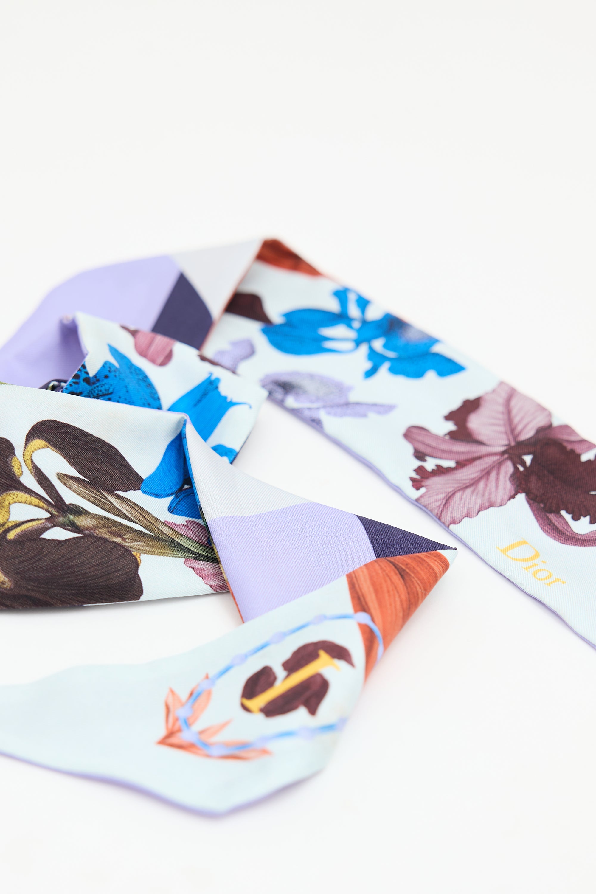 Pre-owned Dior ABCDior 'I' for Iris light blue, purple, and multicolour silk Mitzah twill scarf featuring floral print, "I" at one end, wordmark logo at other end, and colour block reverse.