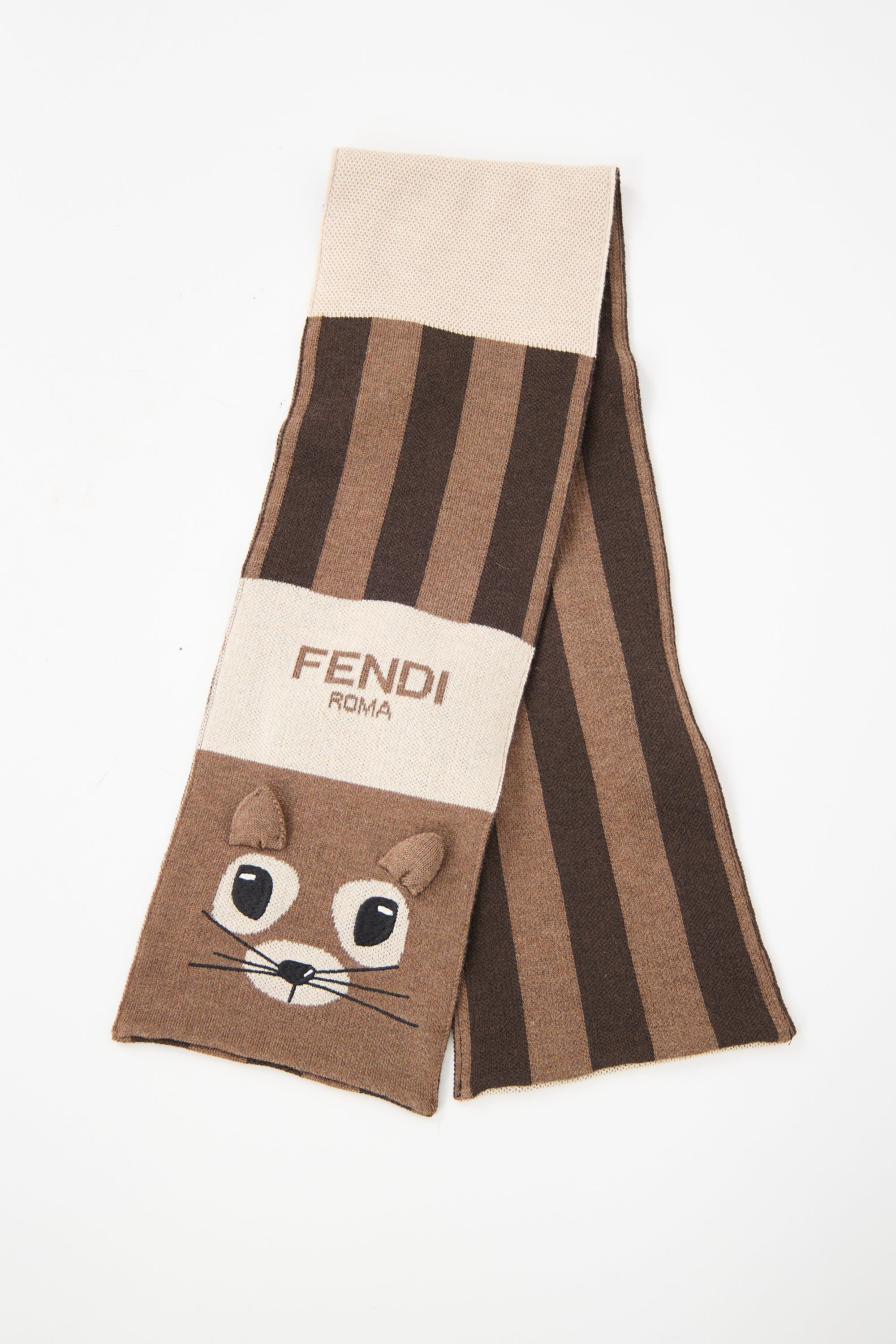 Pre-owned Fendi Kids brown wool knit scarf featuring bunny, bear, and squirrel embroidered panels, FF and logo intarsia, and tonal stripe pattern reverse.