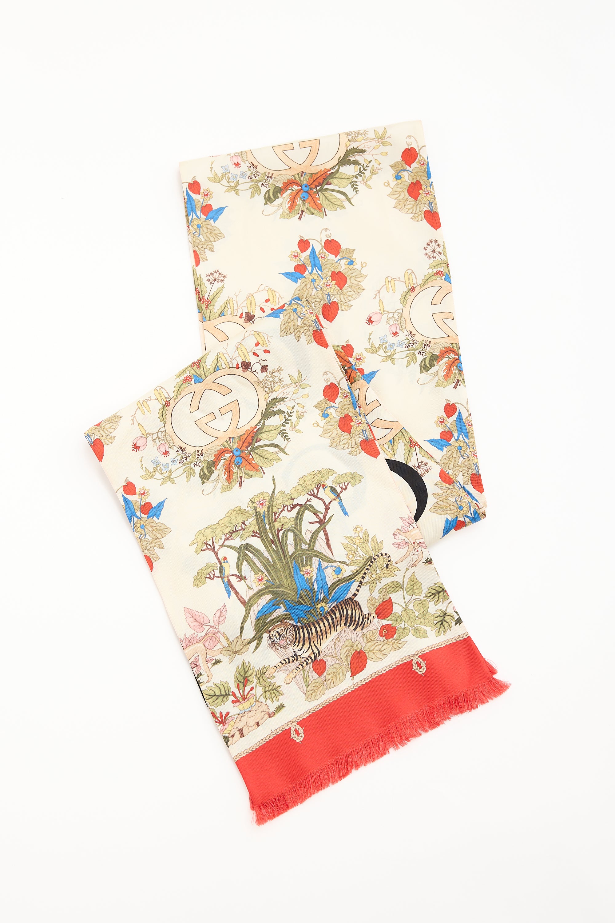 Pre-owned Gucci 100 cream scarf featuring multicolour floral and GG print, black Gucci 100 script printed at ends, and red fringe trim. Comes with original box.