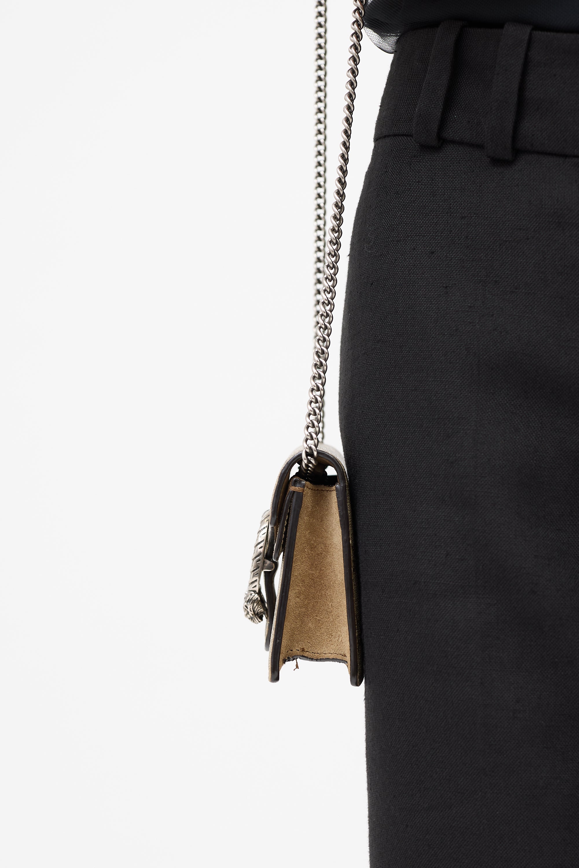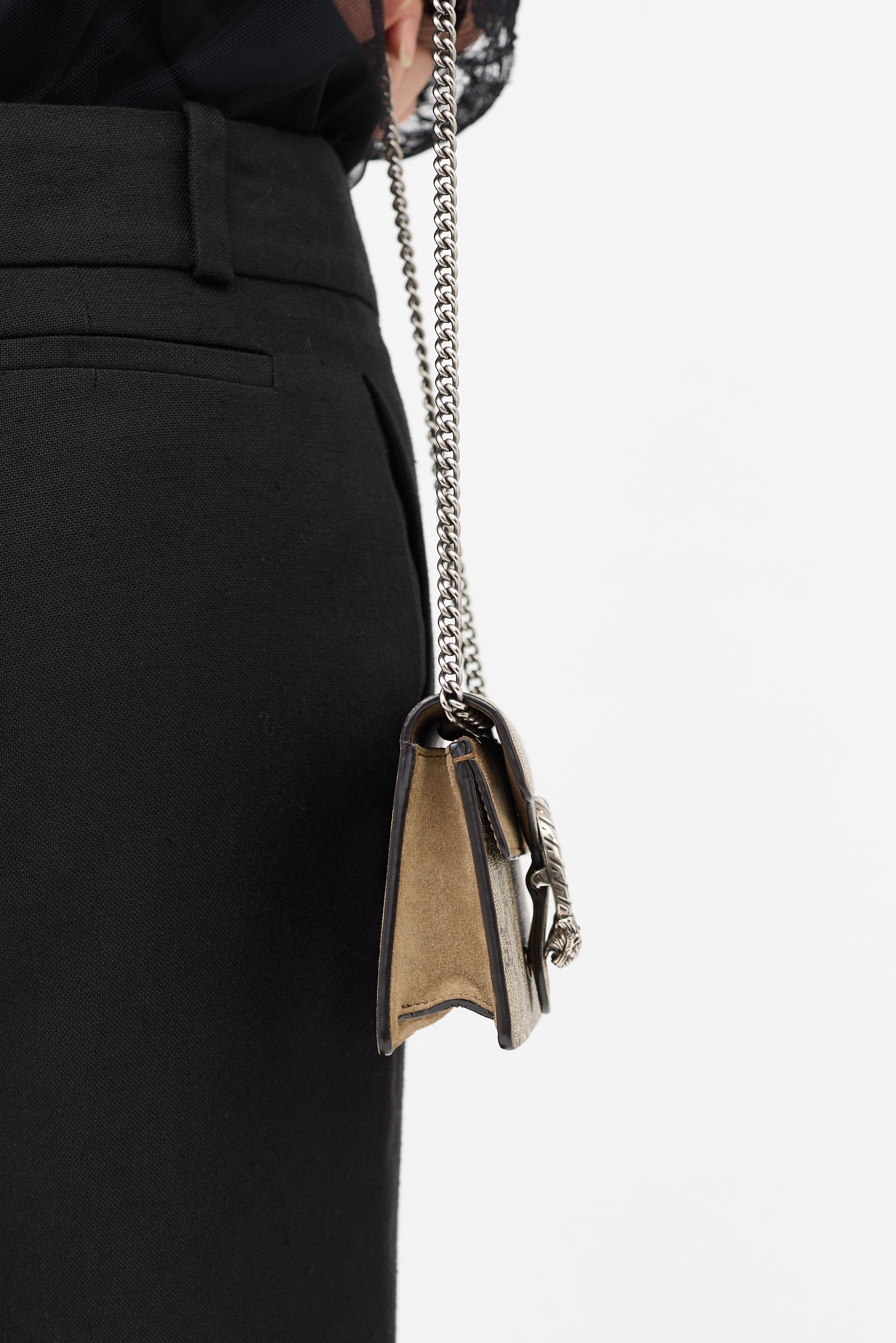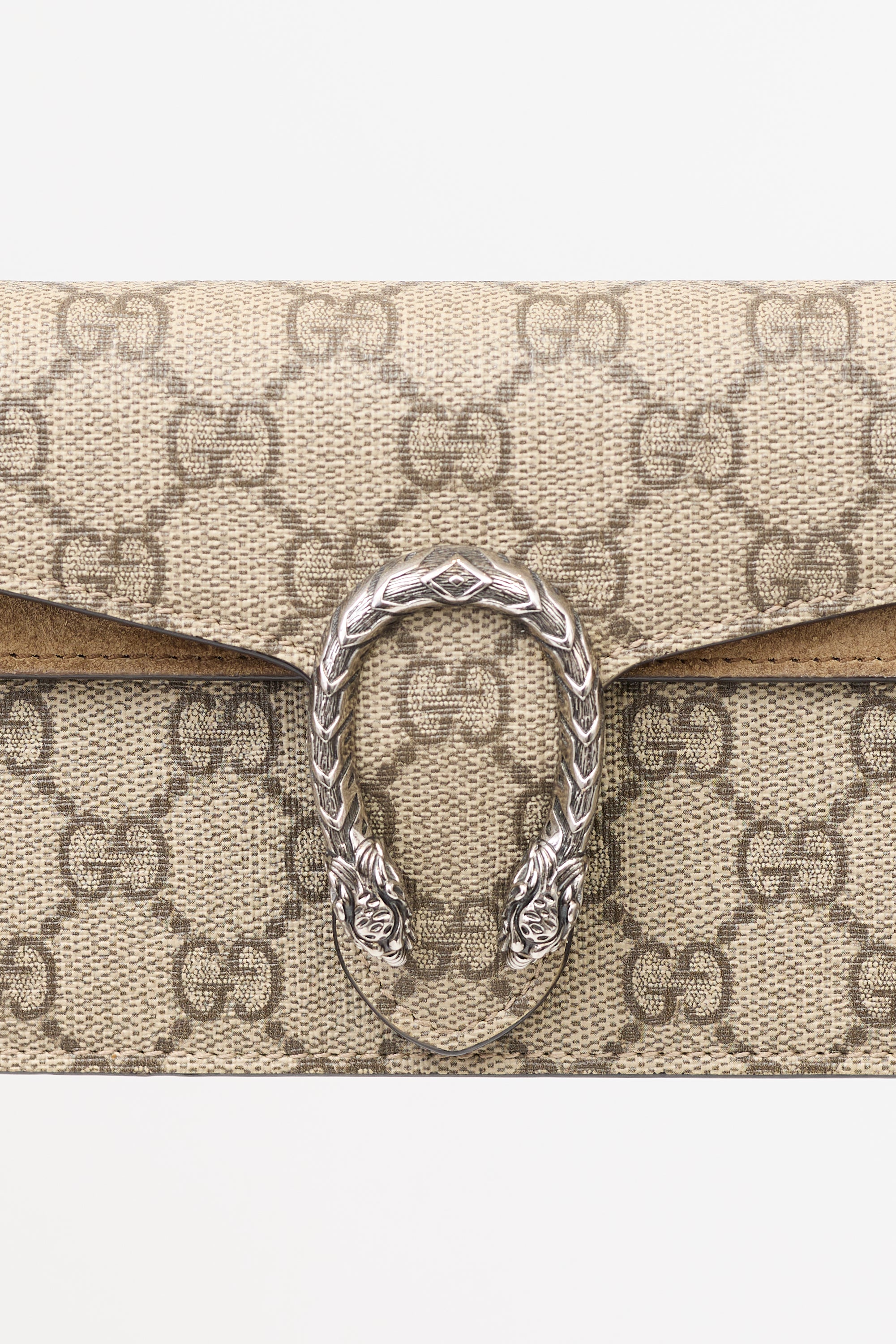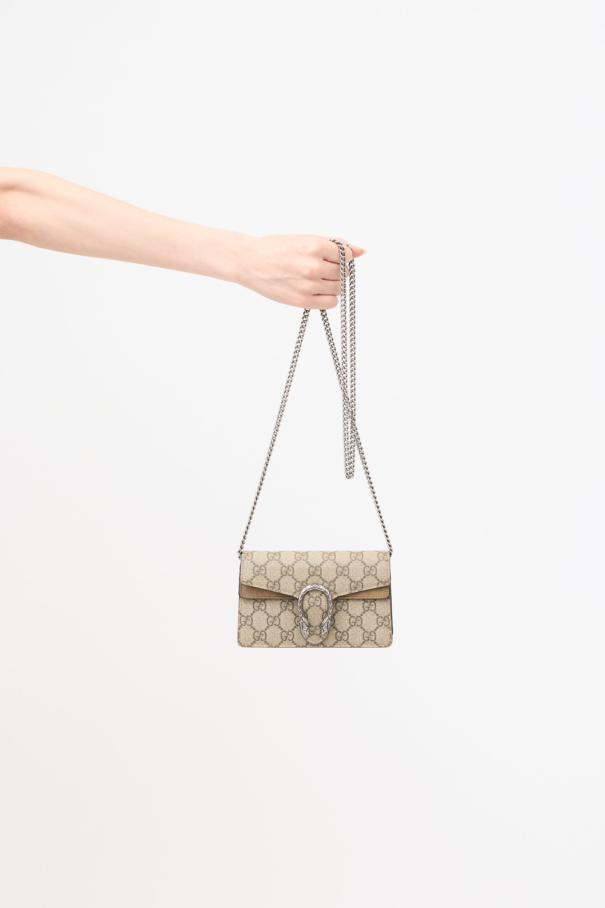 Pre-owned Gucci Dionysus mini bag featuring signature beige GG Supreme monogram coated canvas, silver tone hardware, chain shoulder strap, brown suede trim, Dionysus tiger head hardware at top flap, snap closure, interior flap pocket, and one main compartment with lobster clasp keychain.