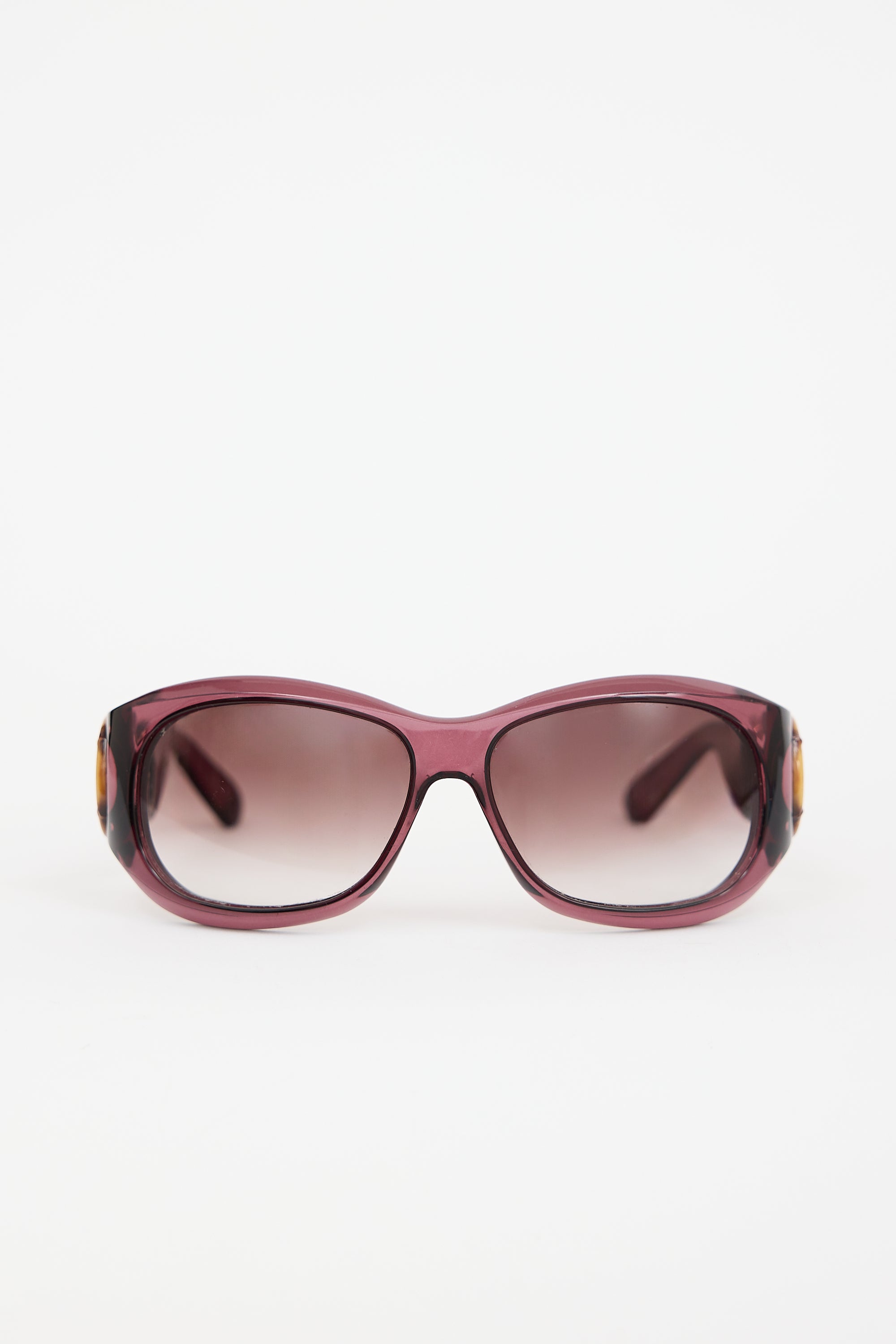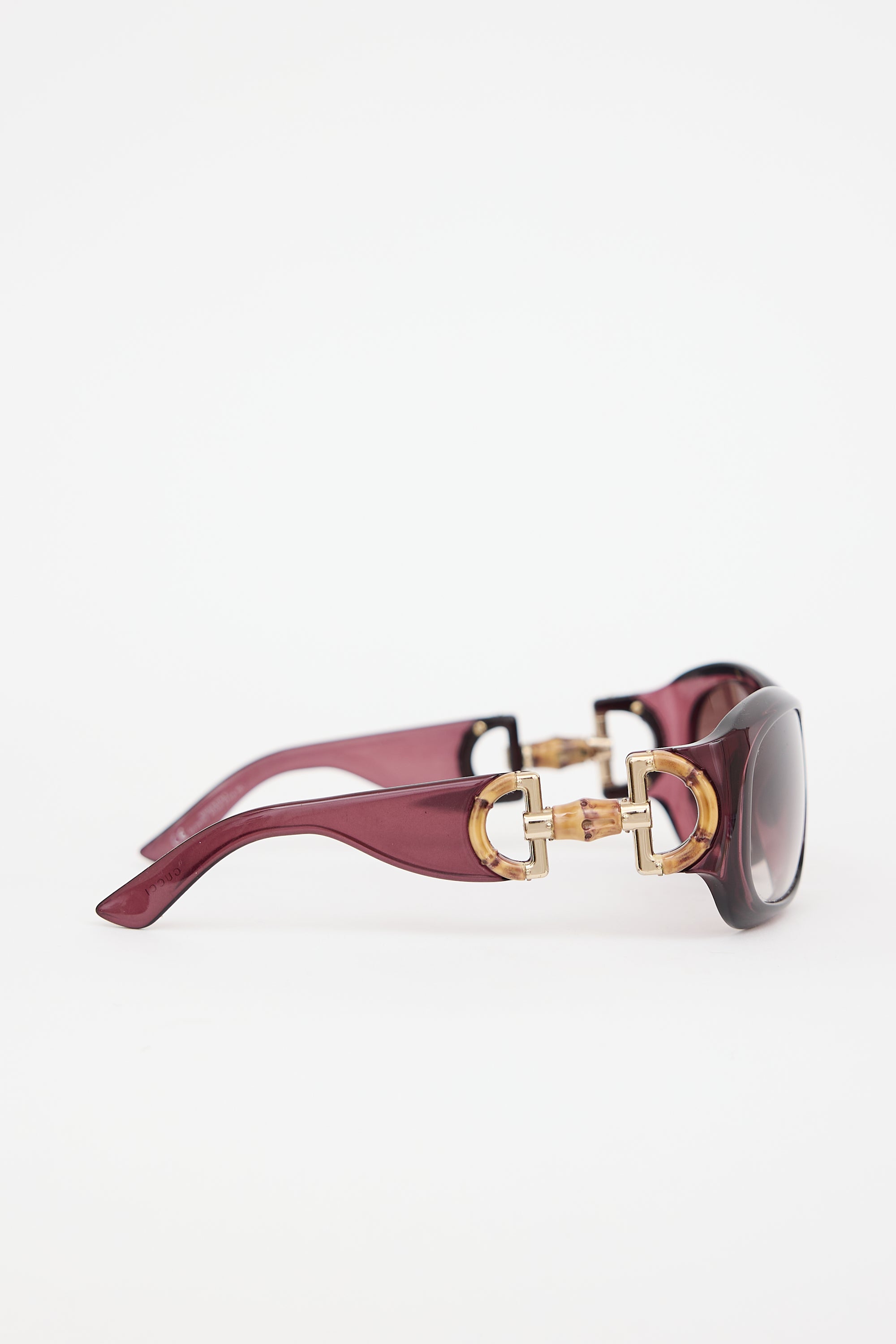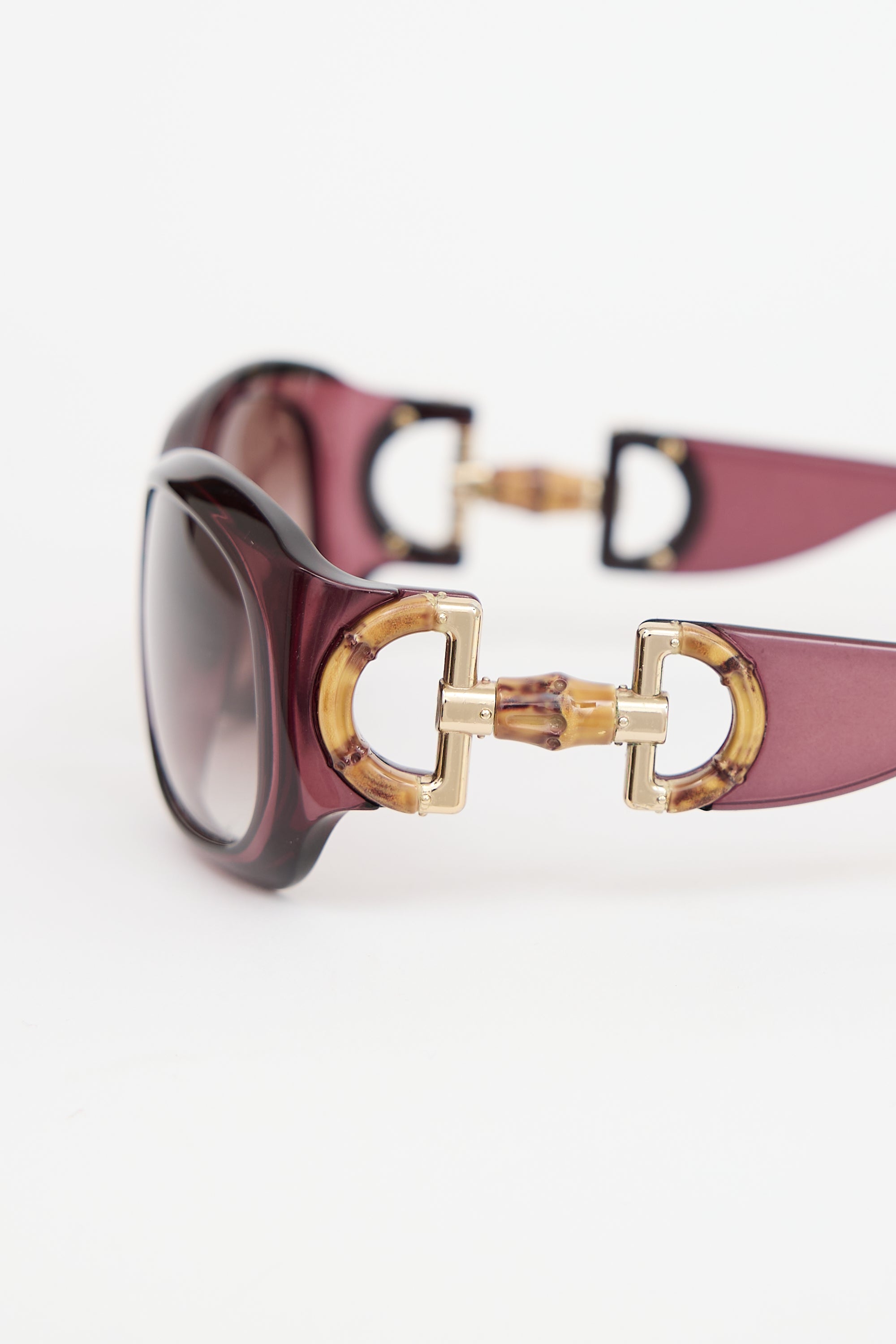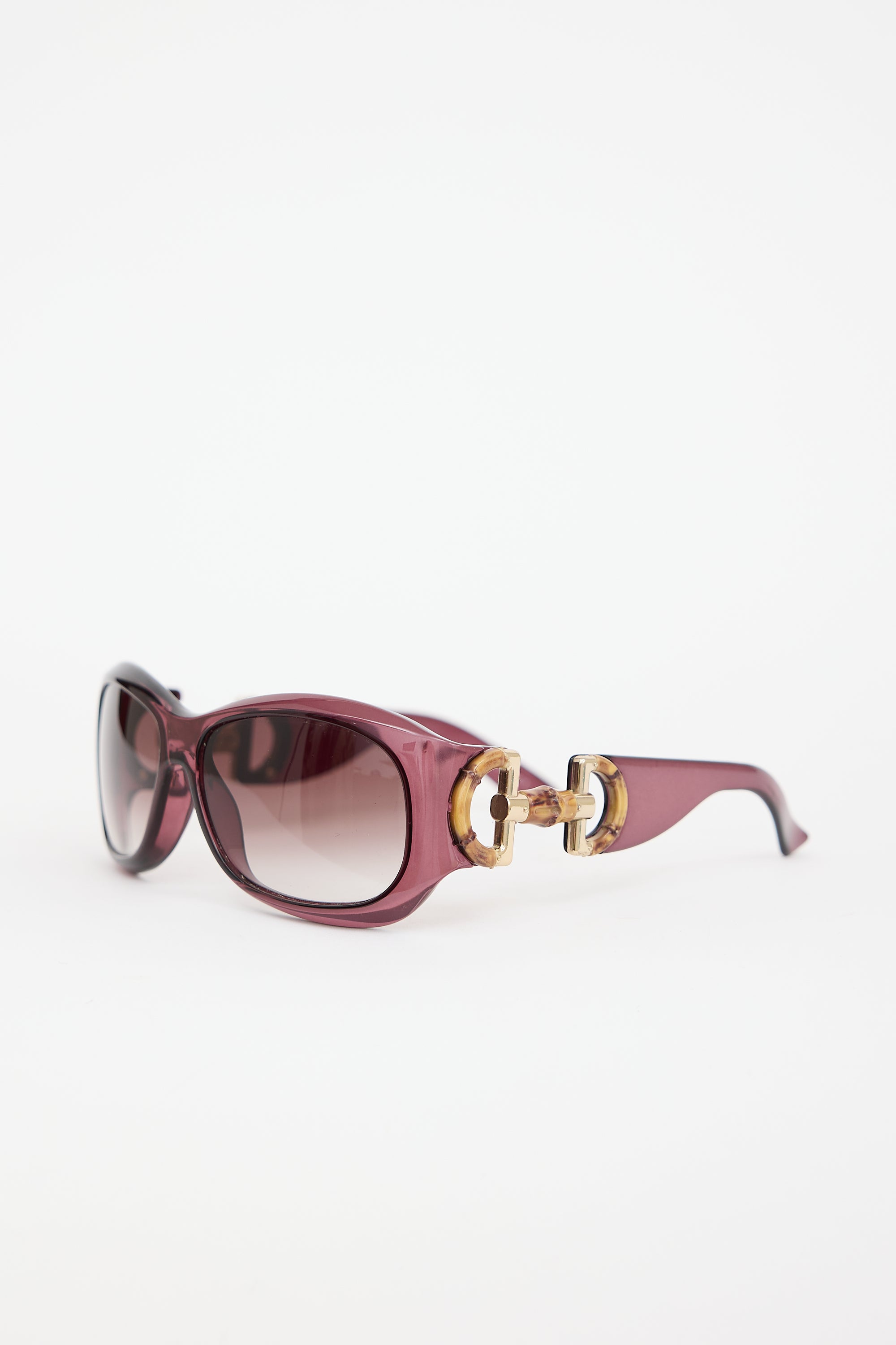 Pre-owned Gucci GG2970/S sunglasses featuring purple gradient tinted lenses, translucent purple acetate frame, and brown and gold tone bamboo Horsebit detail at temples. Comes with original case.