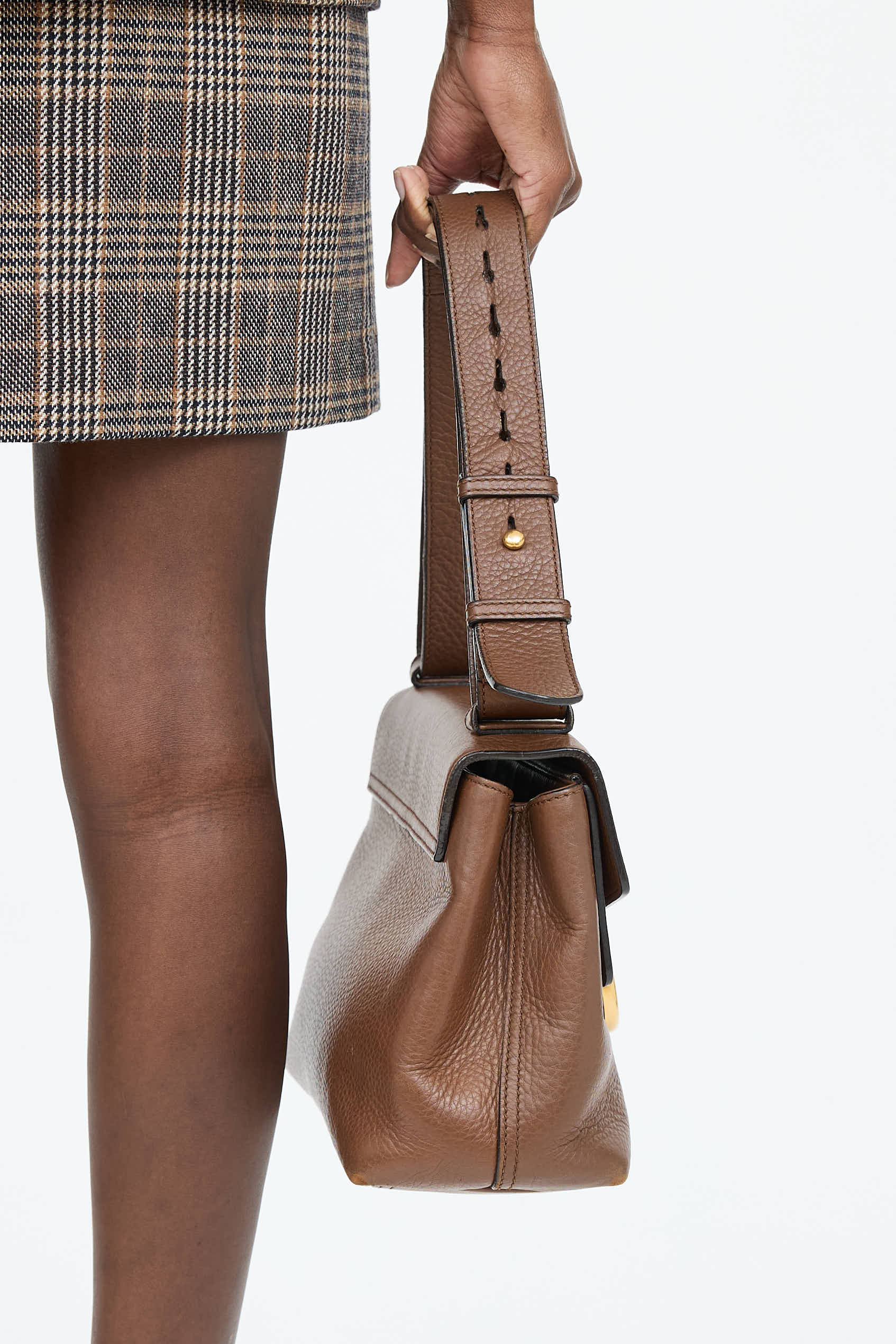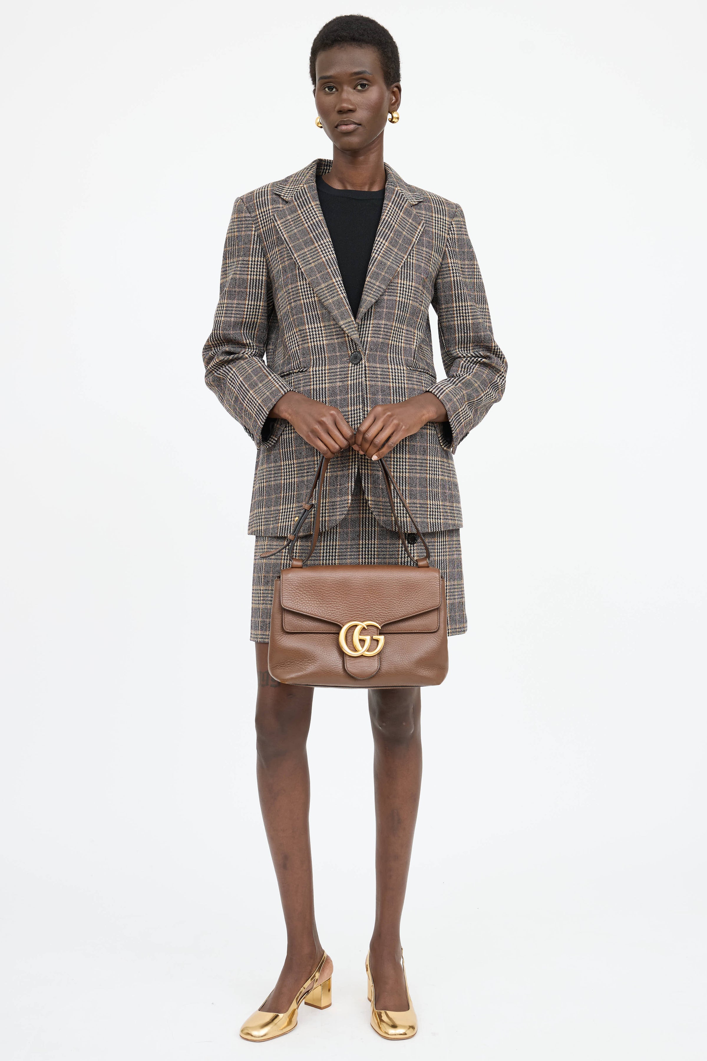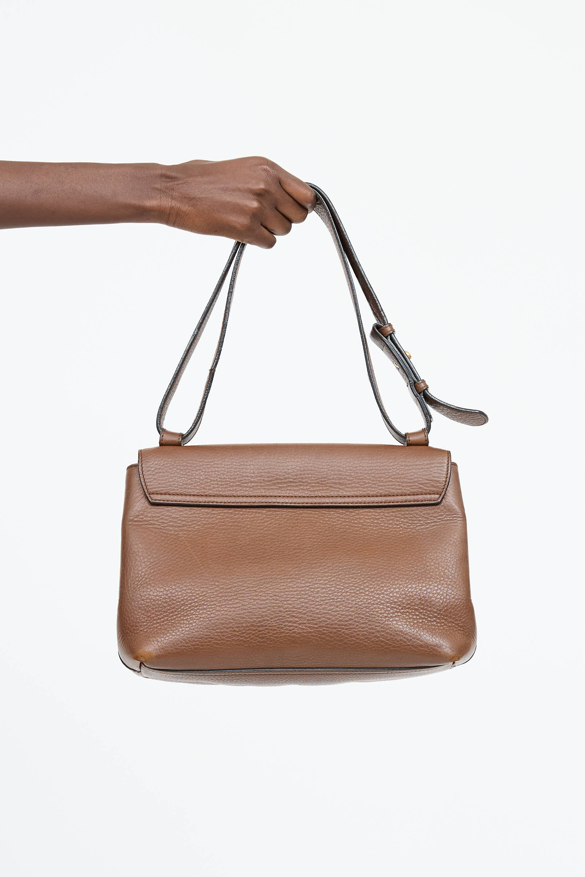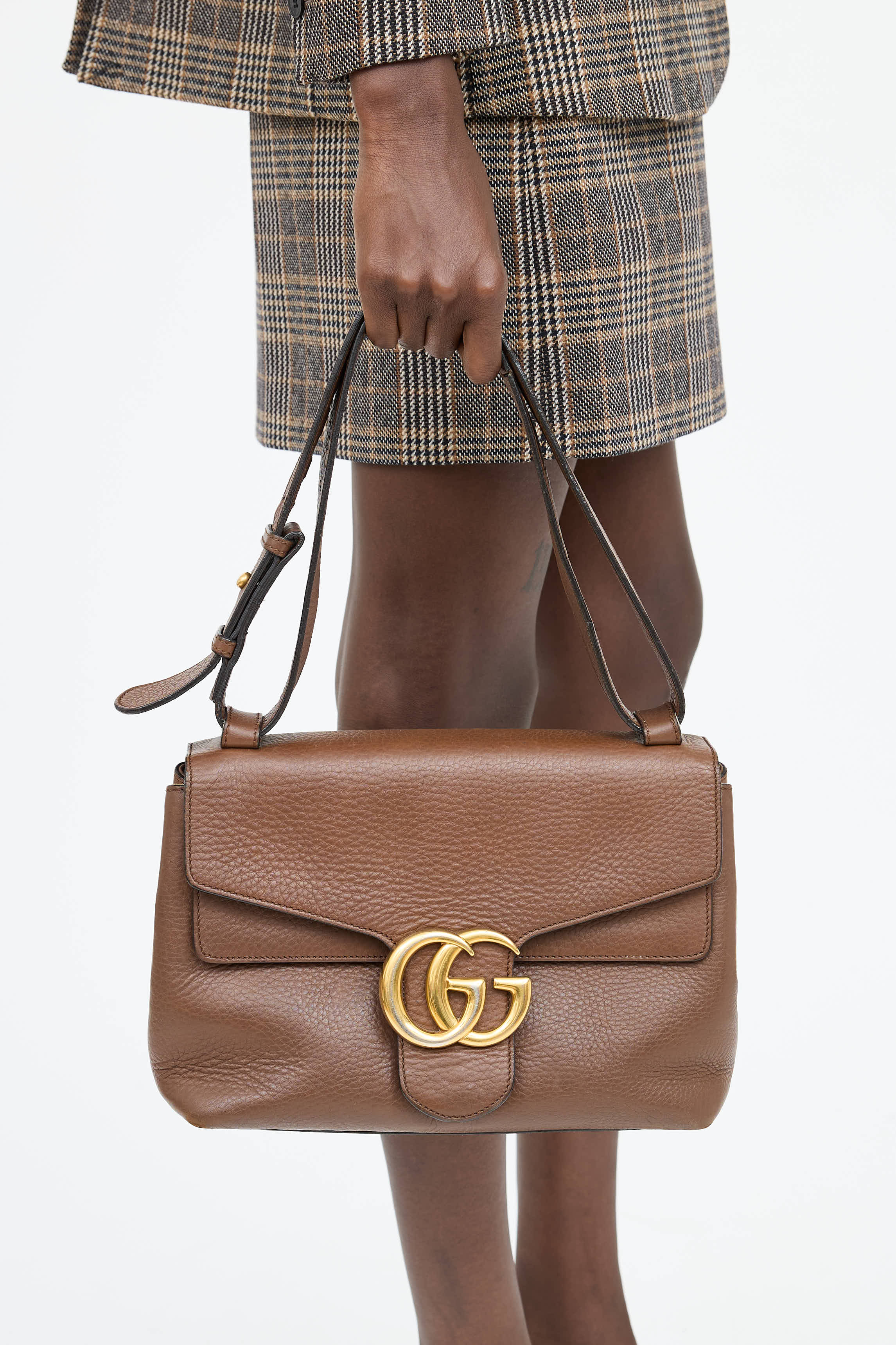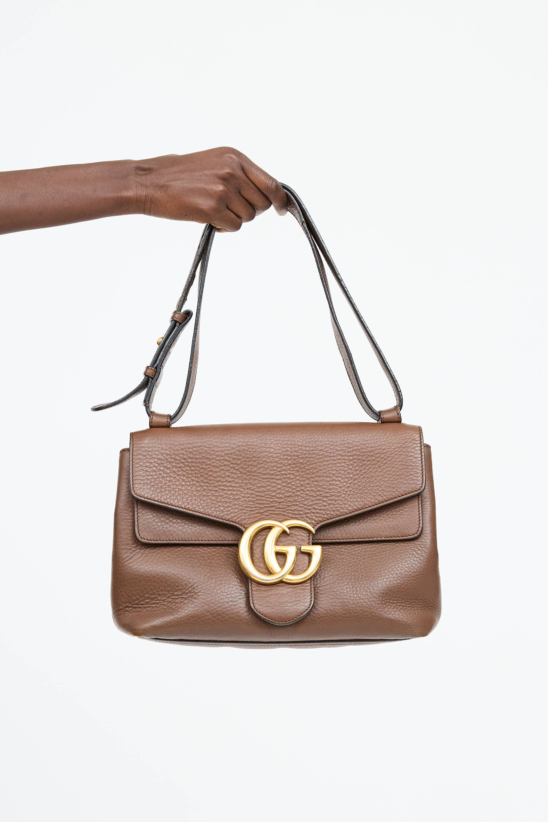 Pre-owned Gucci brown leather crossbody bag featuring adjustable flat shoulder strap, gold tone hardware, pebbled leather, GG hardware on front flap with push button closure, one main compartment with divider, one zip pocket and two slip pockets.