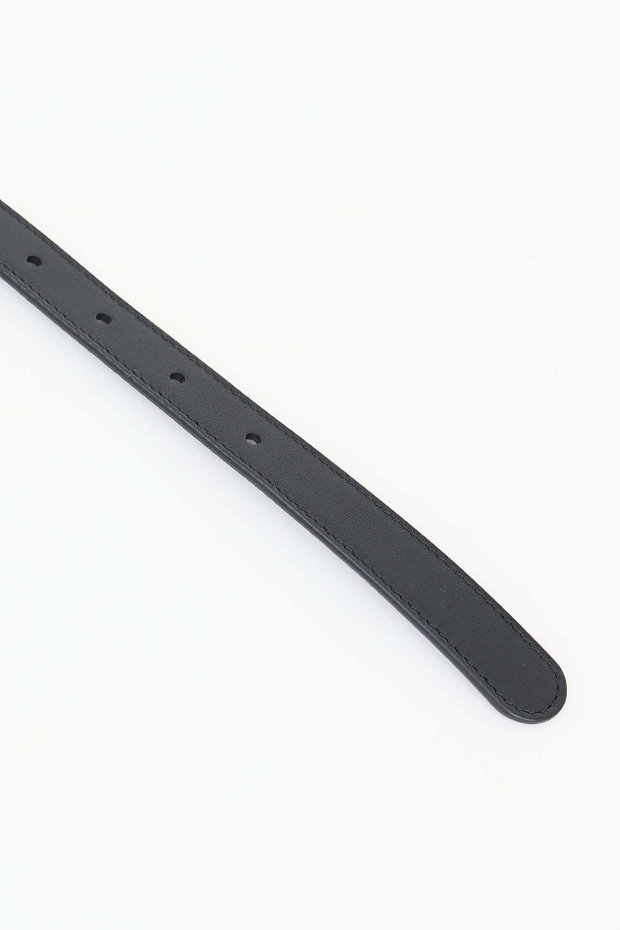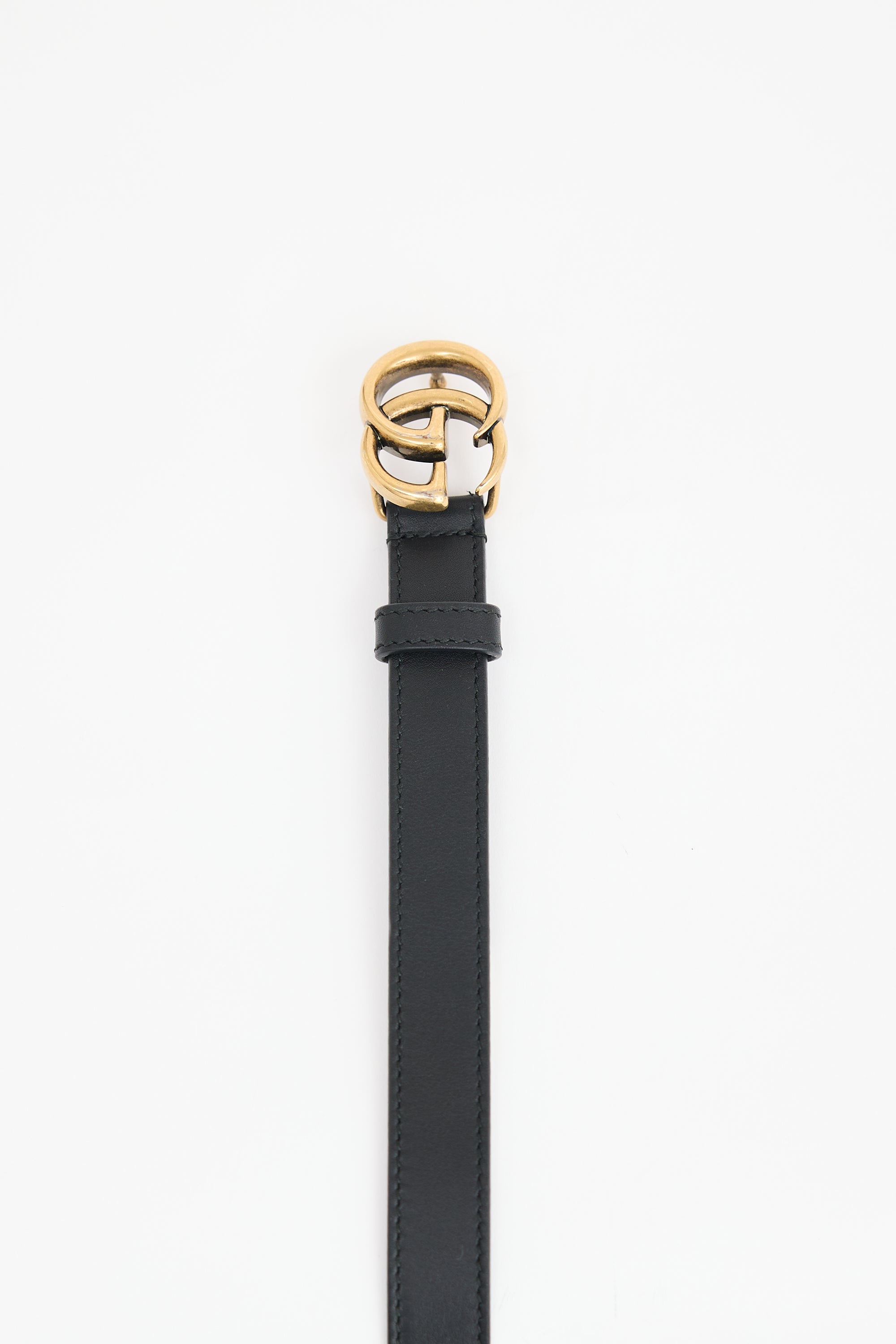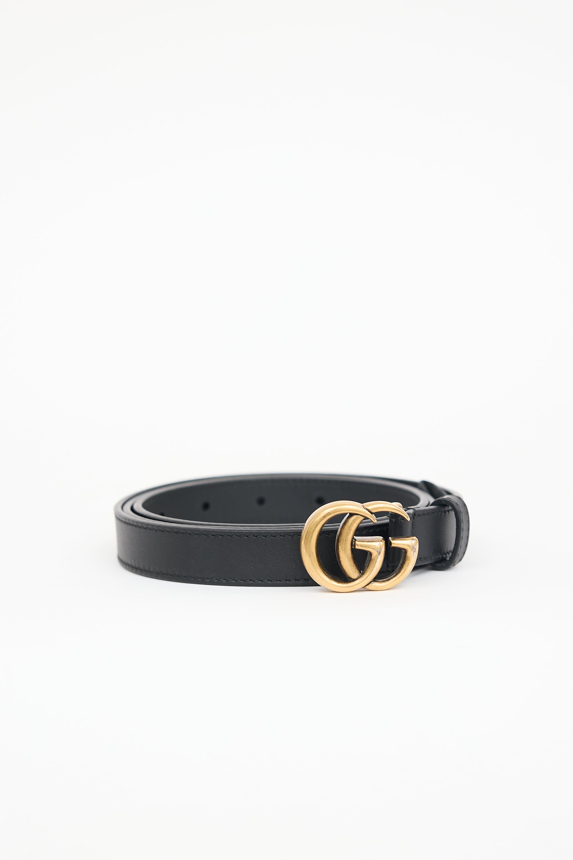Pre-owned Gucci black leather thin belt featuring gold tone GG Marmont buckle, push pin closure, and stamped logo at reverse.