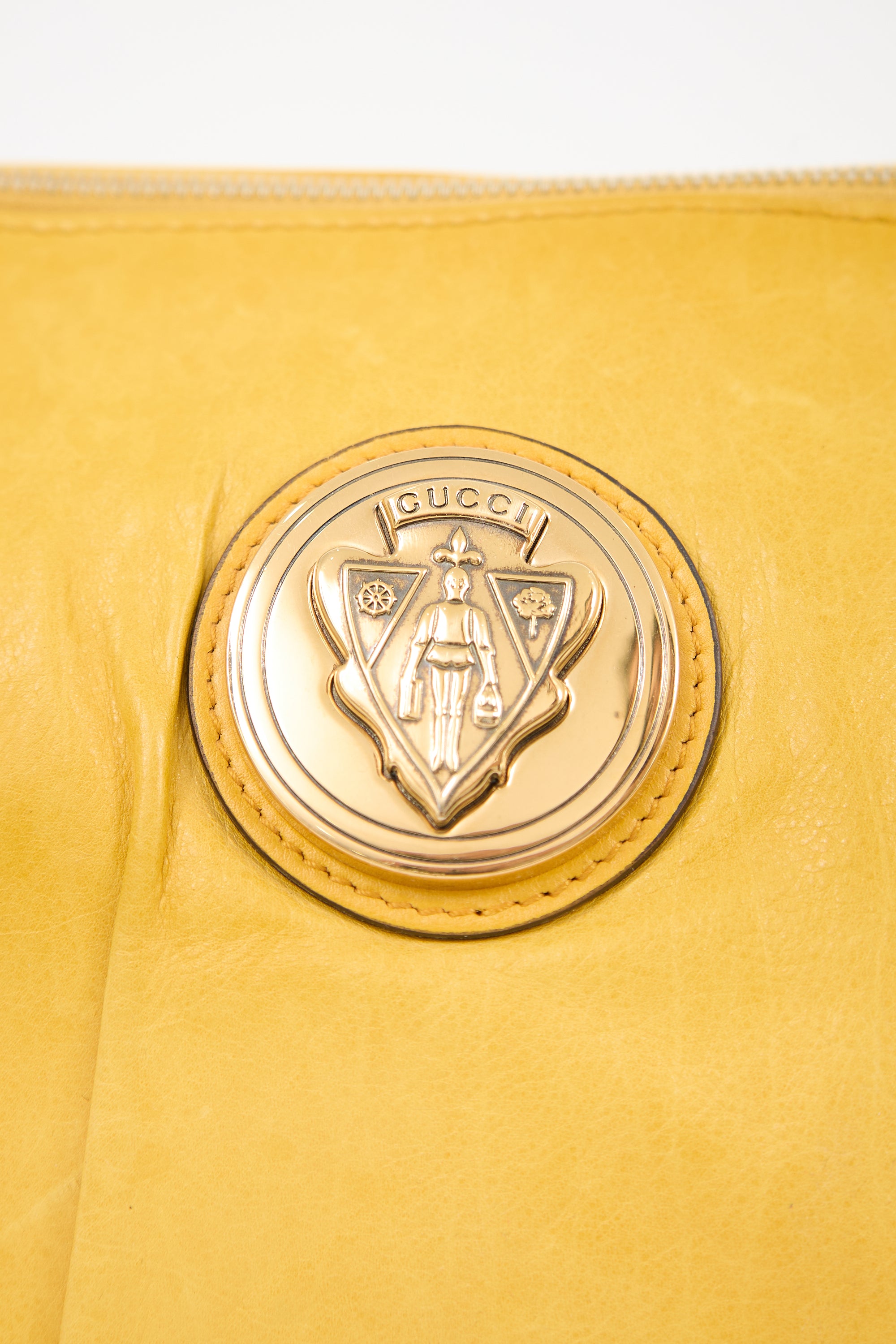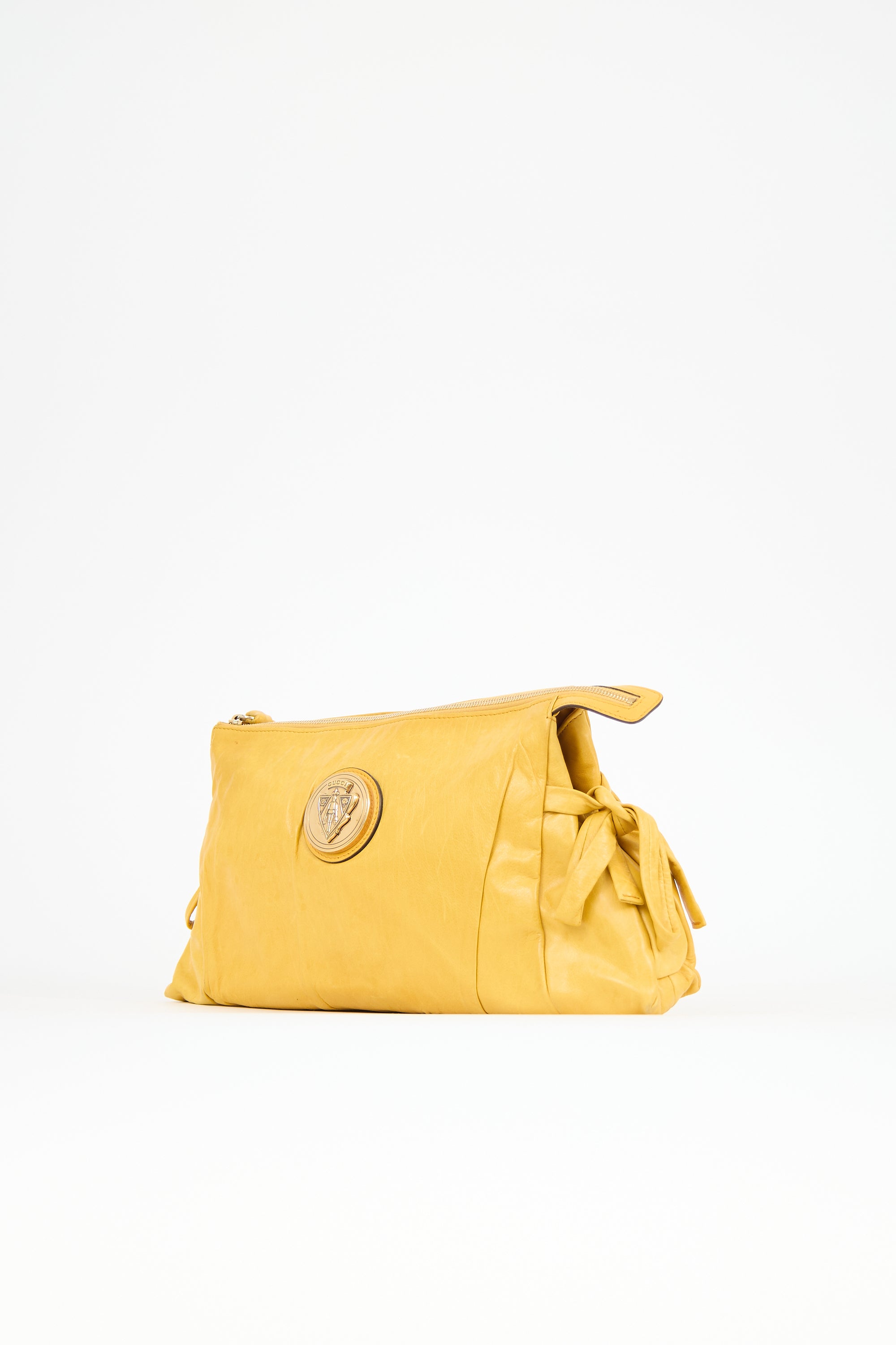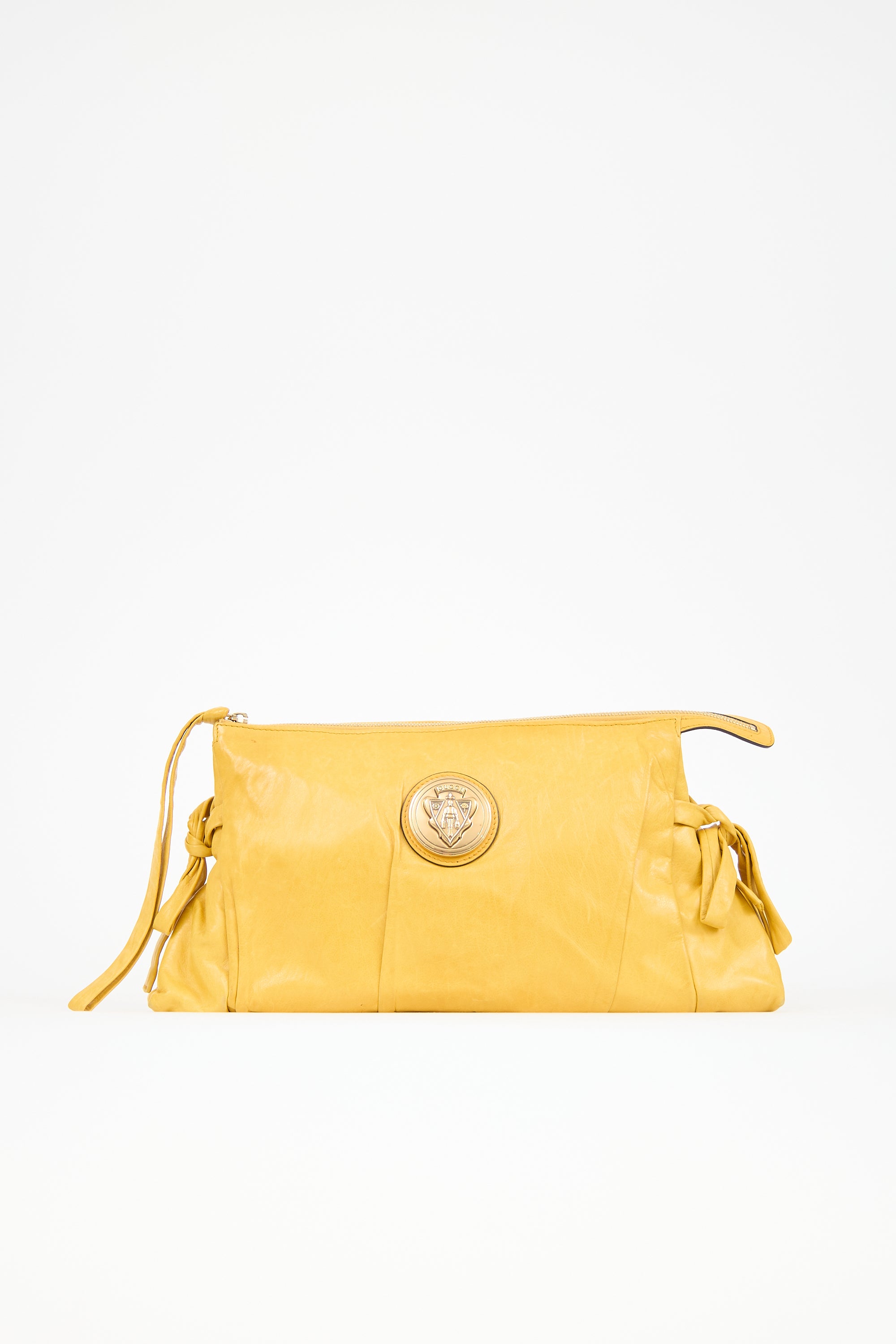 Pre-owned Gucci yellow leather Hysteria clutch featuring gold tone hardware, zip top closure, logo plaque at front, cinchable sides with self-tie fastening, and one interior zip pocket. Comes with original dust bag.