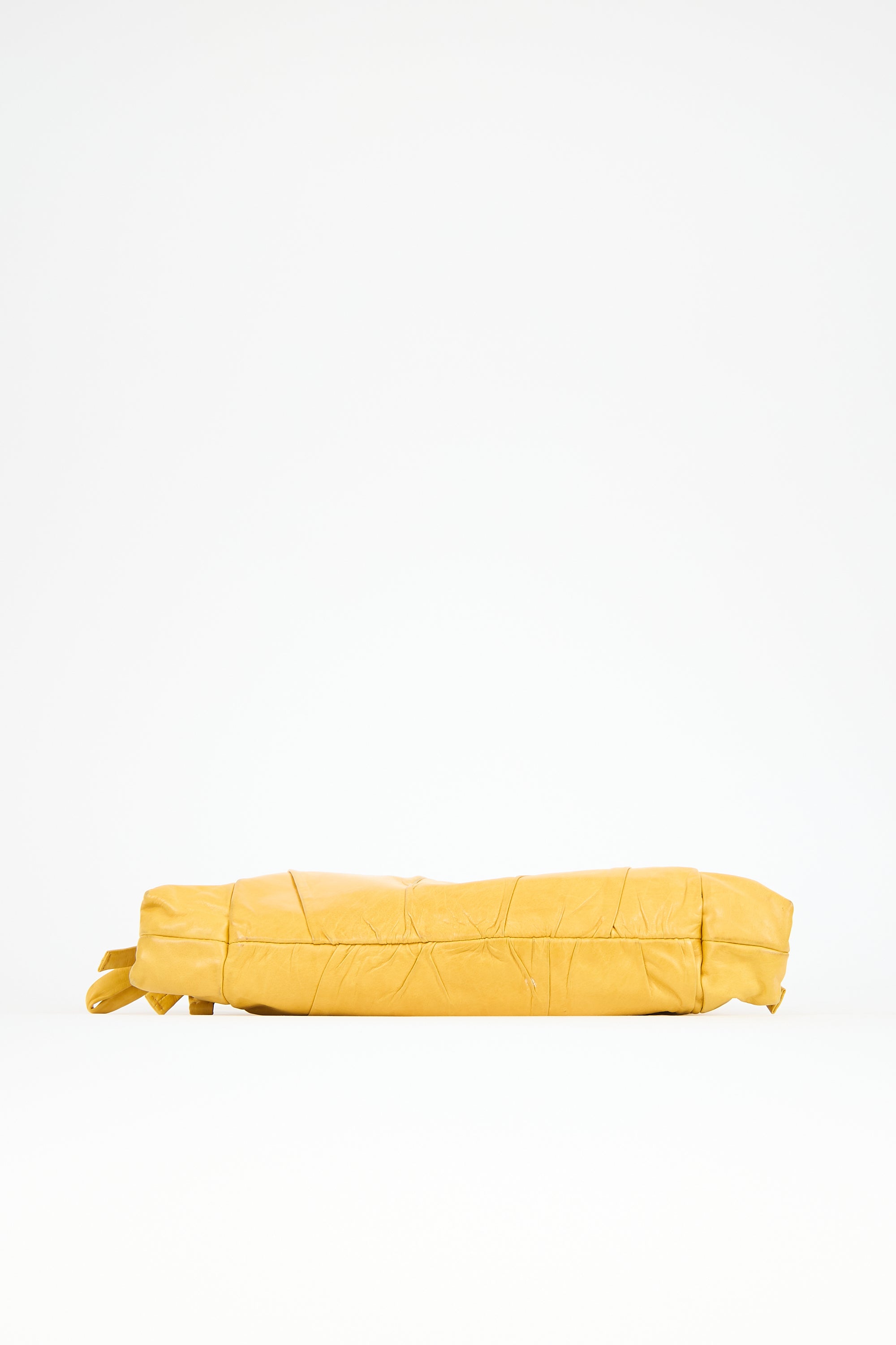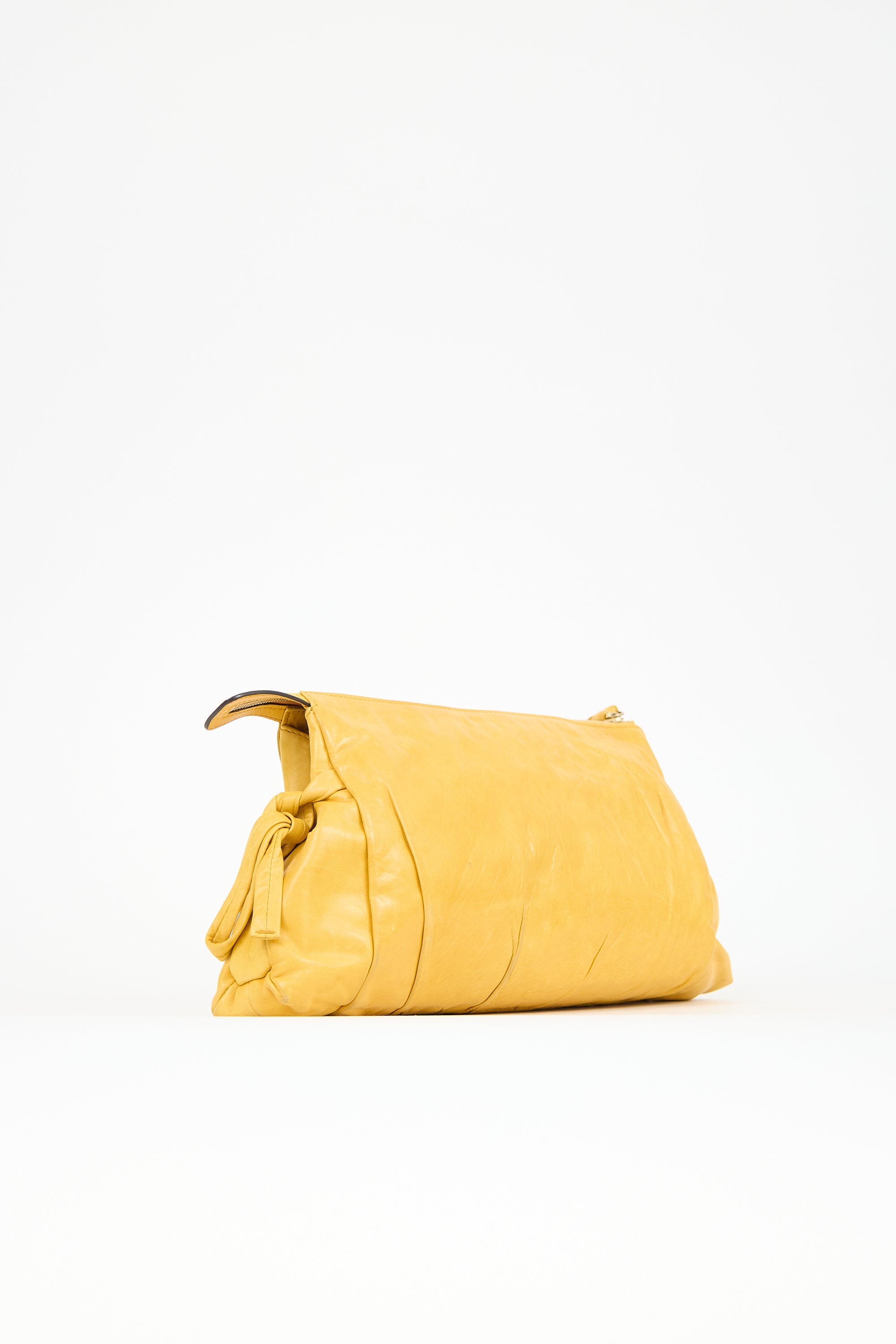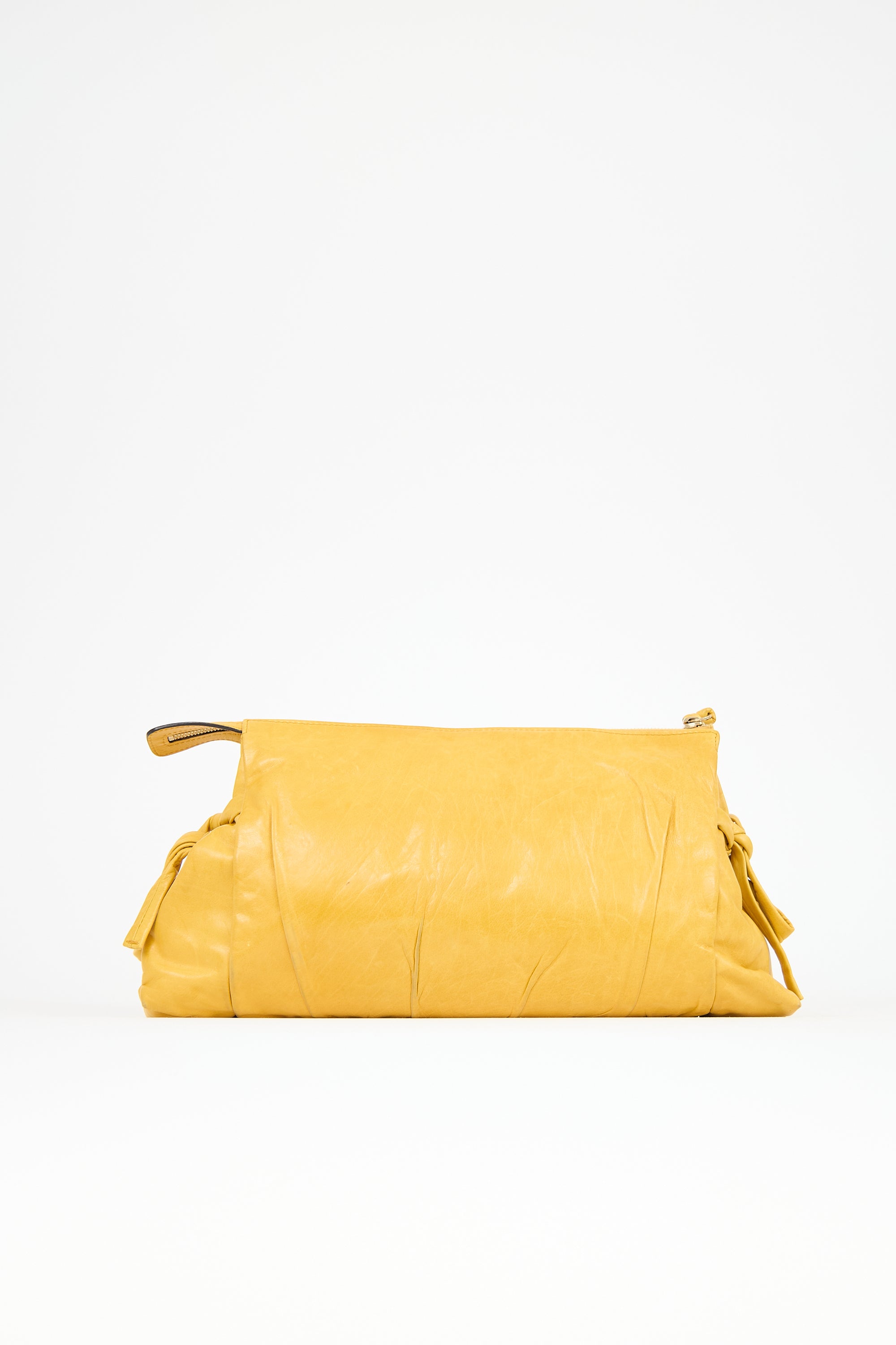 Pre-owned Gucci yellow leather Hysteria clutch featuring gold tone hardware, zip top closure, logo plaque at front, cinchable sides with self-tie fastening, and one interior zip pocket. Comes with original dust bag.
