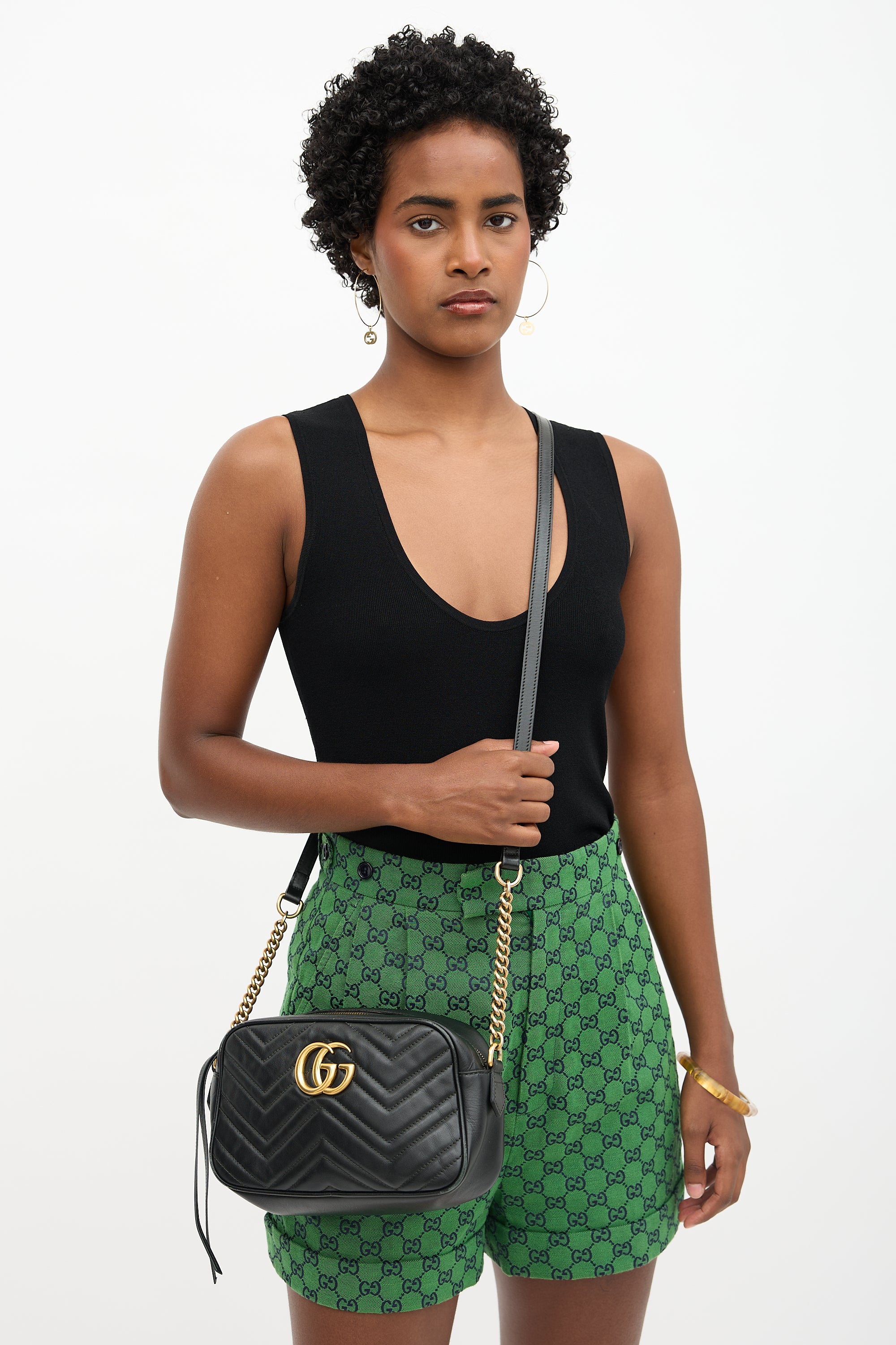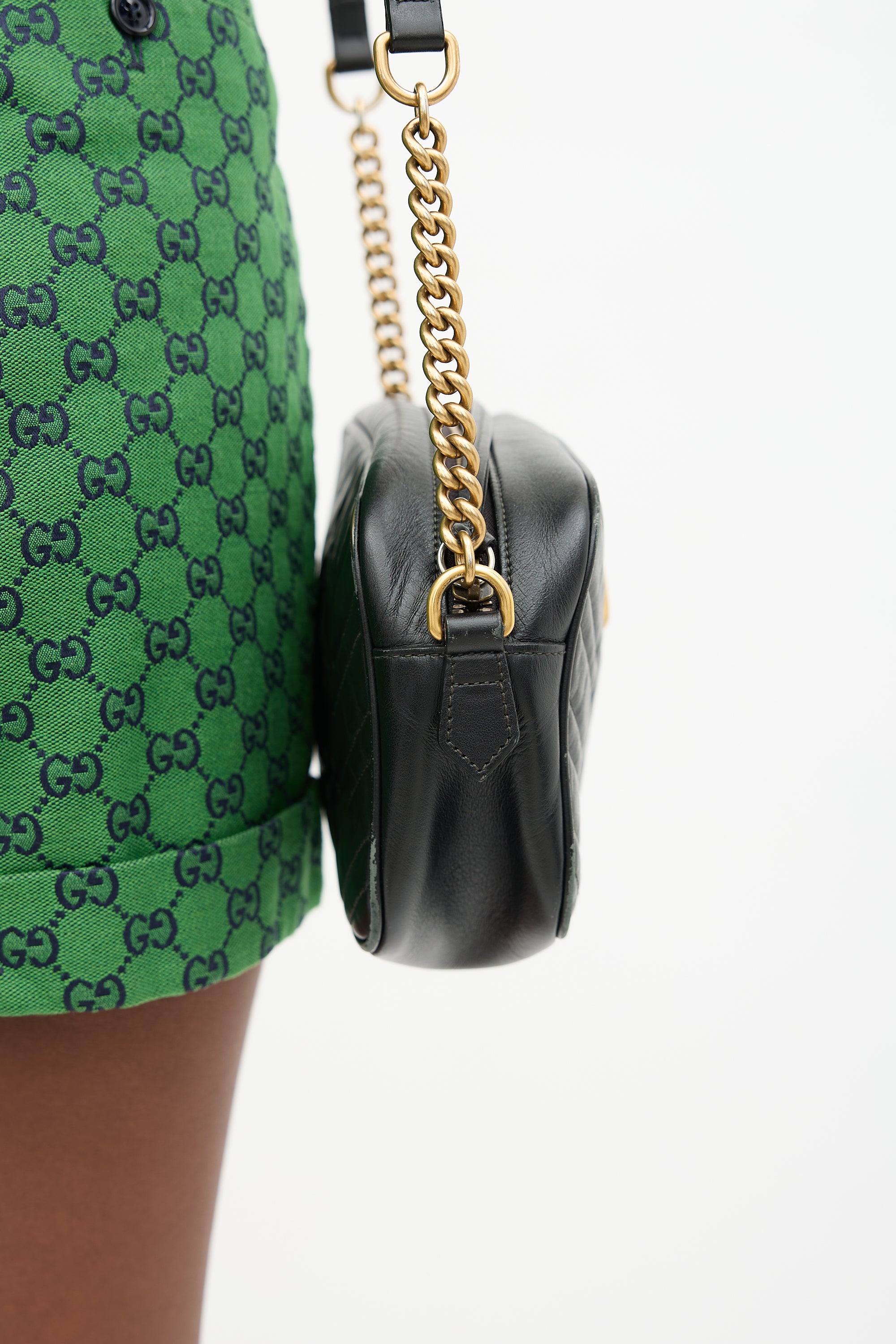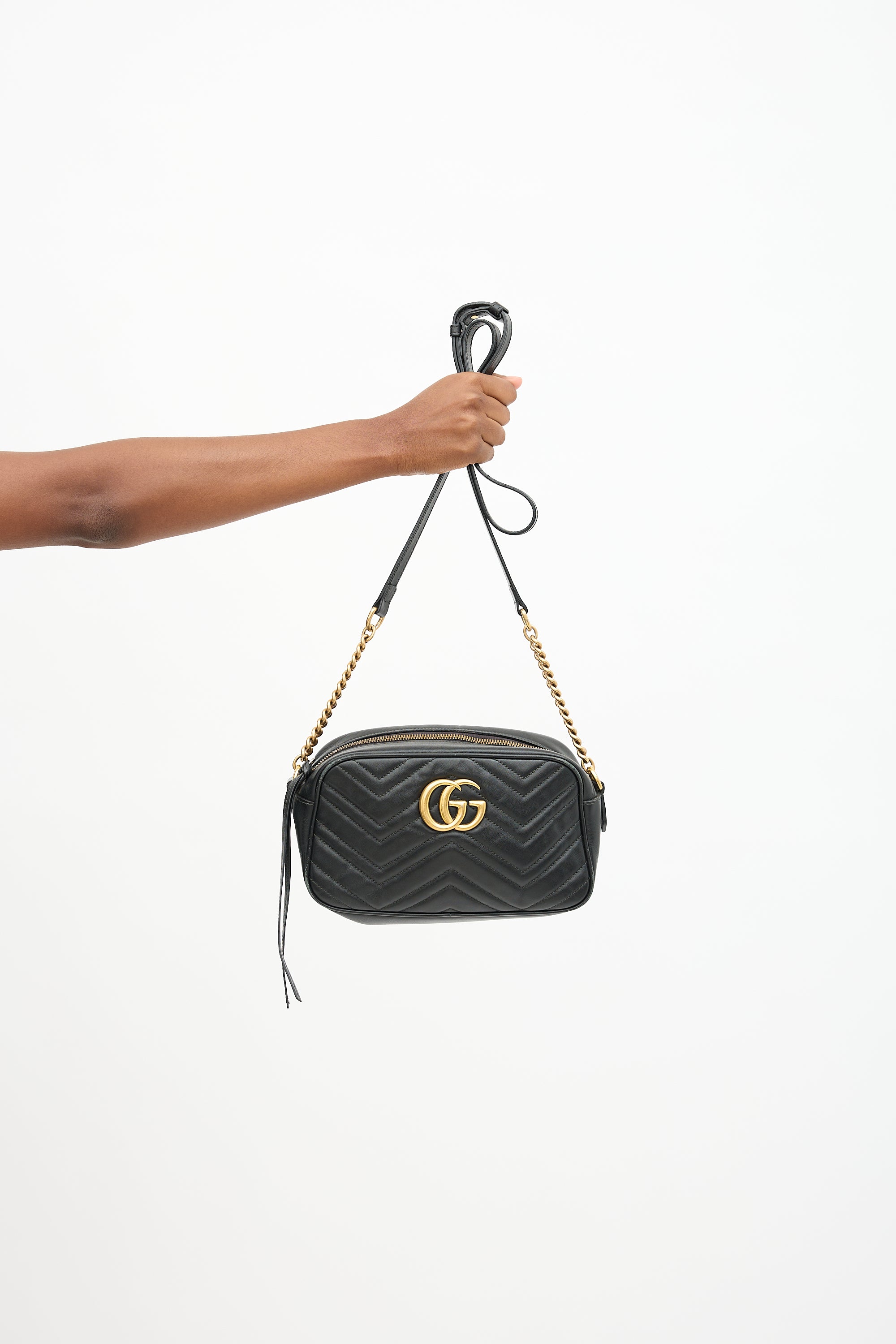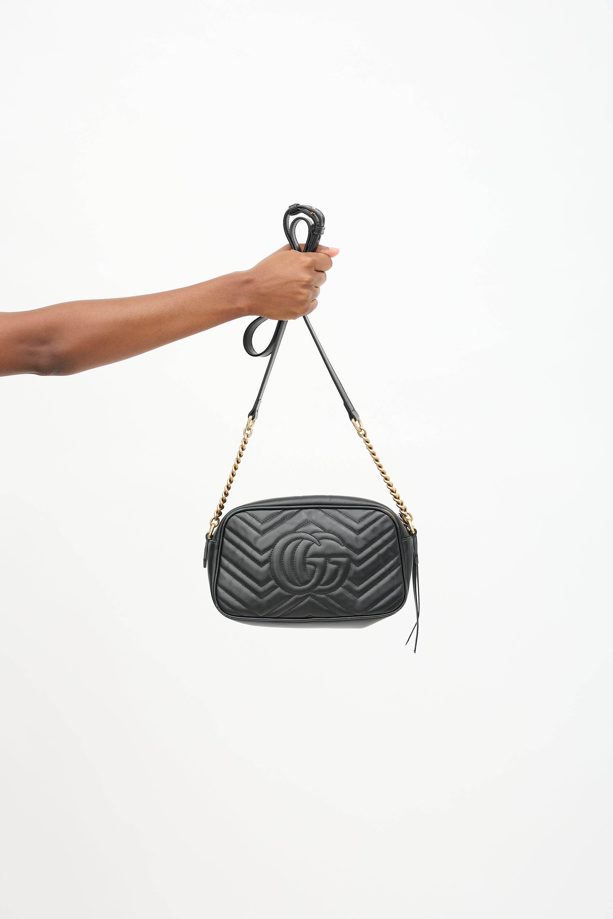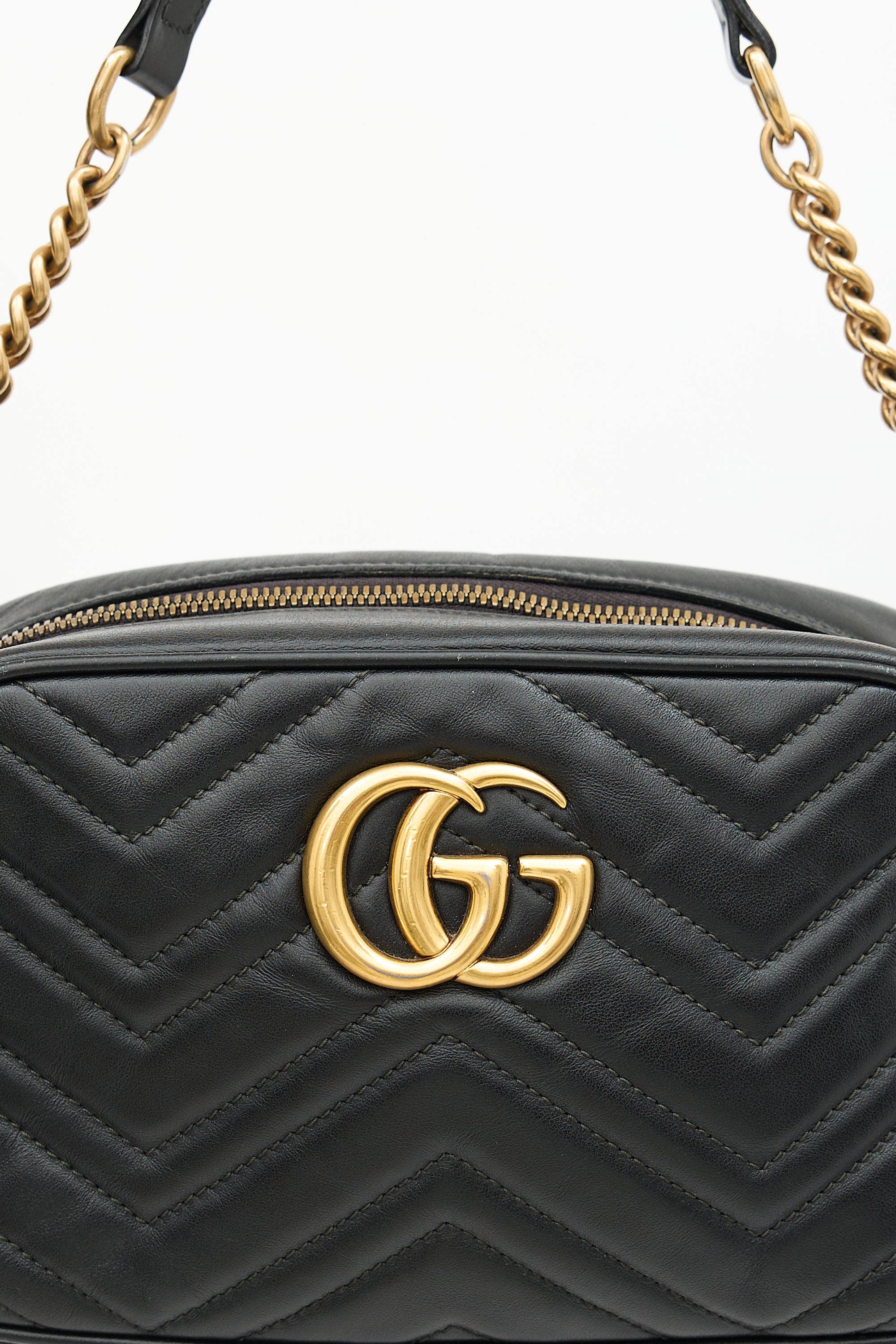 Pre-owned Gucci black leather crossbody bag featuring matelassé quilting, gold tone hardware, Marmont GG logo hardware at front, quilted GG at back, adjustable chain and leather strap, top zip closure, and one lined main compartment with one slip pocket. Comes with original dust bag.