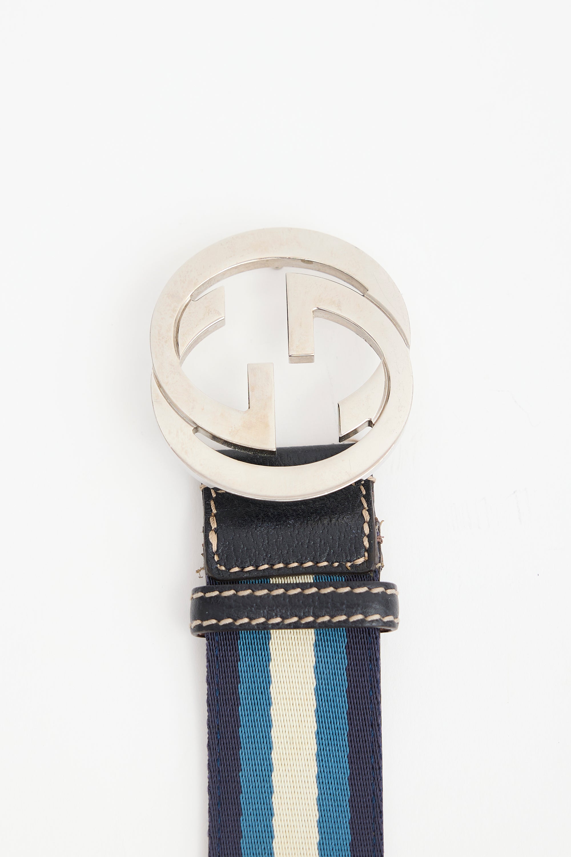 Pre-owned Gucci leather and webbed canvas belt featuring blue, navy, and cream stripes, stamped logo at reverse, silver tone interlocking GG buckle, and push pin closure.