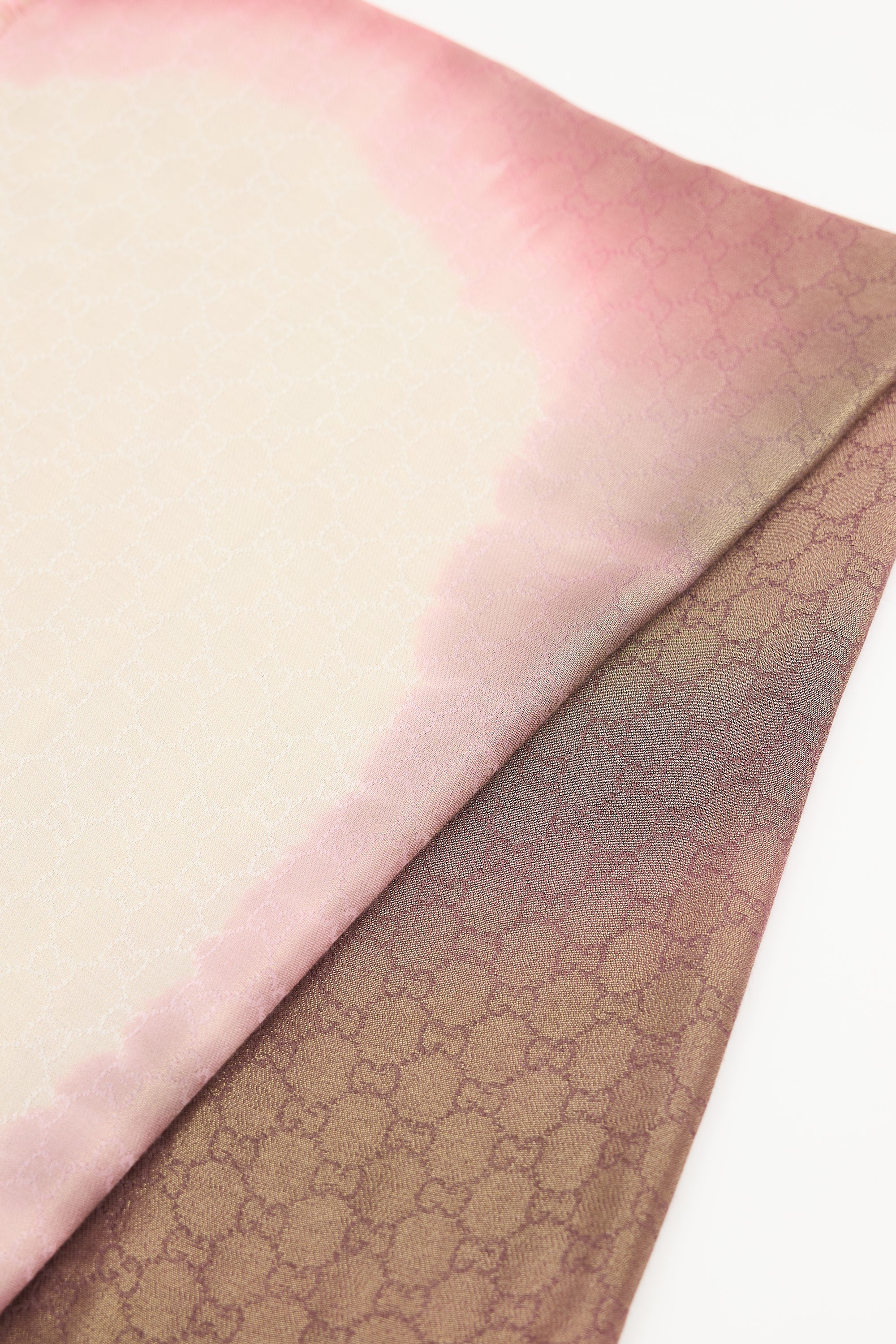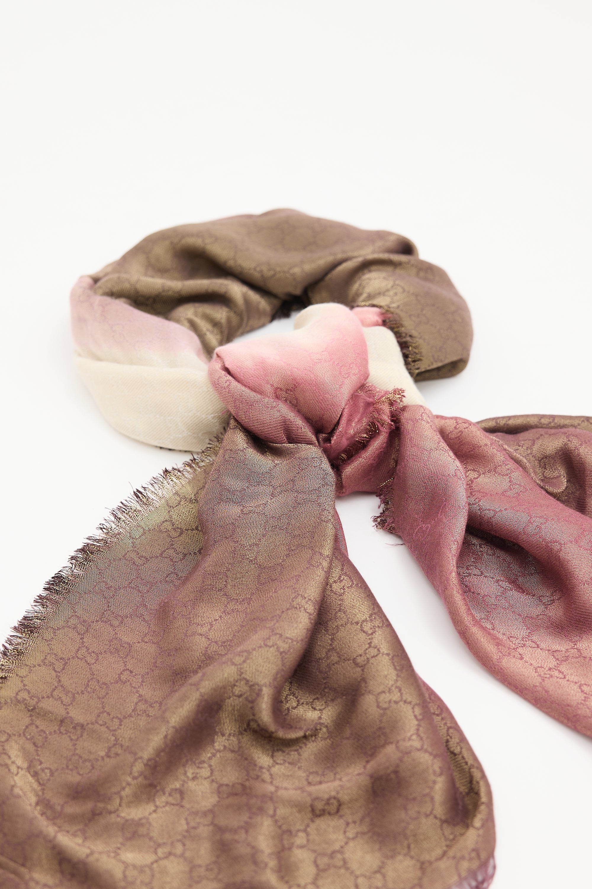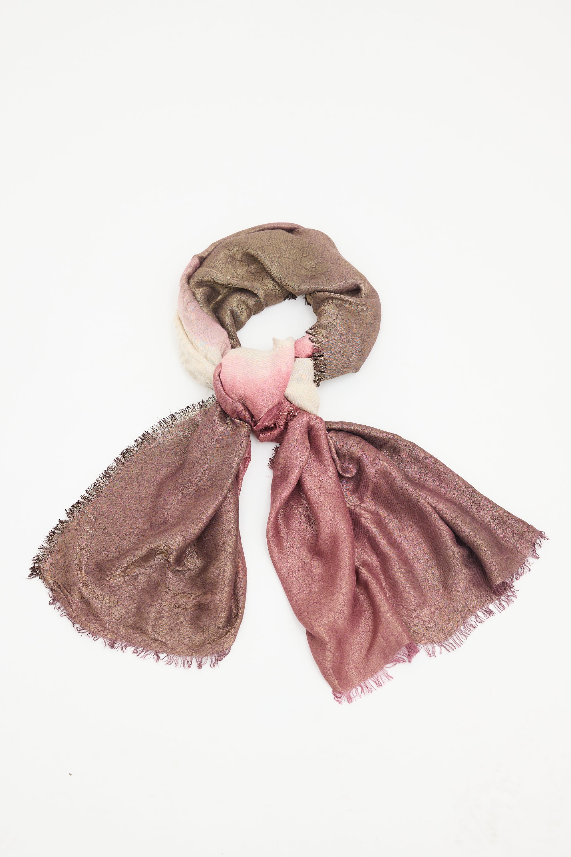 Pre-owned Gucci pink, brown, and multicolour scarf featuring ombré, GG jacquard with gold tone metallic threads, fringe trim, and logo tab at reverse. Comes with original dust bag.