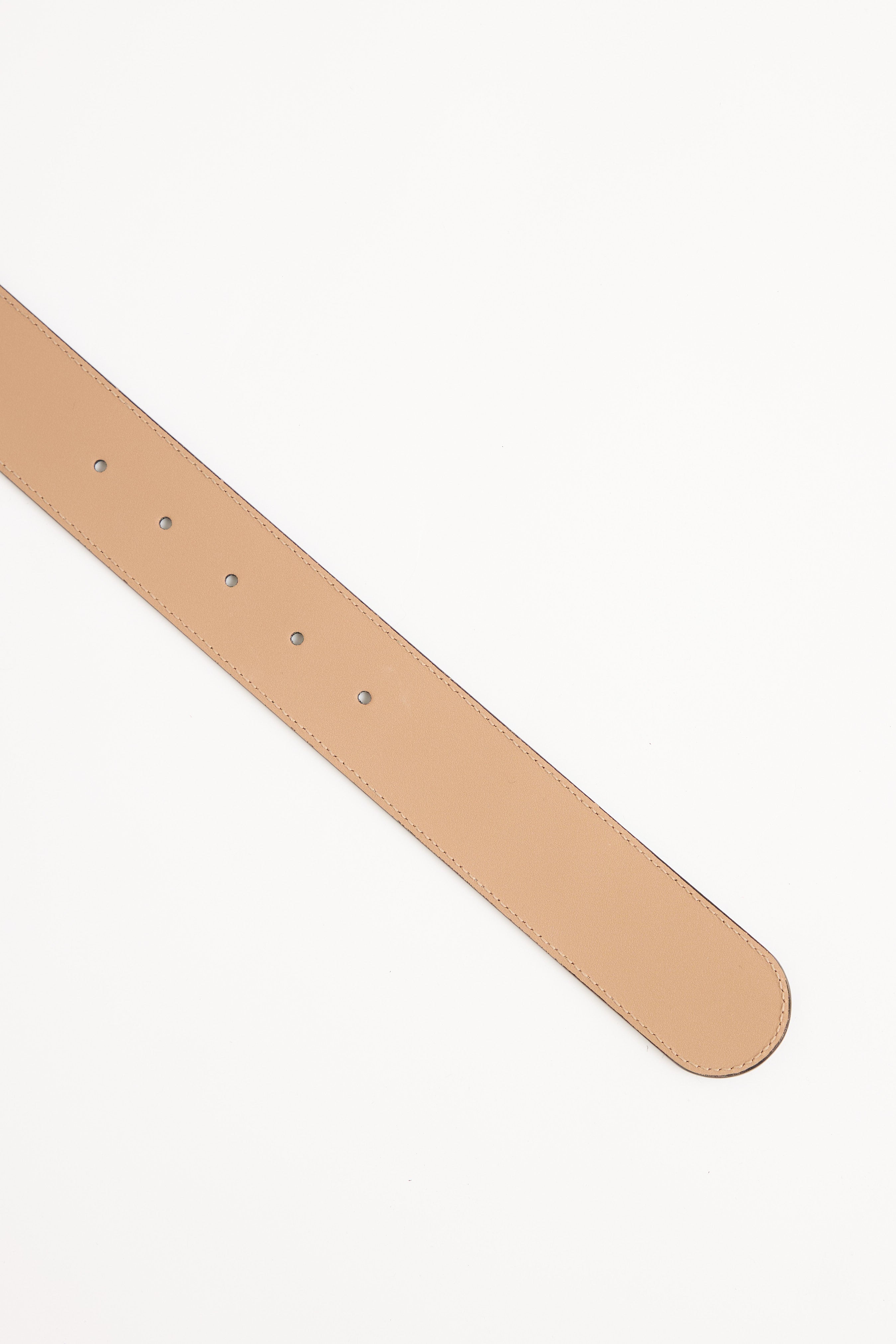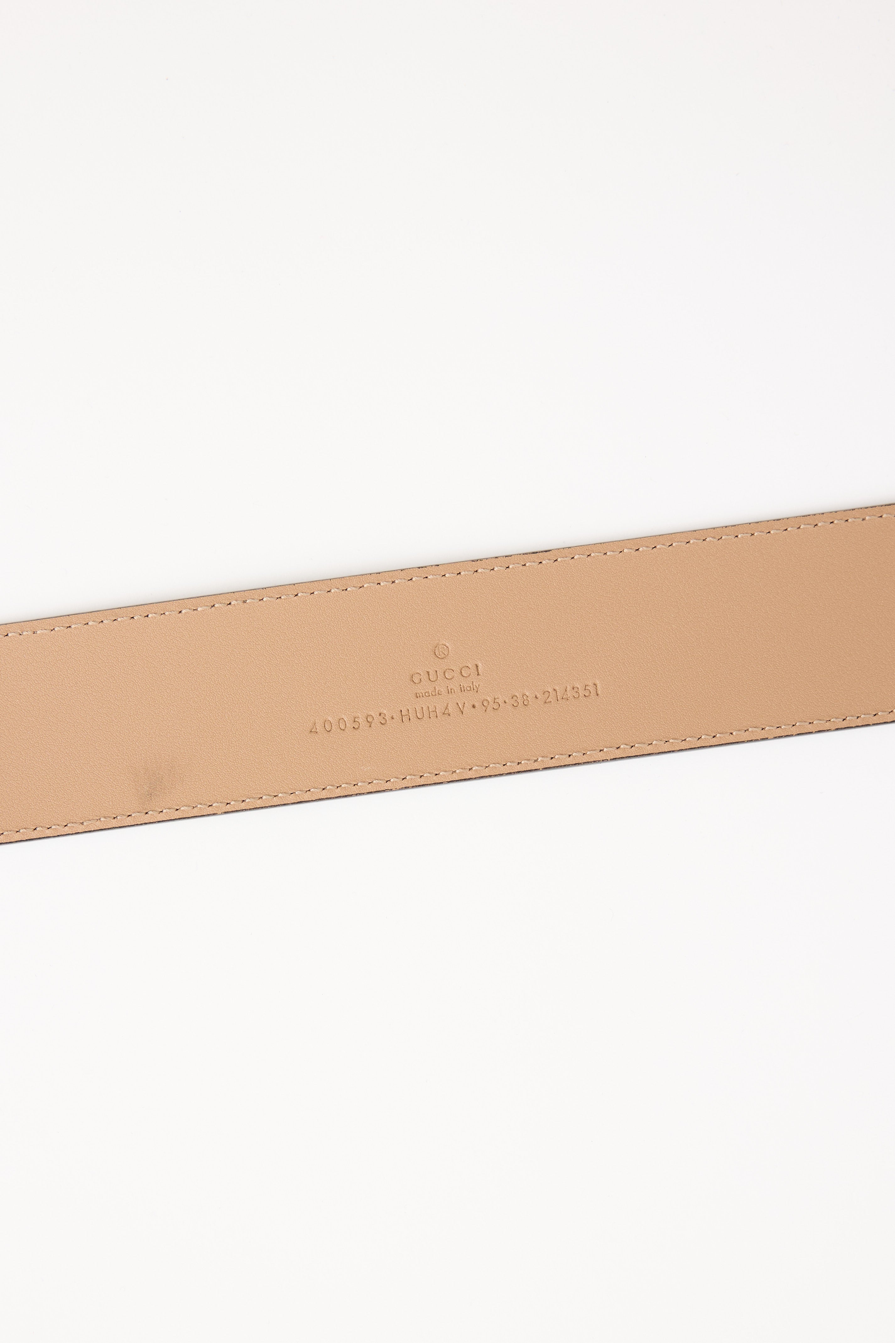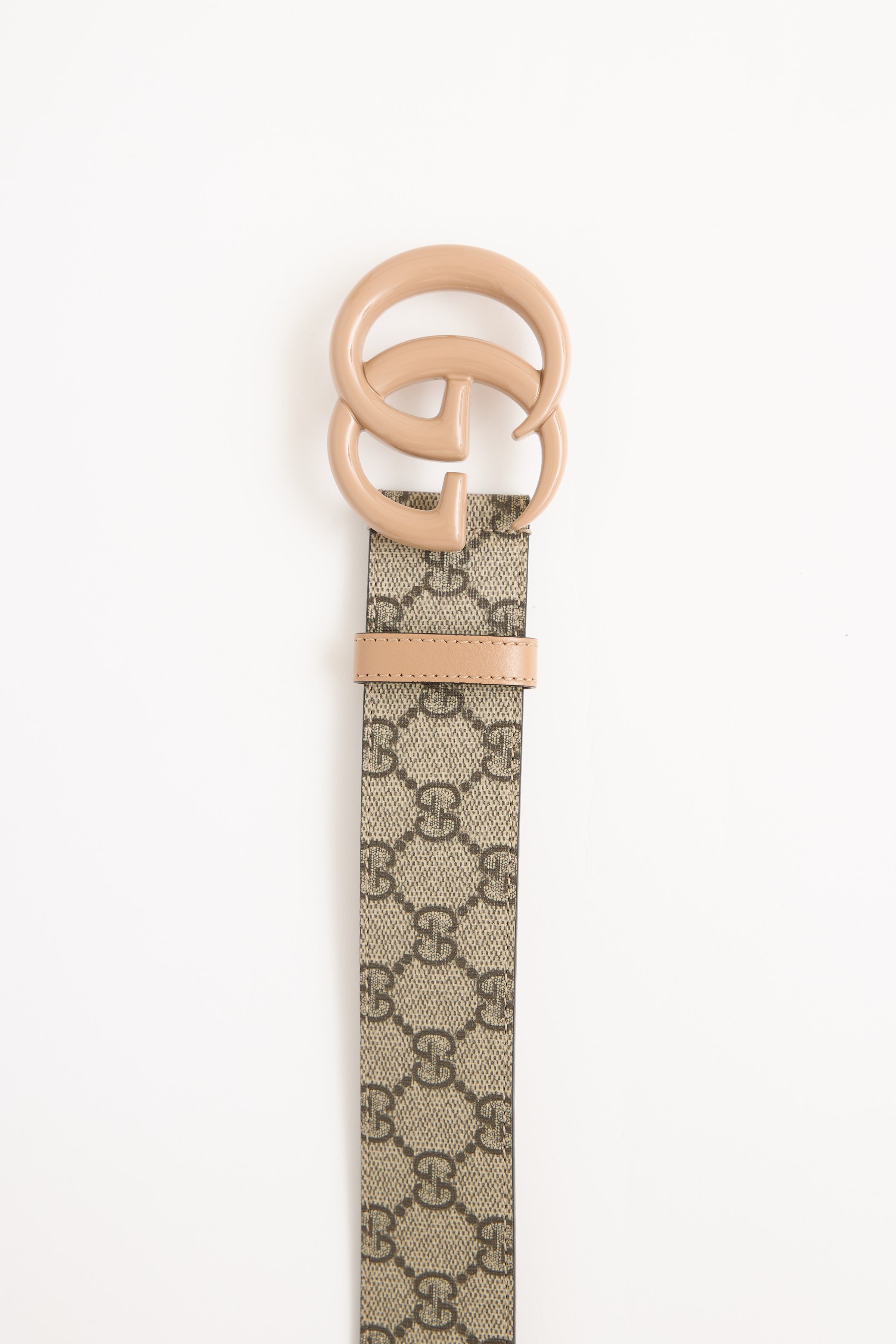Pre-owned Gucci beige leather belt featuring signature monogram on coated canvas, beige GG Marmont, and push pin closure.