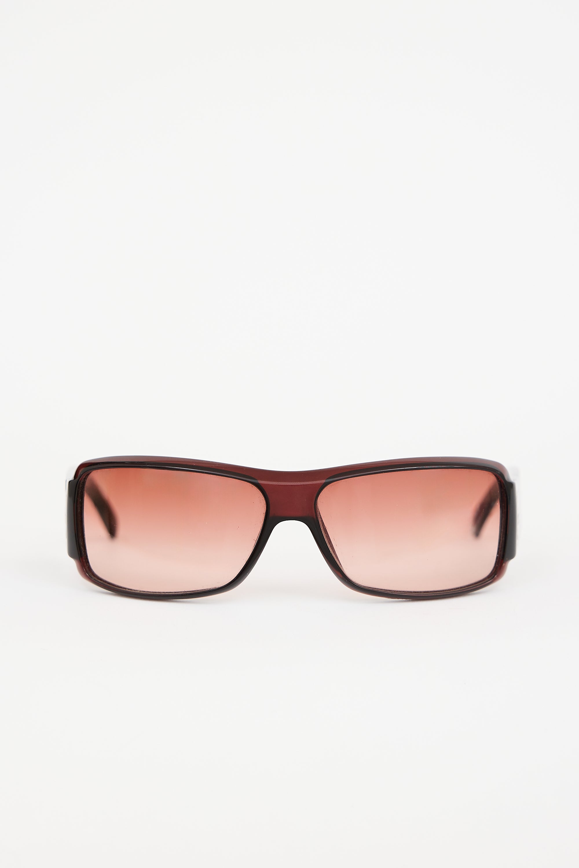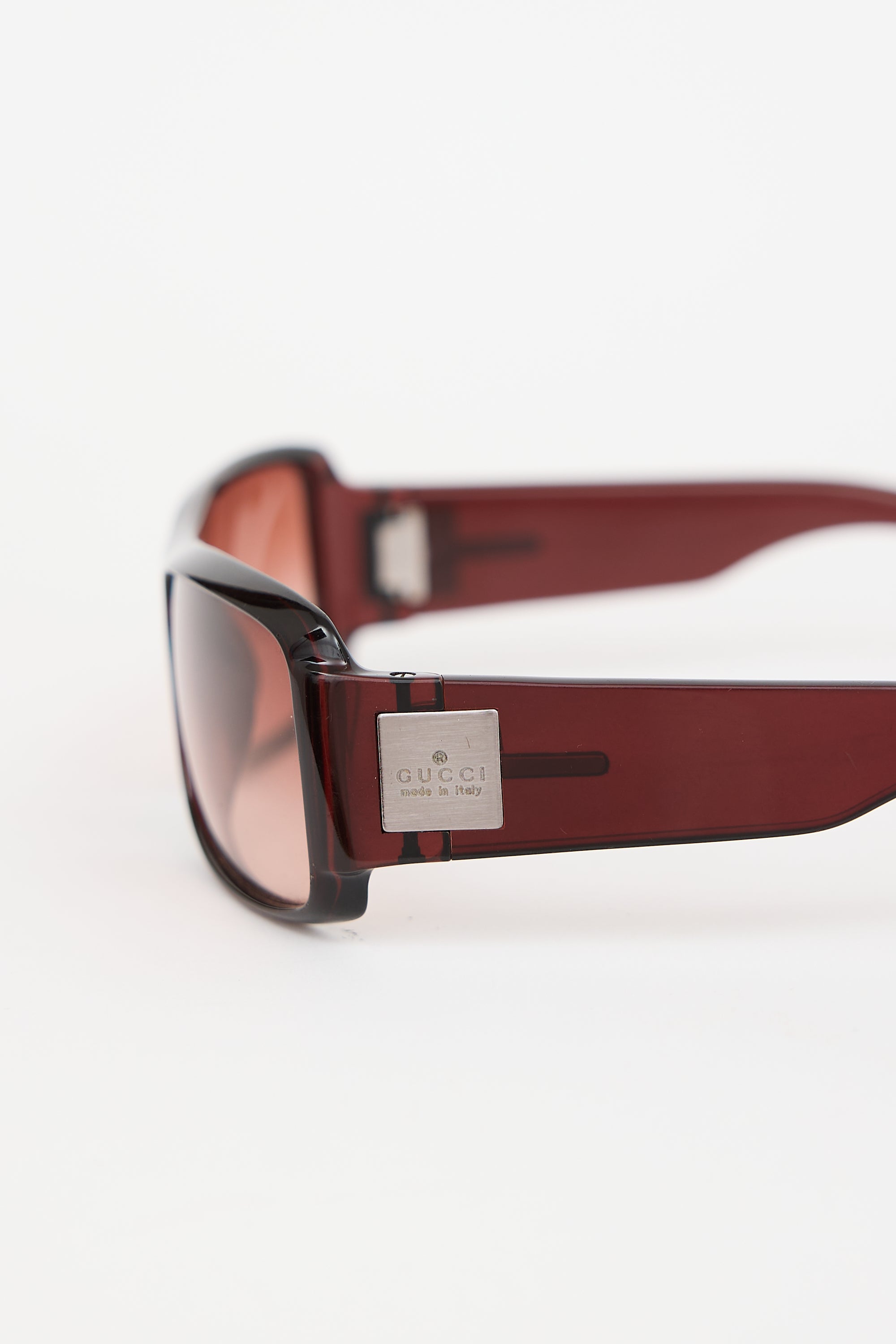 Pre-owned Gucci burgundy sunglasses featuring gradient tinted lenses, acetate rectangular frame, and silver tone logo accent at temples. Comes with original case and wipe cloth.