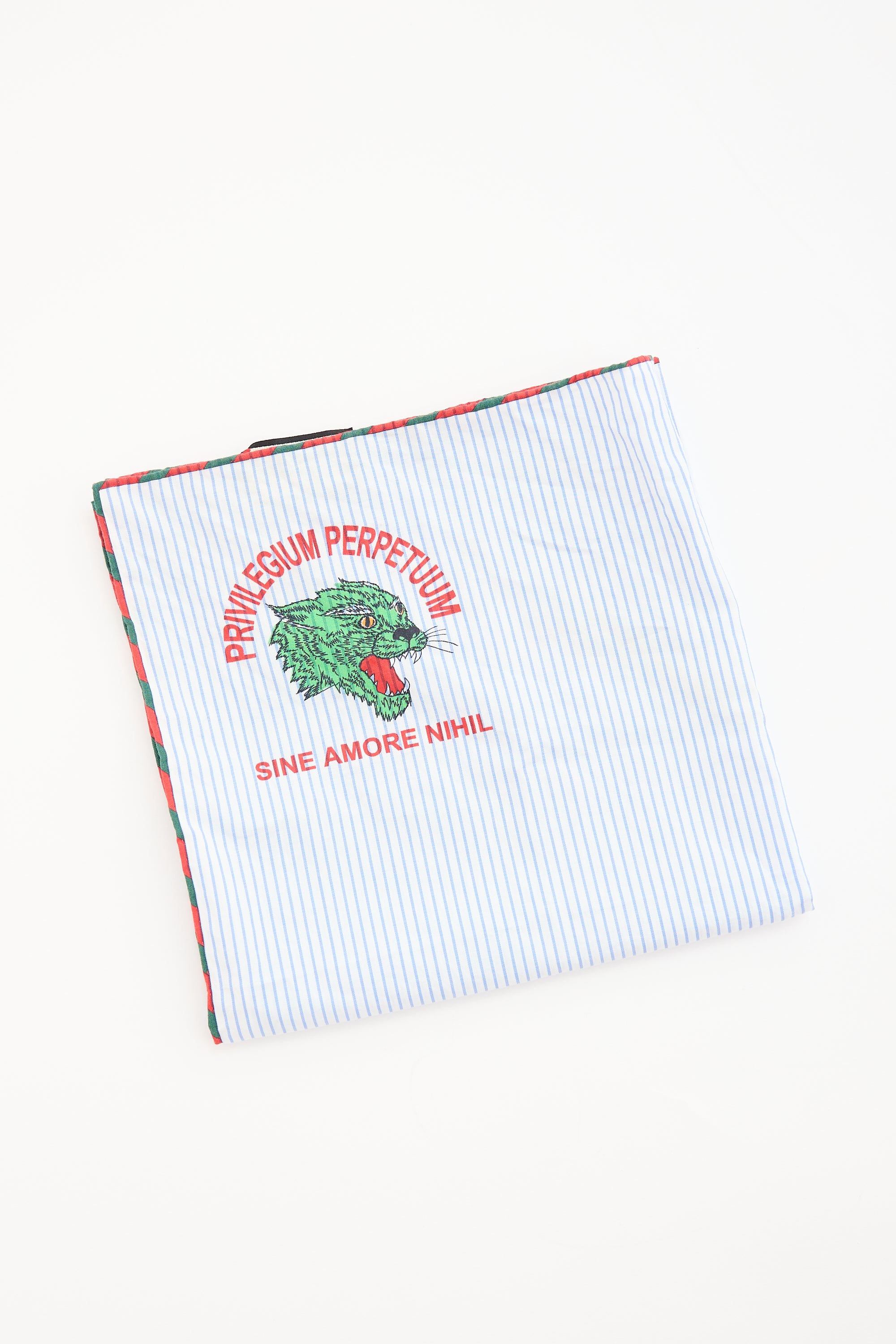 Pre-owned Gucci square scarf featuring white and blue striped pattern, printed red script and green panther motif in upper left corner, and hand rolled red and green edges.