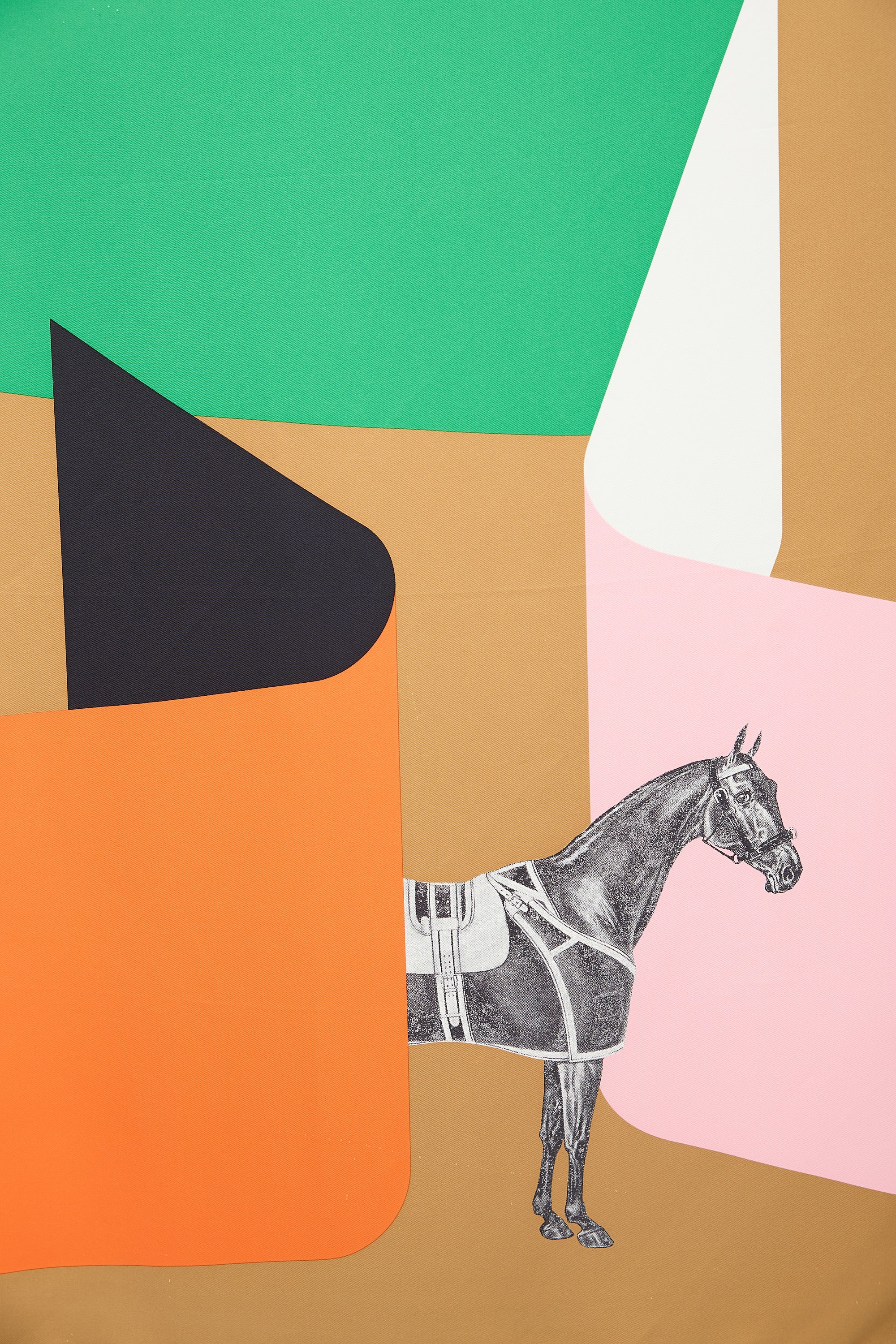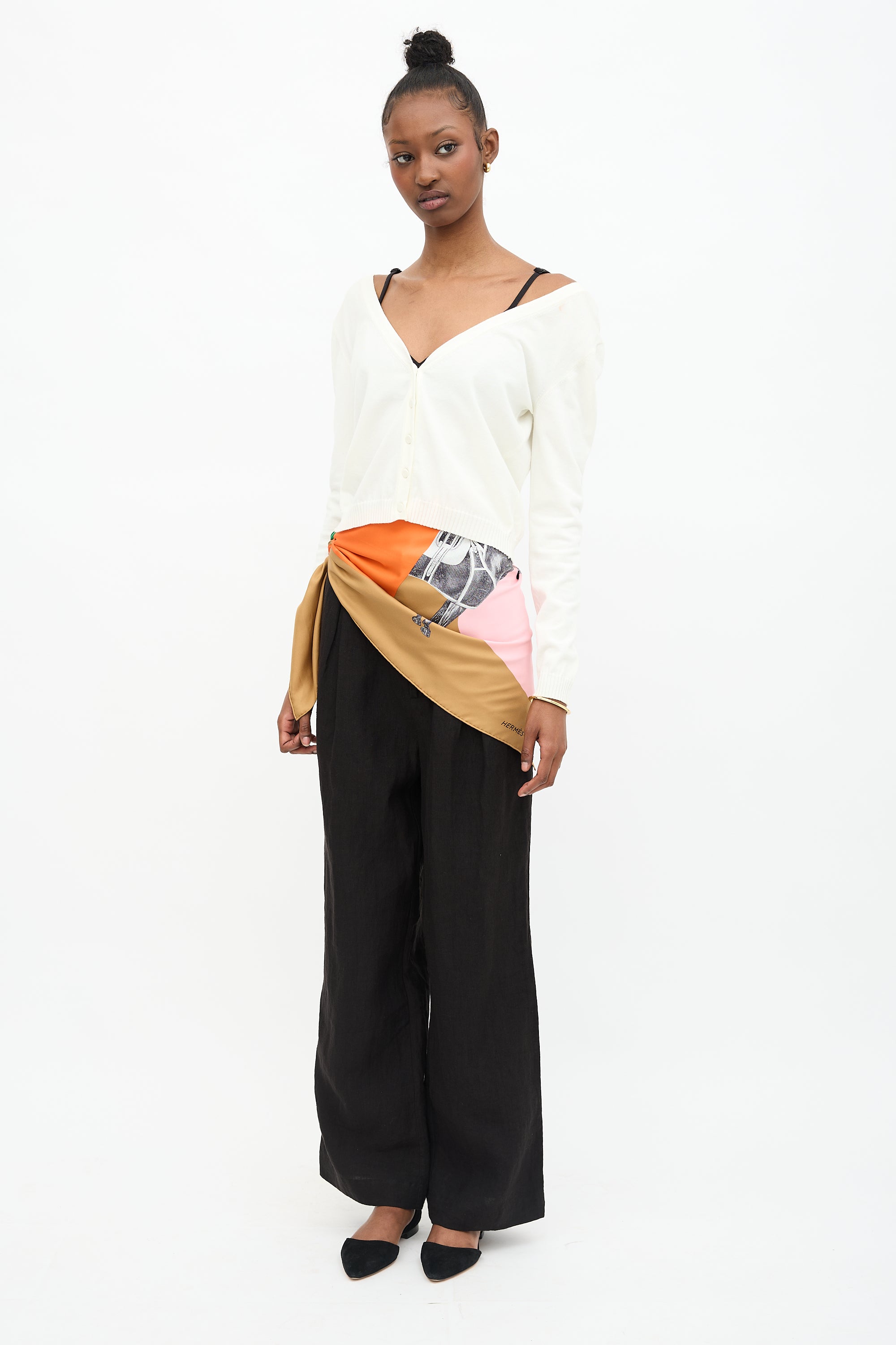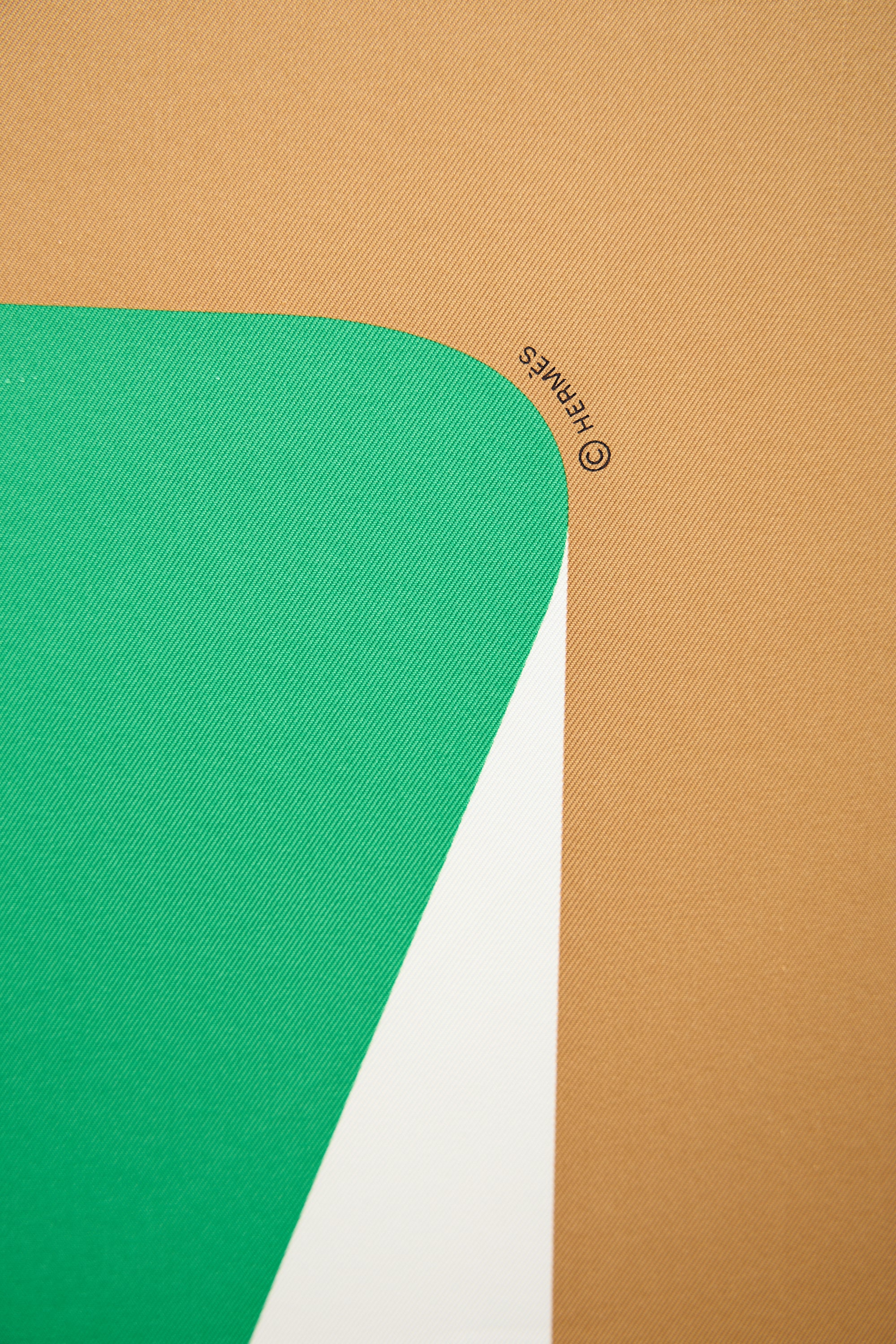 Pre-owned Hermès brown and multicolour silk scarf featuring La Serpentine de Pierre print by Pierre Charpin, graphic strip and horse motif, and hand rolled edges.