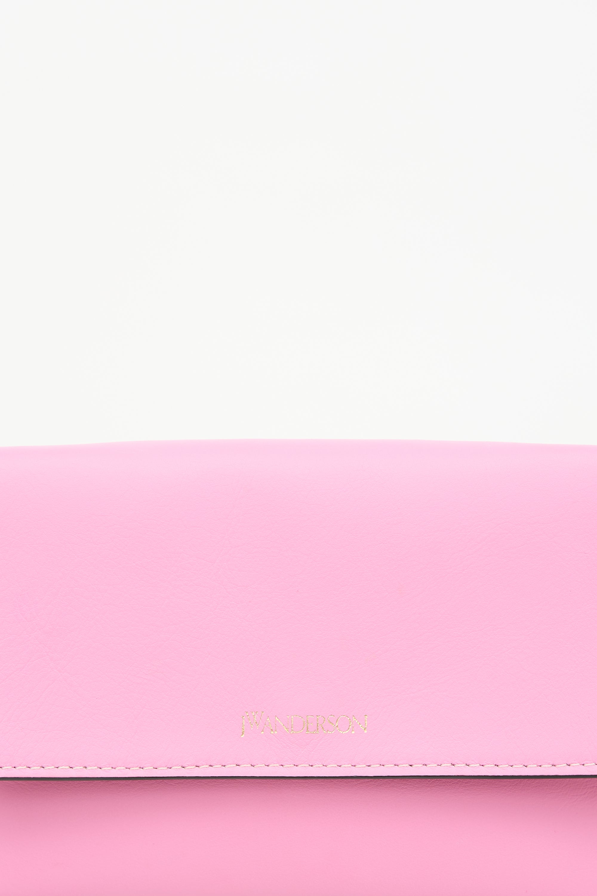 Pre-owned JW Anderson pink leather Phone bag featuring gold stamped logo at front, adjustable shoulder strap with gold tone chain detail, front flap with snap closure, back slip pocket, and one main compartment.