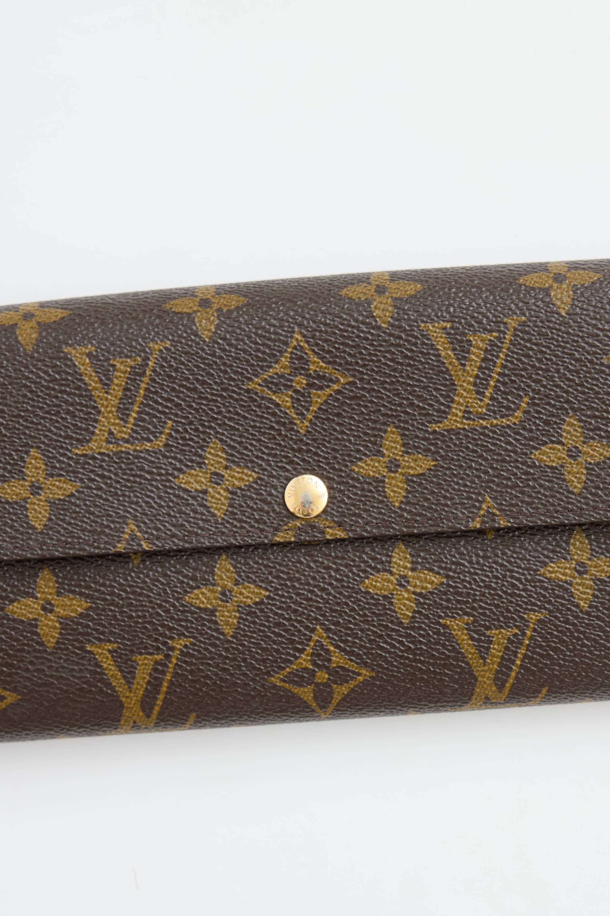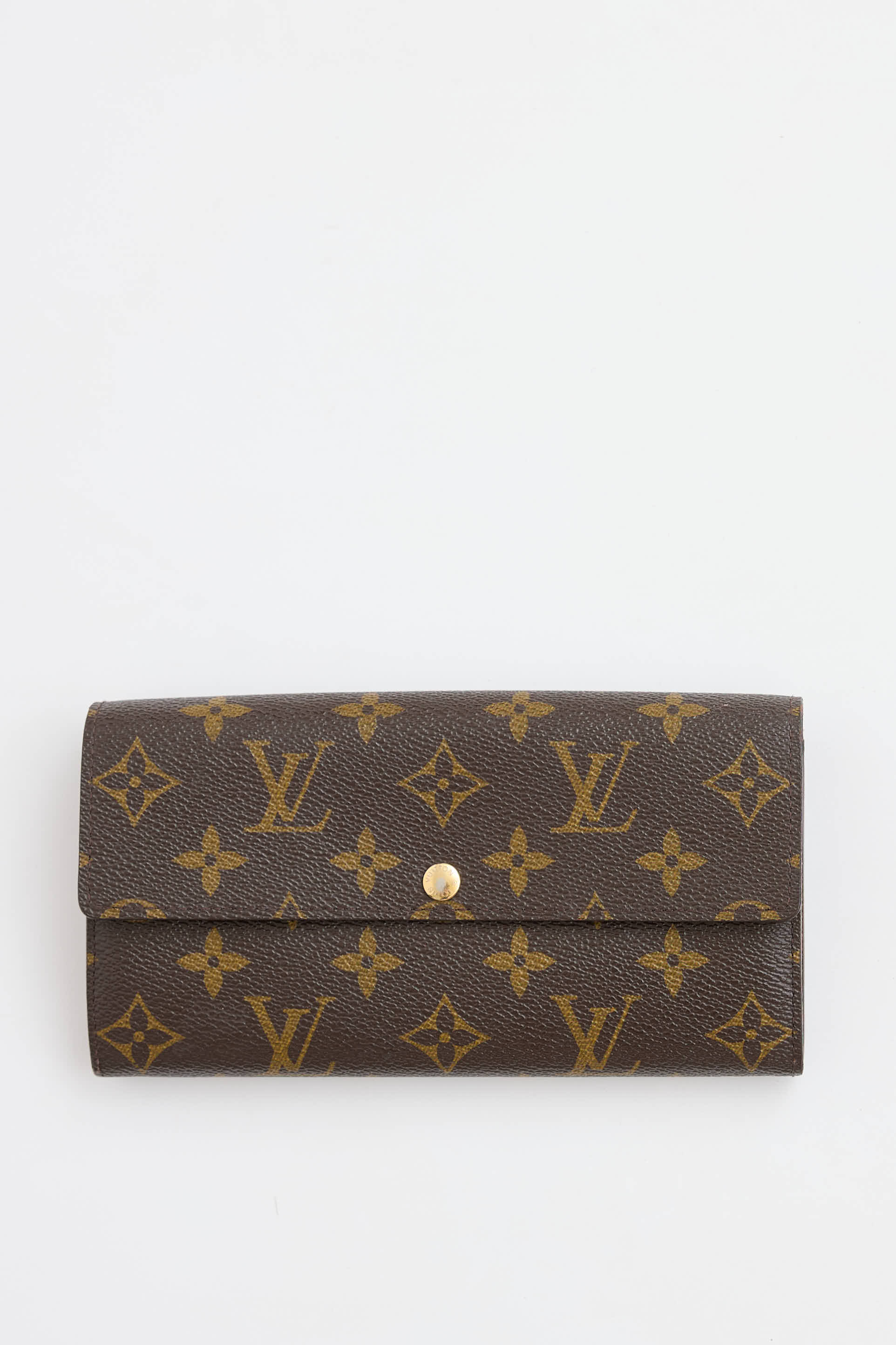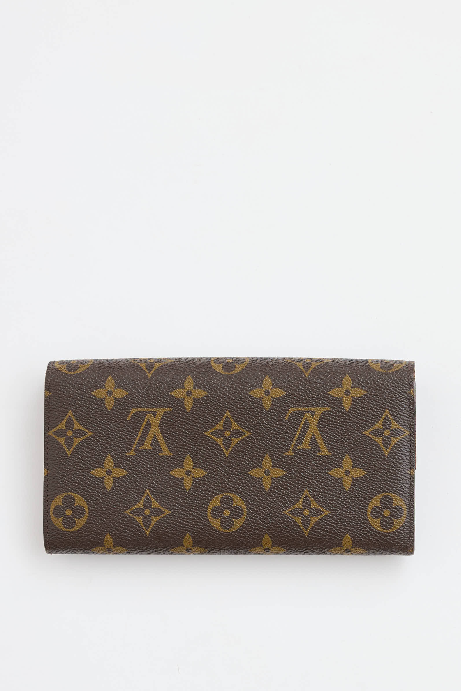 Pre-owned Louis Vuitton 2011 brown Sarah wallet featuring signature monogram throughout, top flap with snap closure, two main compartments, zip pocket at middle, ten card slots, and one bill slot. Entrupy certificate included.