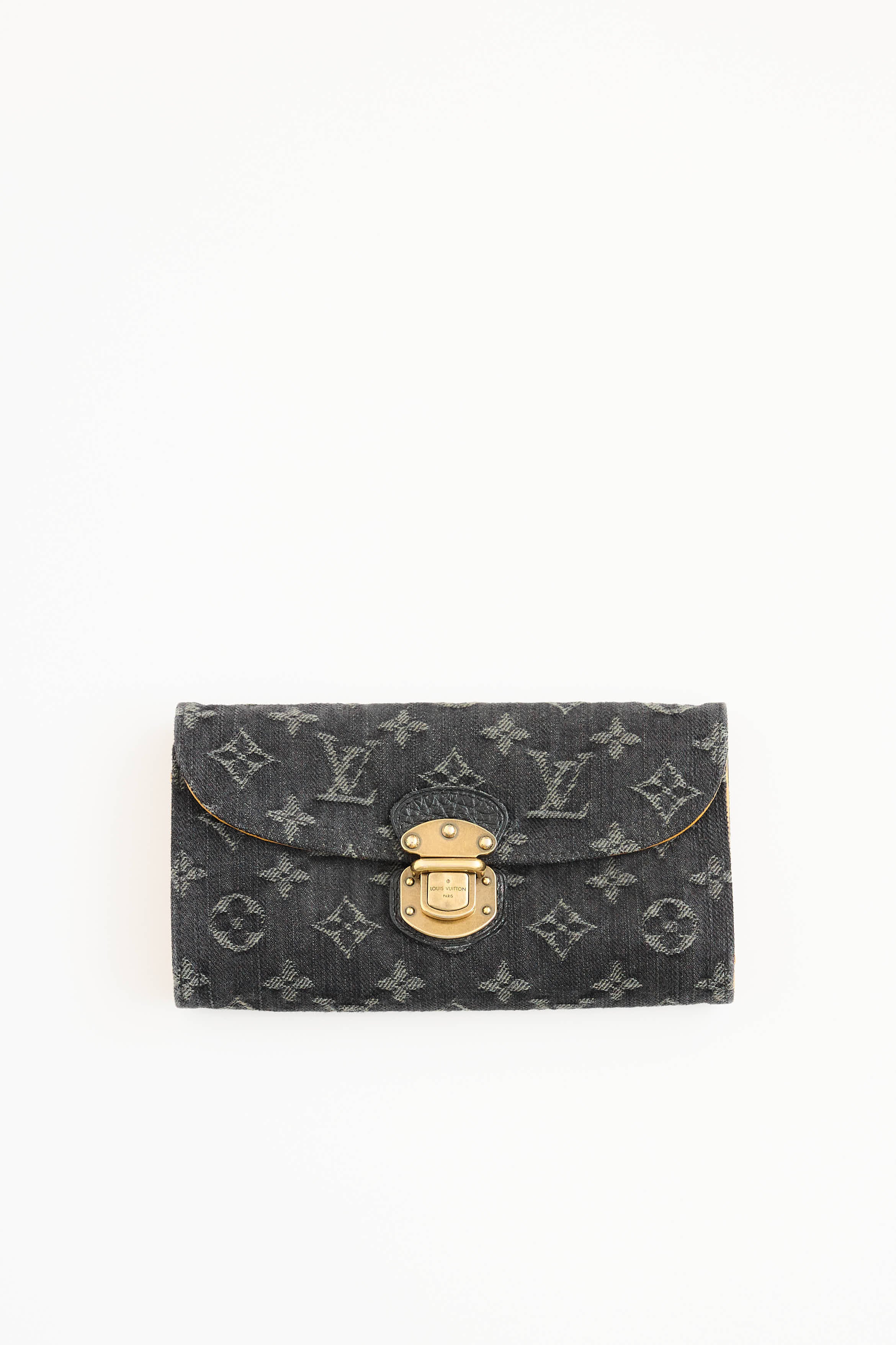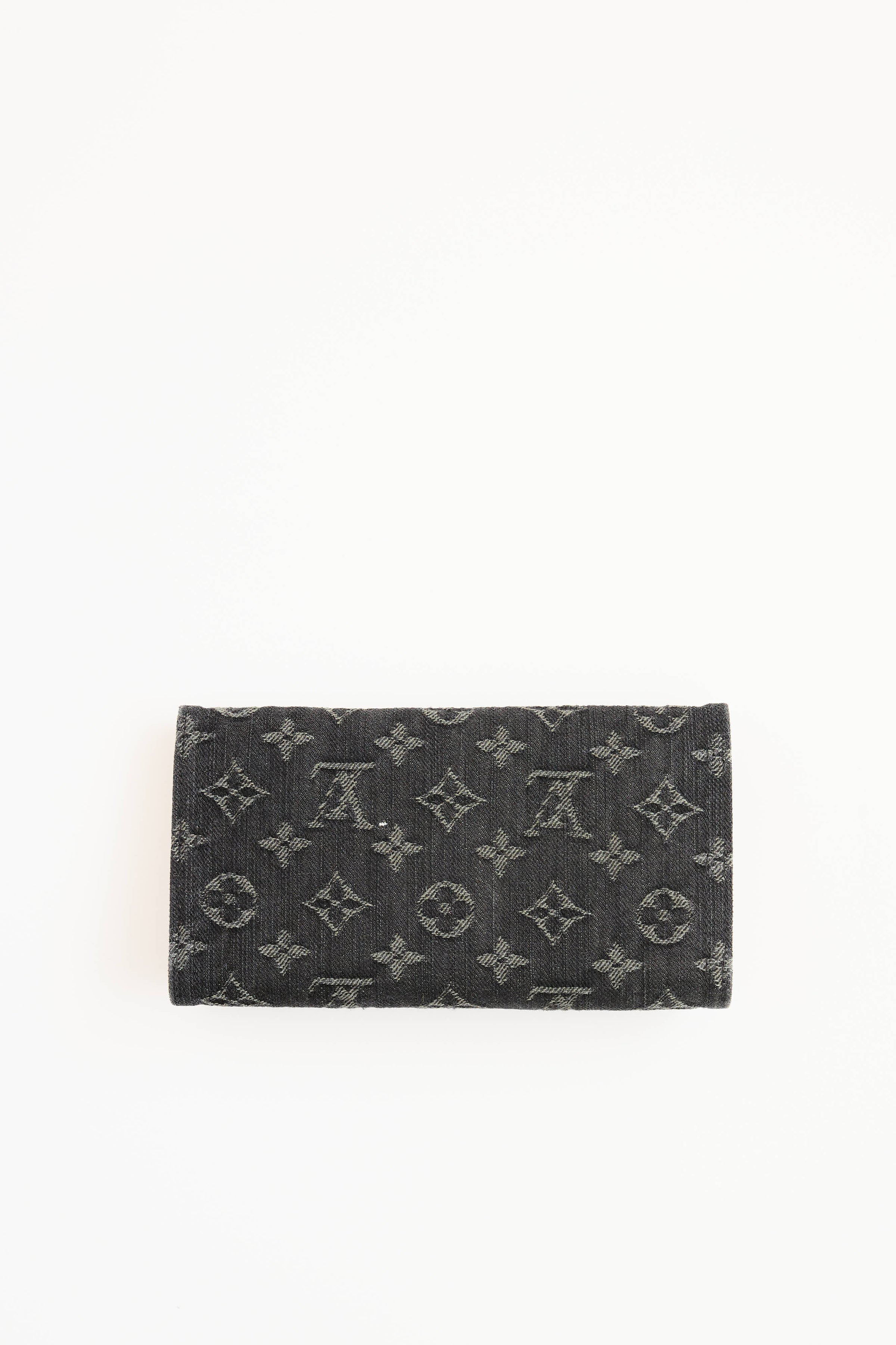 Pre-owned Louis Vuitton black denim Amelia wallet featuring signature LV monogram, push lock closure, 18 card slots, one zip pocket, two bill slots and two slip pocket. Includes original dust bag and box.