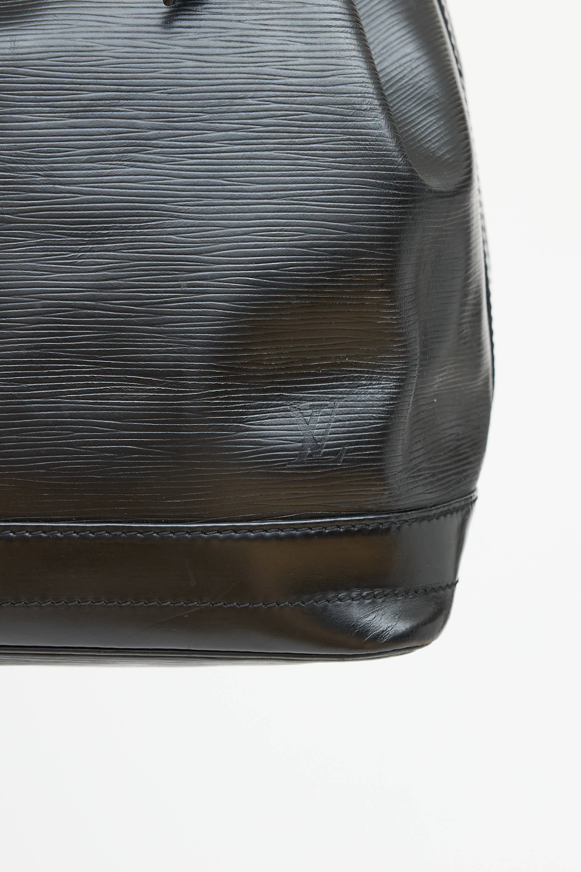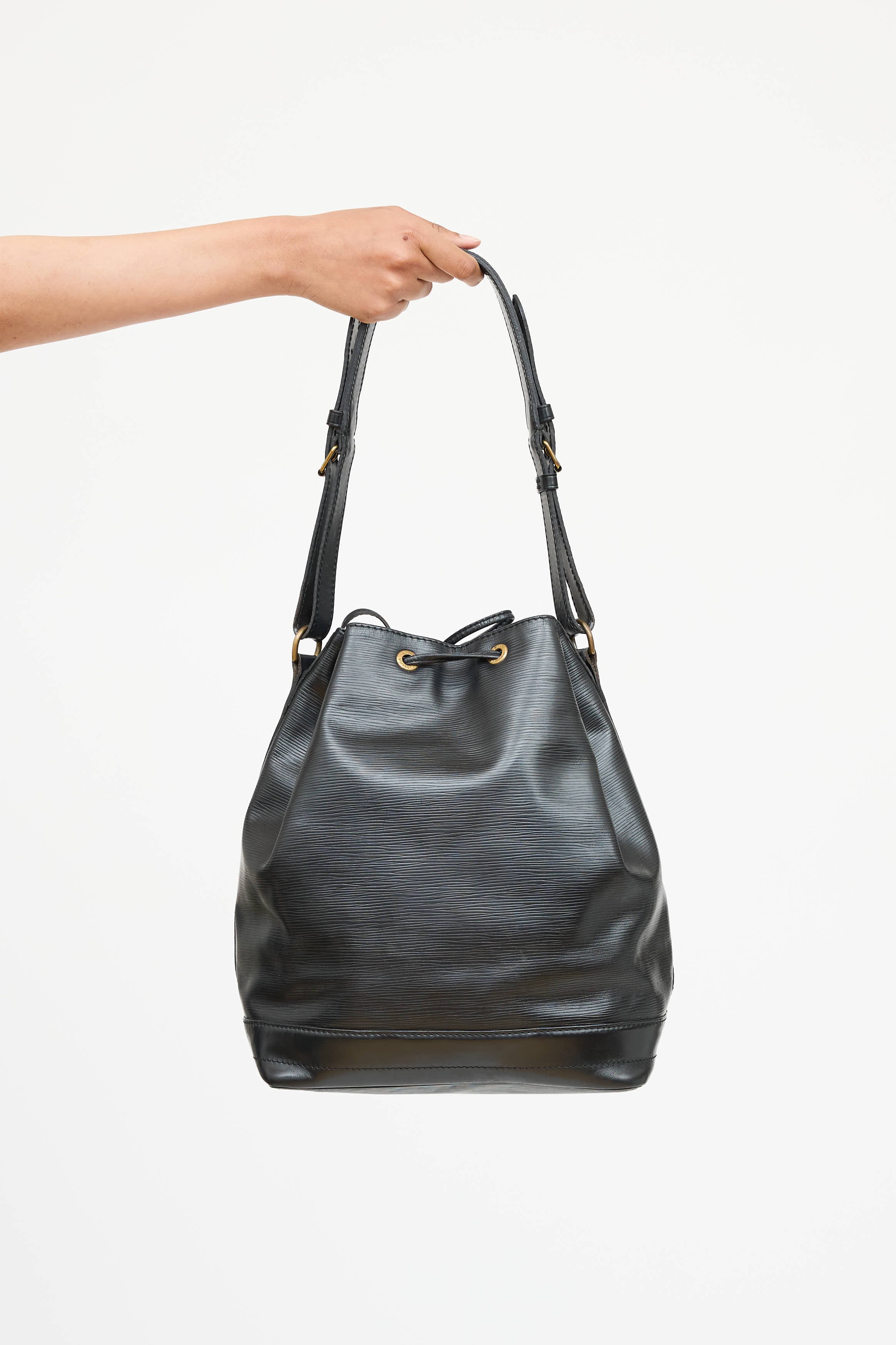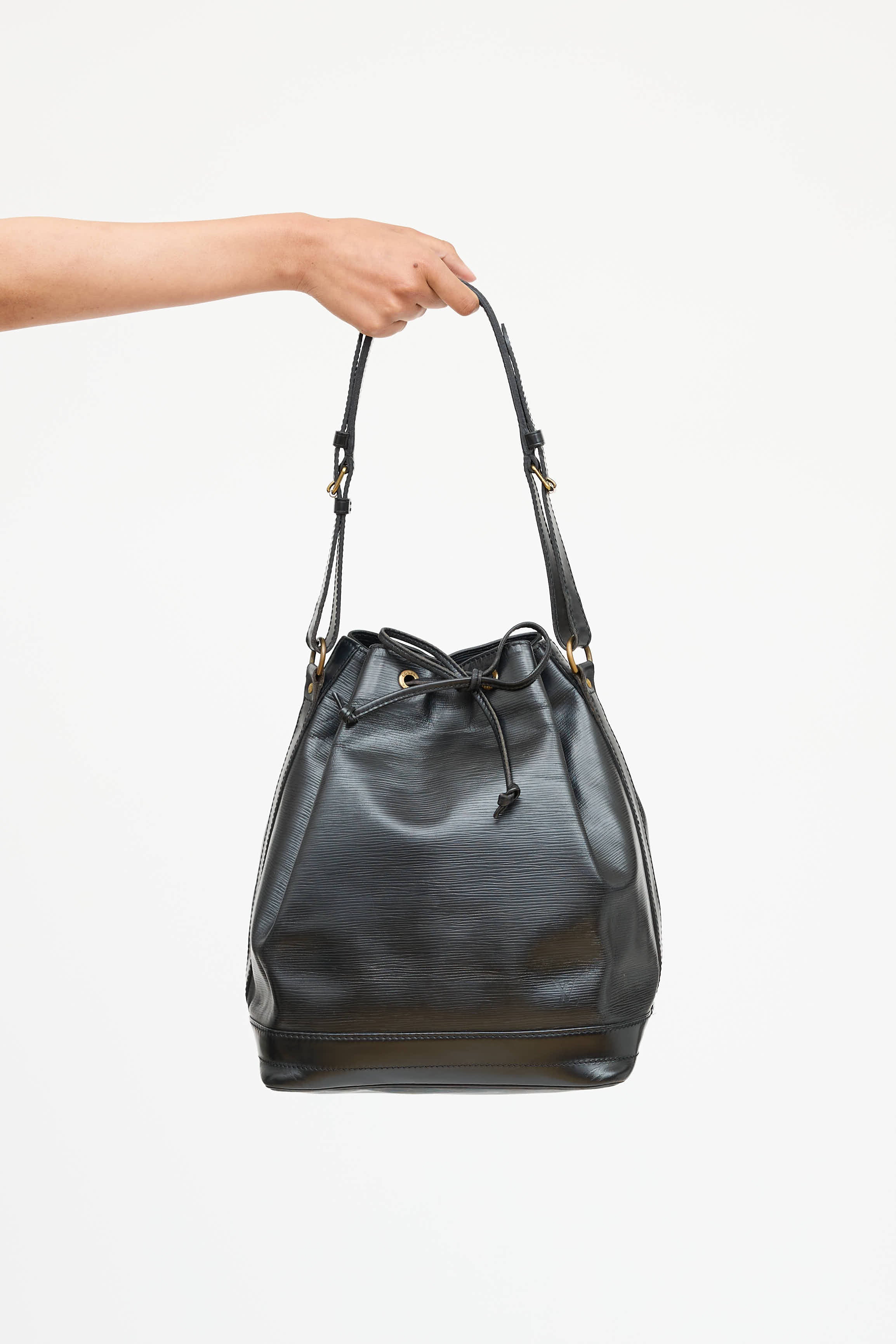 Pre-owned Louis Vuitton Noé bucket bag featuring signature Epi leather in black, adjustable shoulder strap, one main compartment with one zip pocket, embossed logo at side and bottom, gold tone hardware, and top cinch closure.