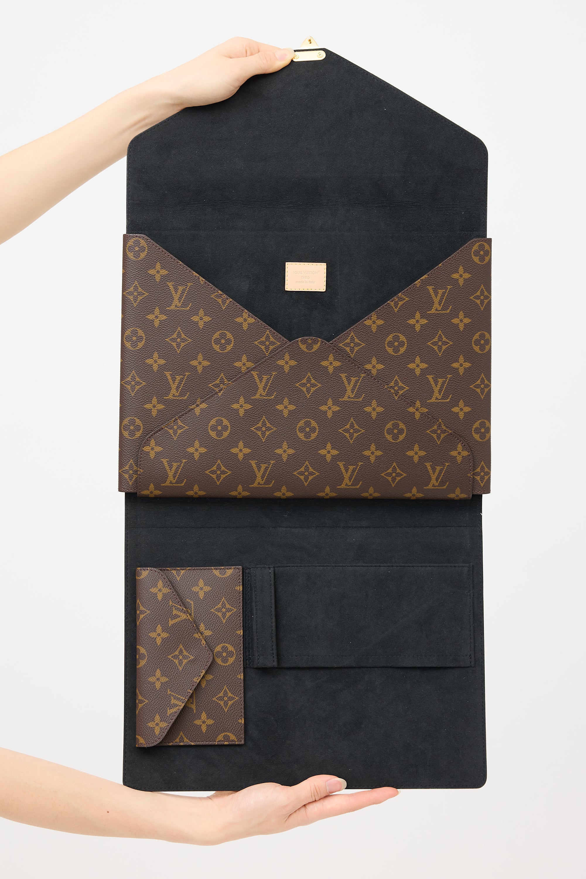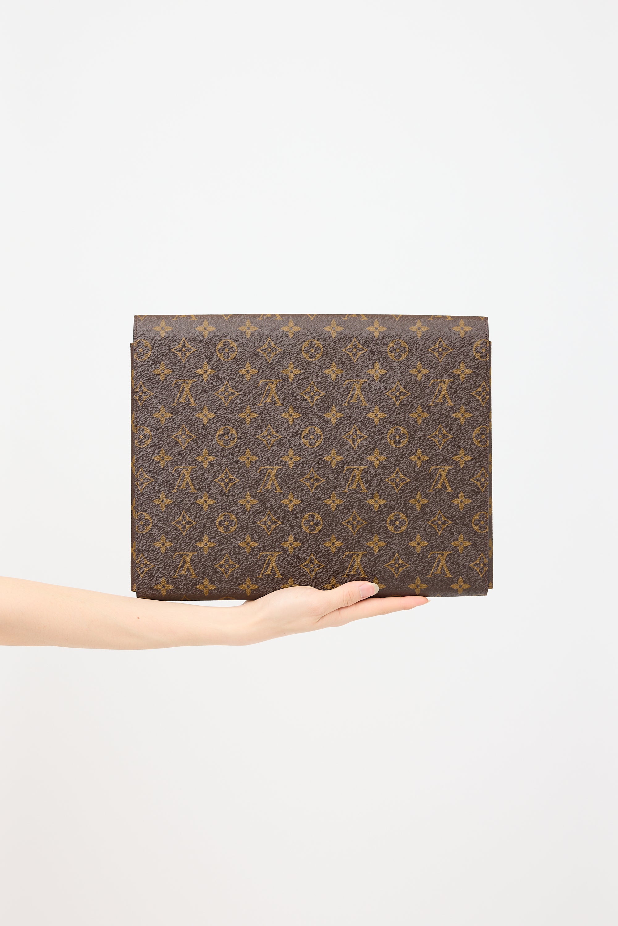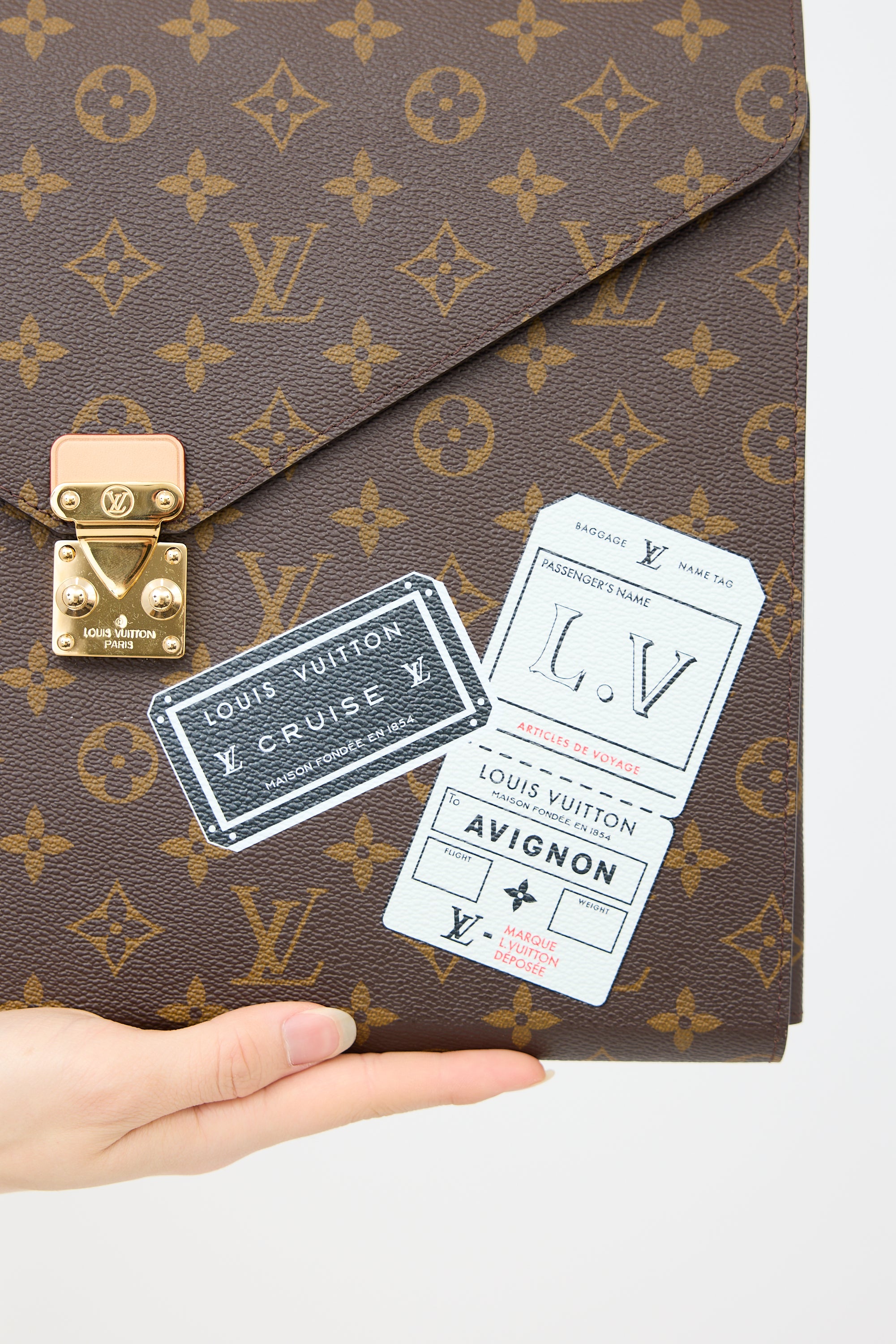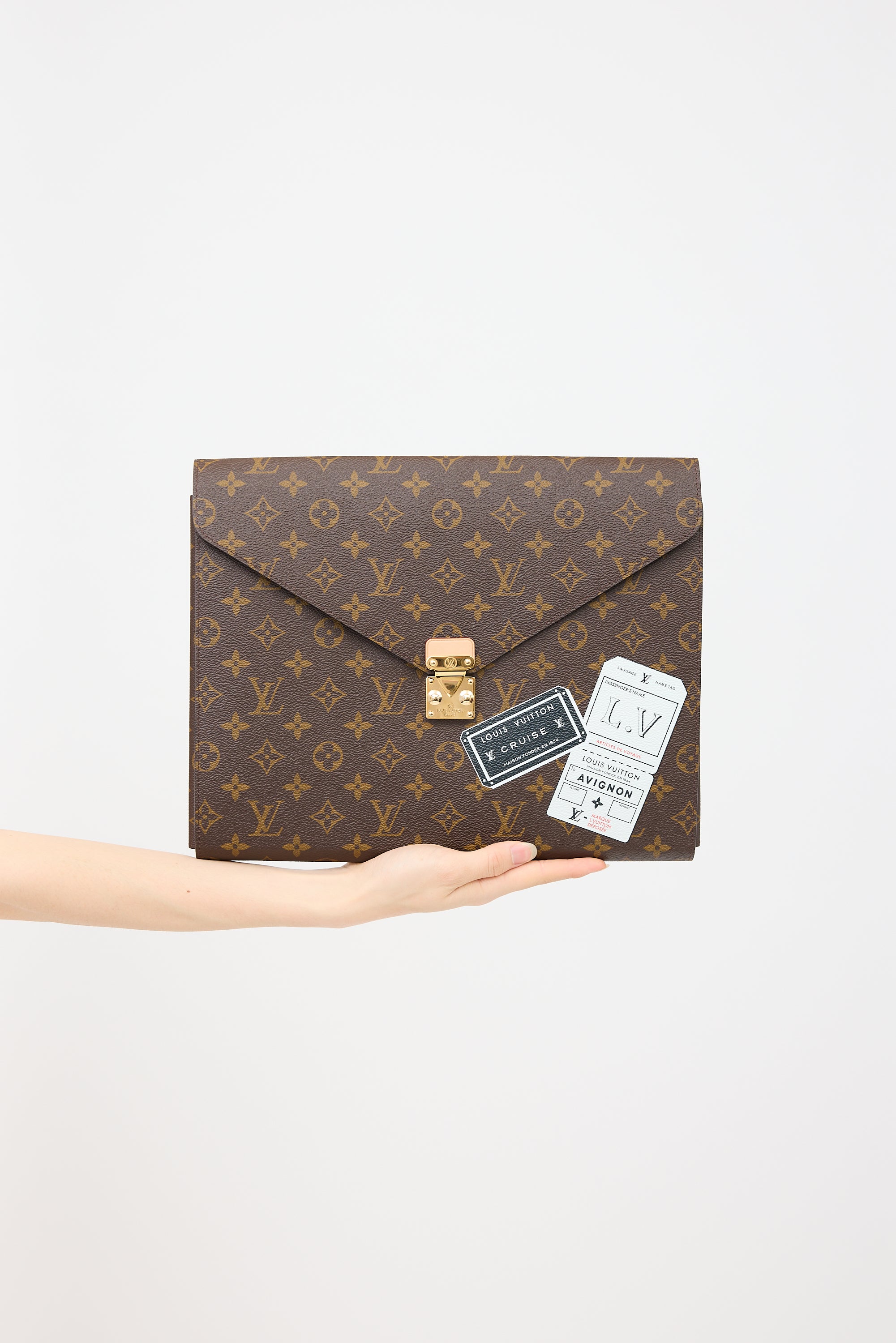 Pre-owned Louis Vuitton brown Mark pouch featuring signature monogram coated canvas, Cruise stickers motif at front, push lock closure, black suede lining, and interior compartment included one document compartment, one pen holder, one slip pocket, and one buttoned pocket.