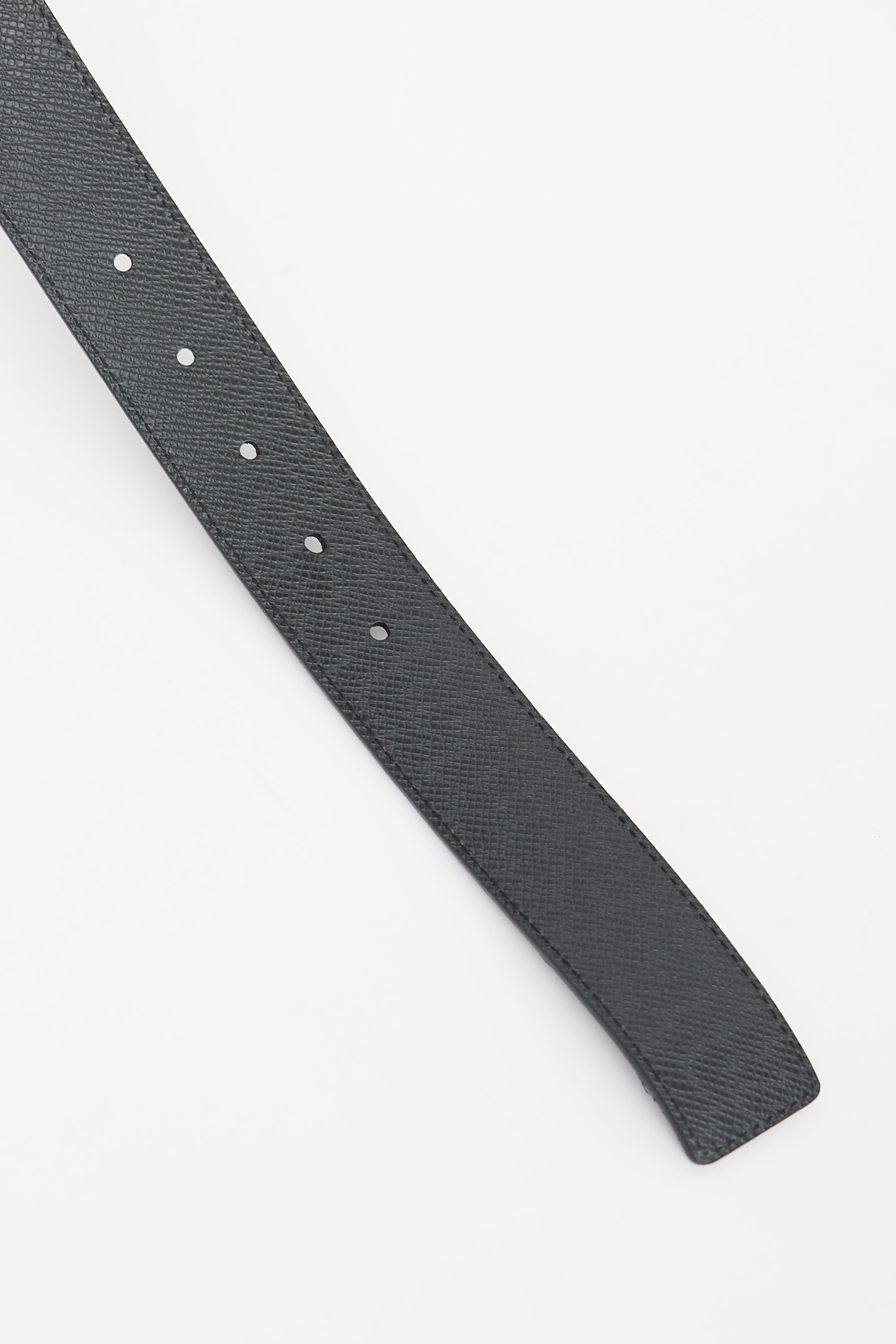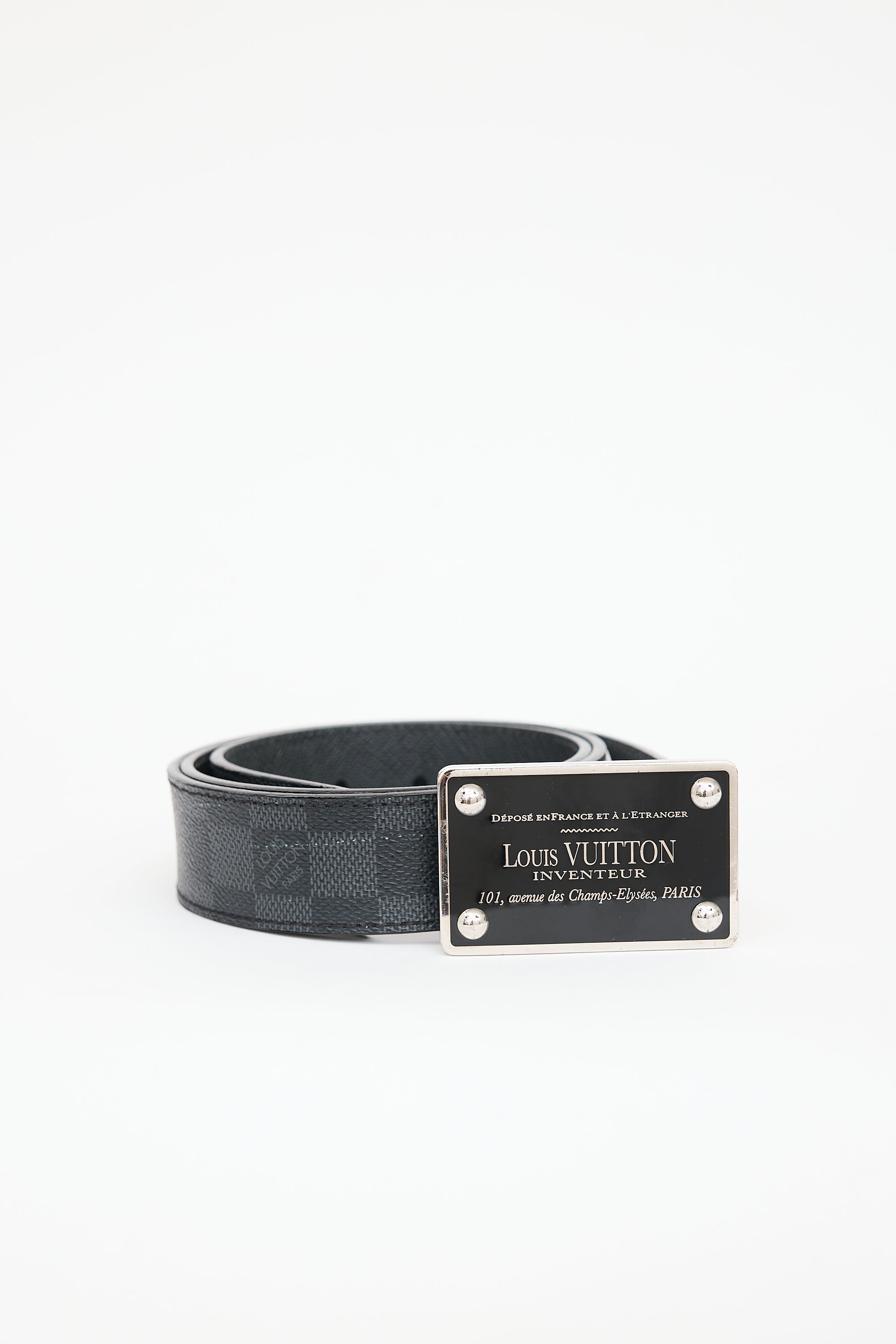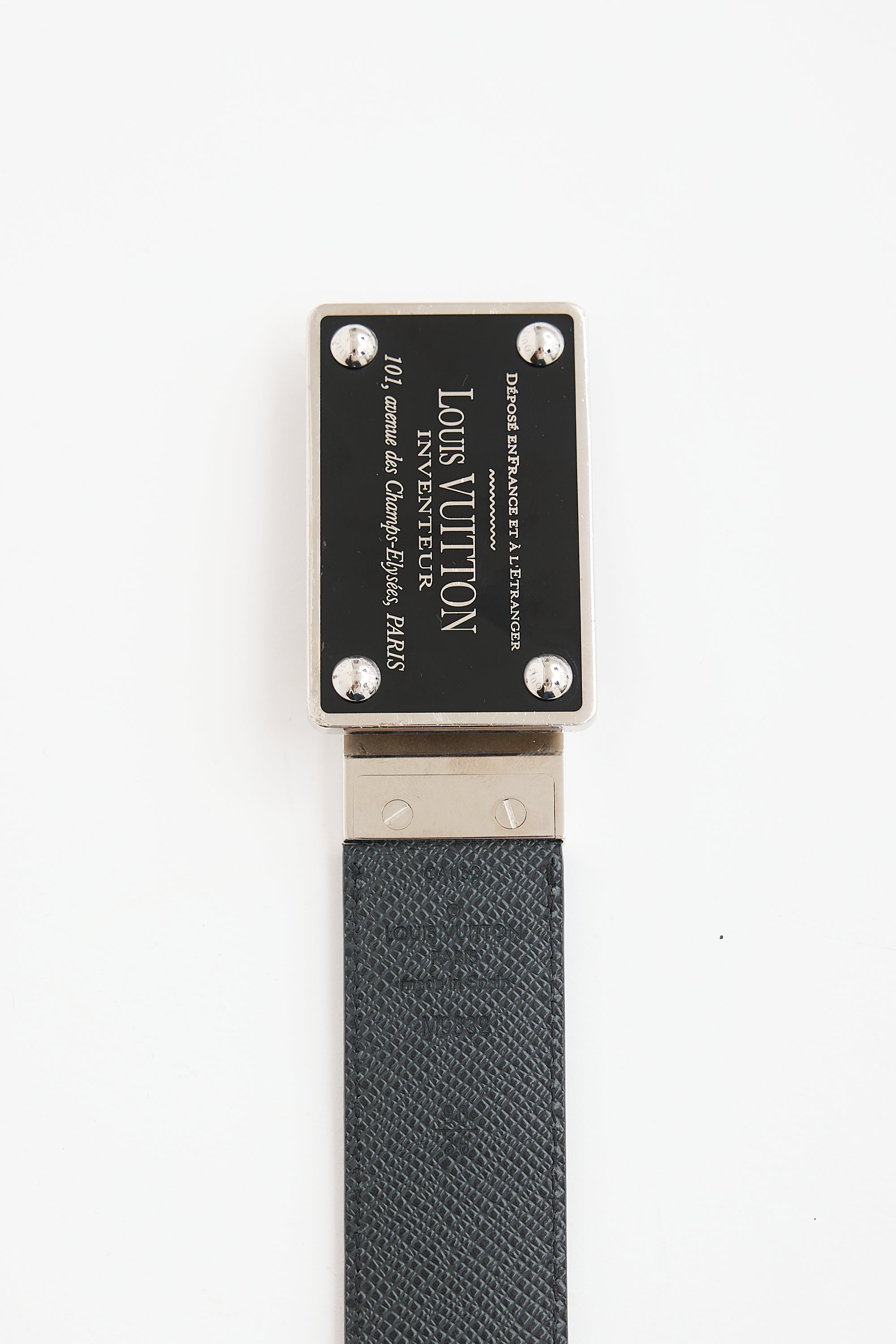 Pre-owned Louis Vuitton Reversible Inventeur belt featuring coated canvas strap with signature Damier Graphite, black reverse, silver tone swivel buckle with inset black Inventeur plaque, and push pin closure.