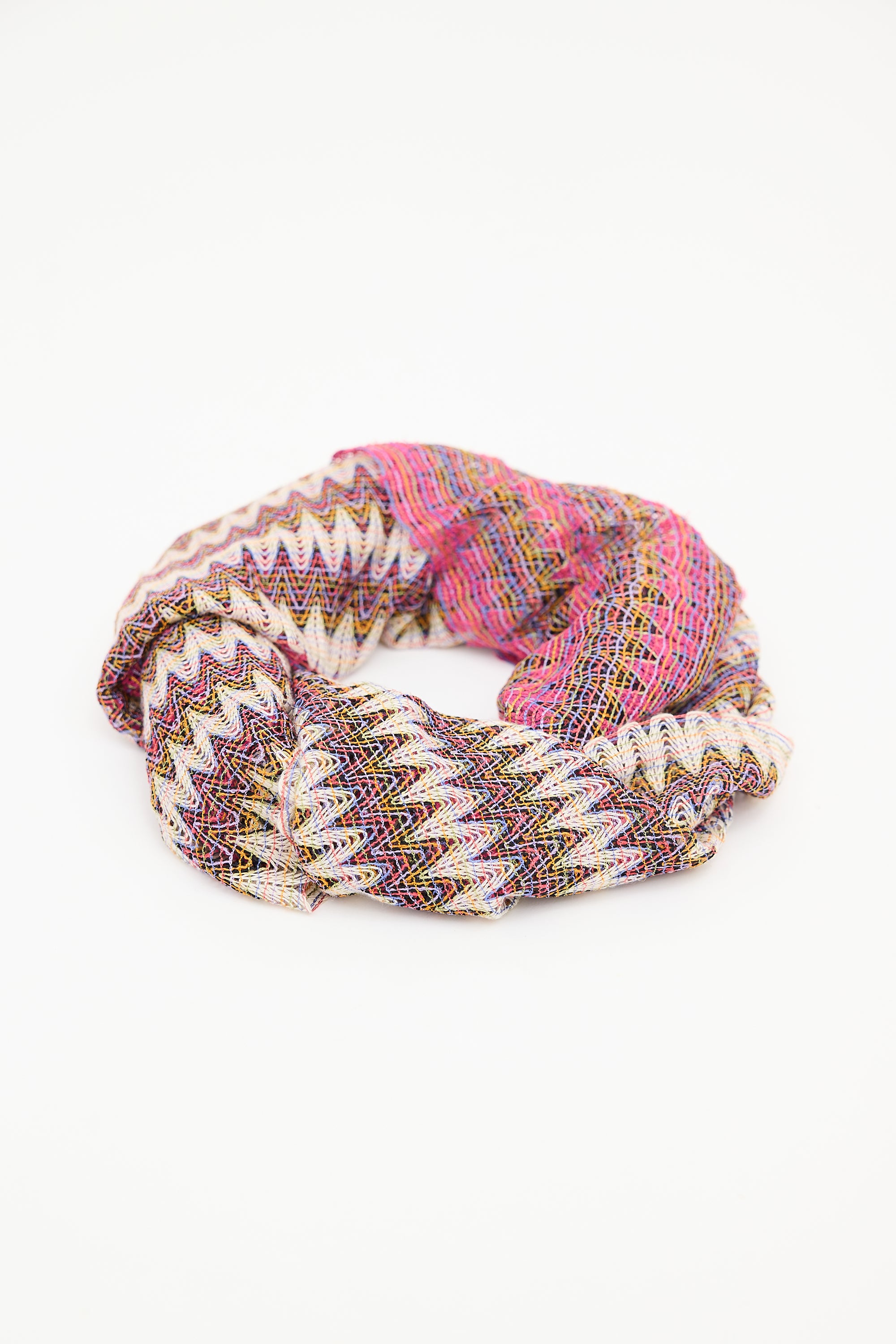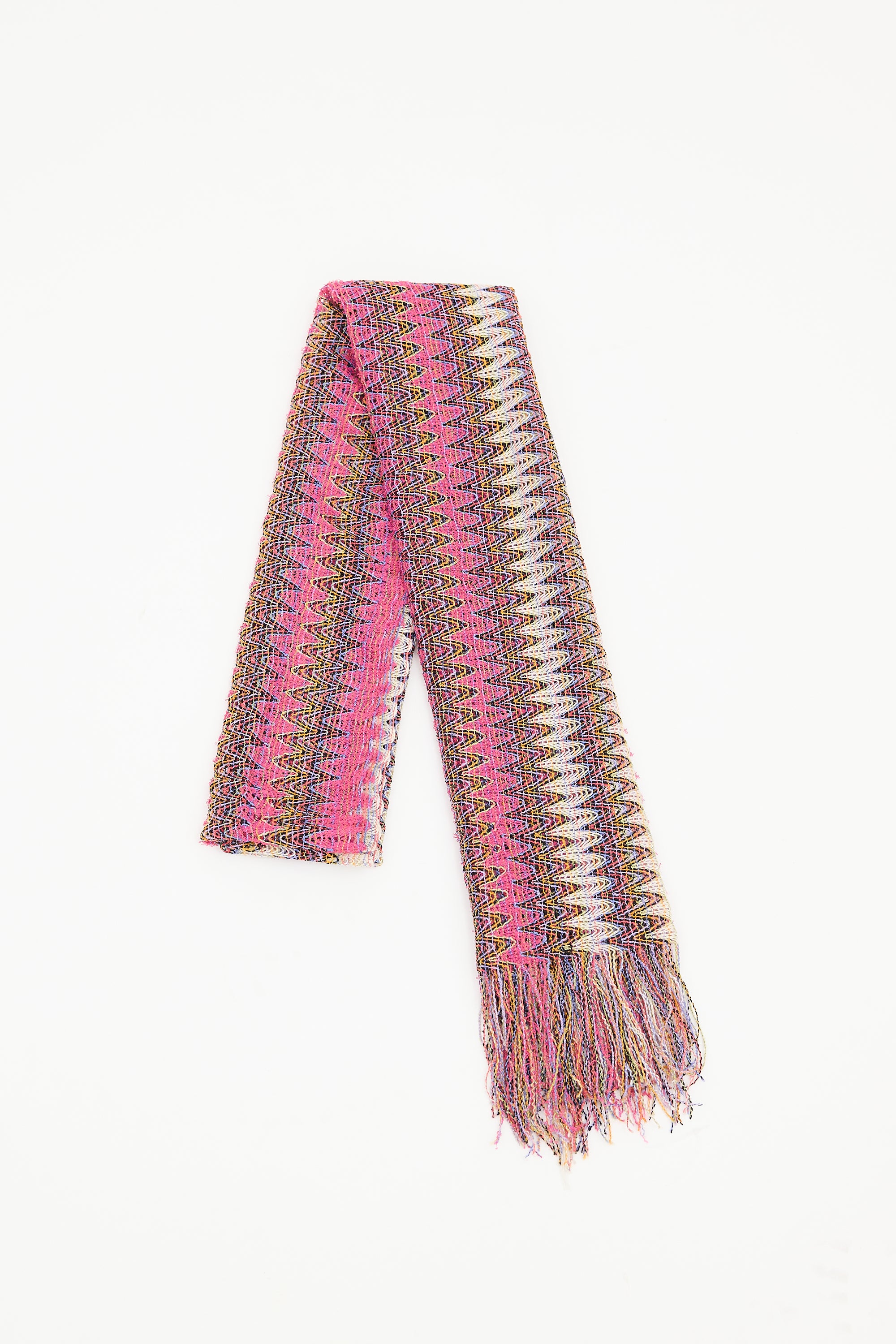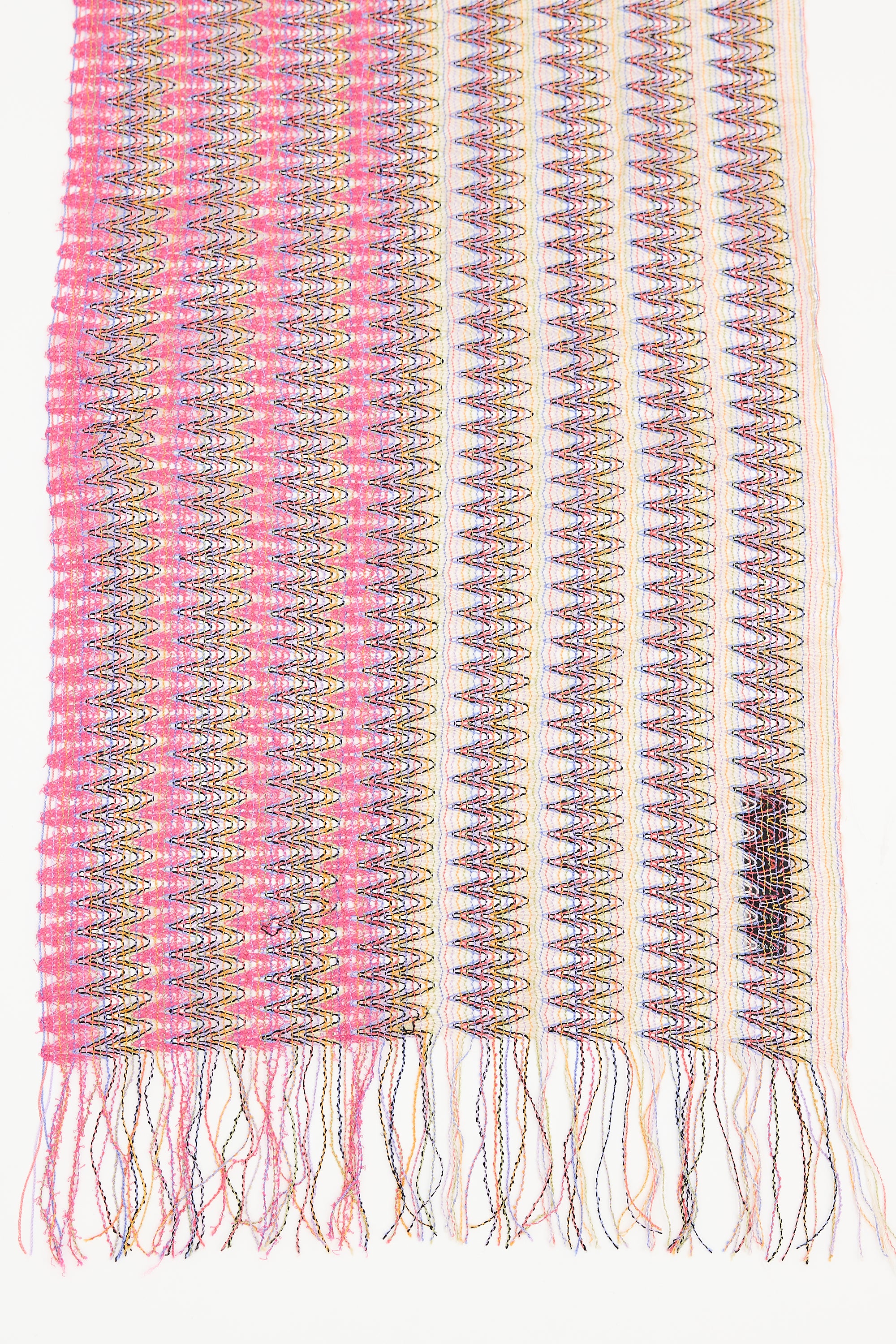 Pre-owned Missoni fuchsia and multicolour scarf featuring open knit, wave motif, fringe at ends, and logo tab at reverse.