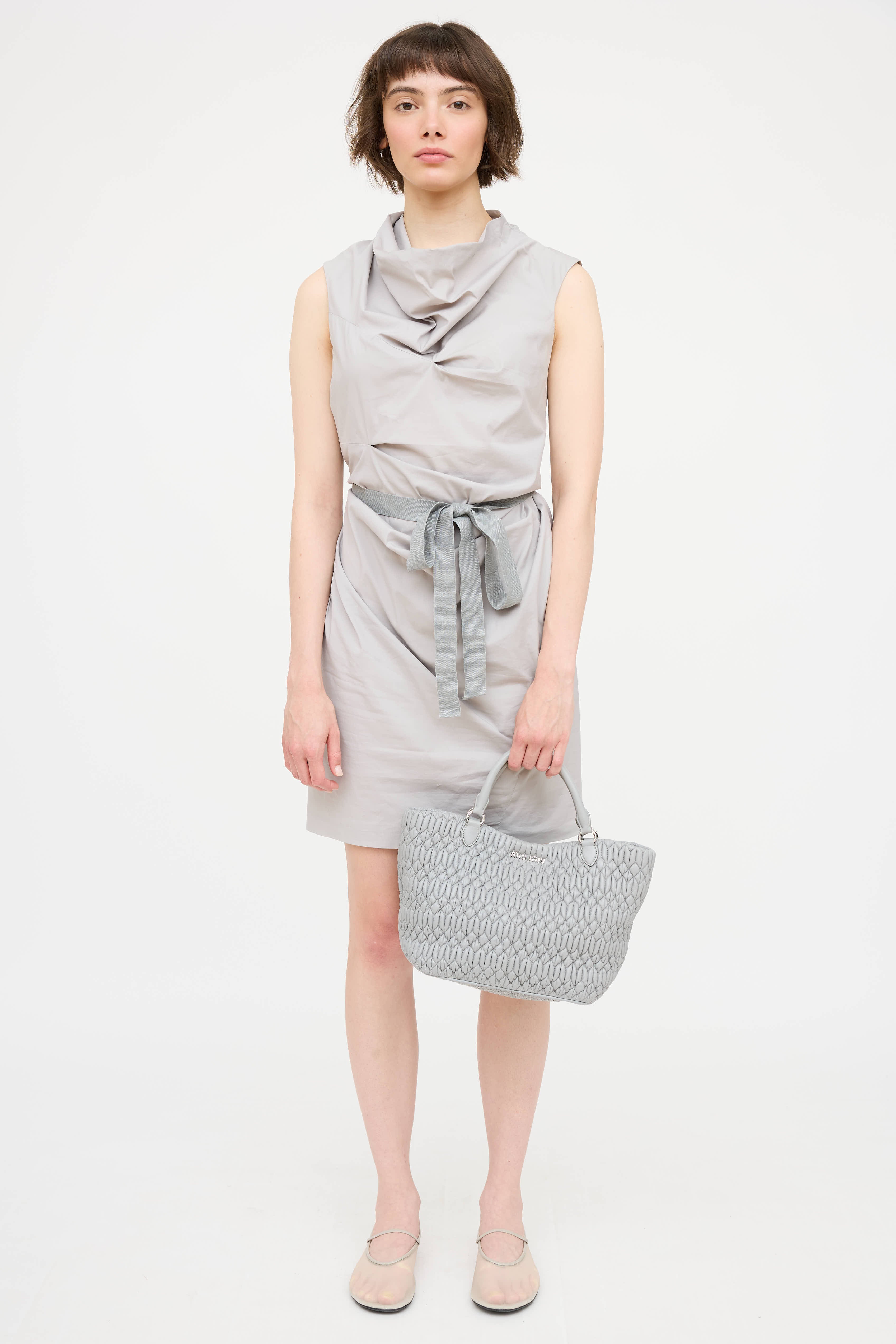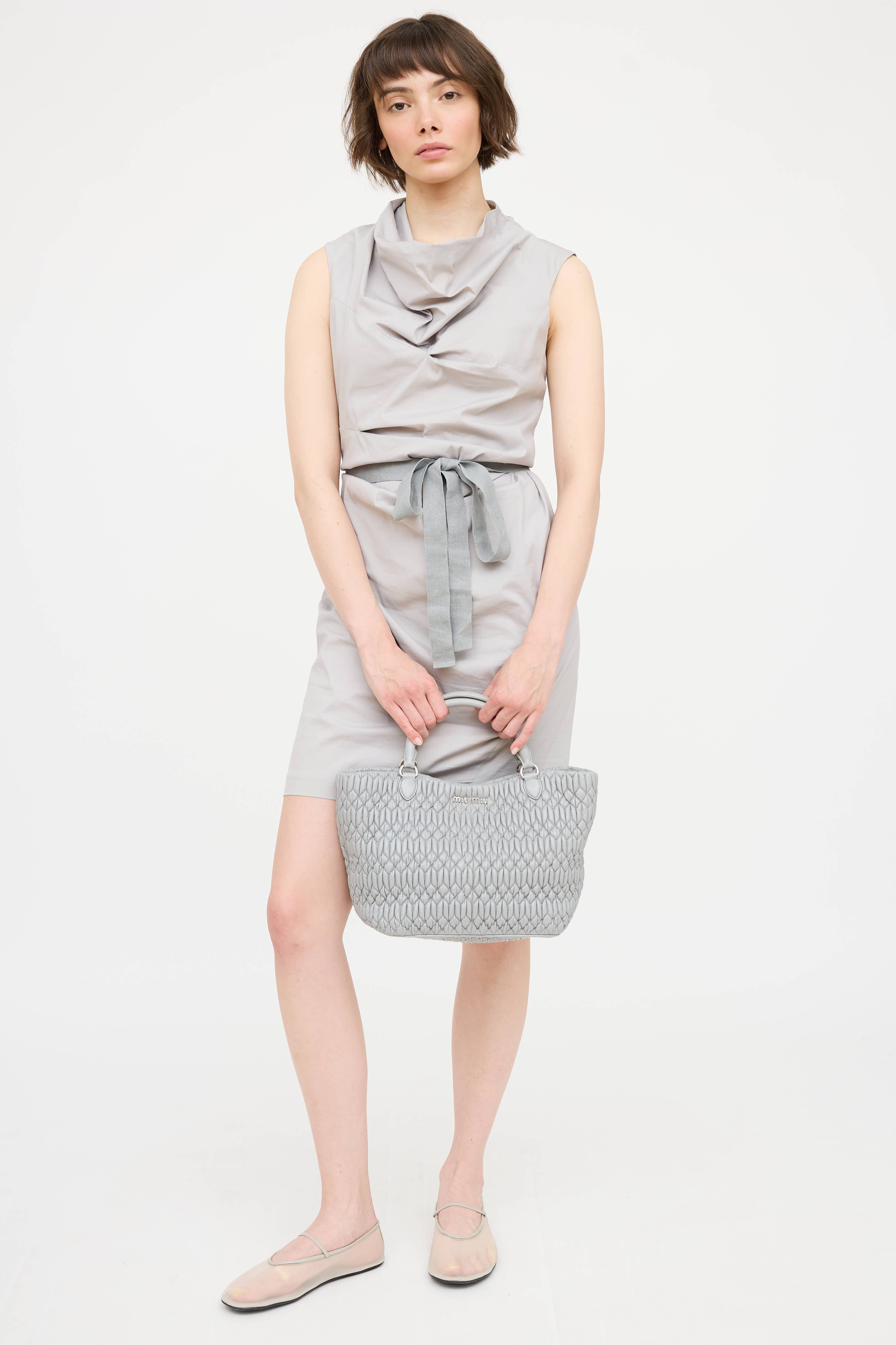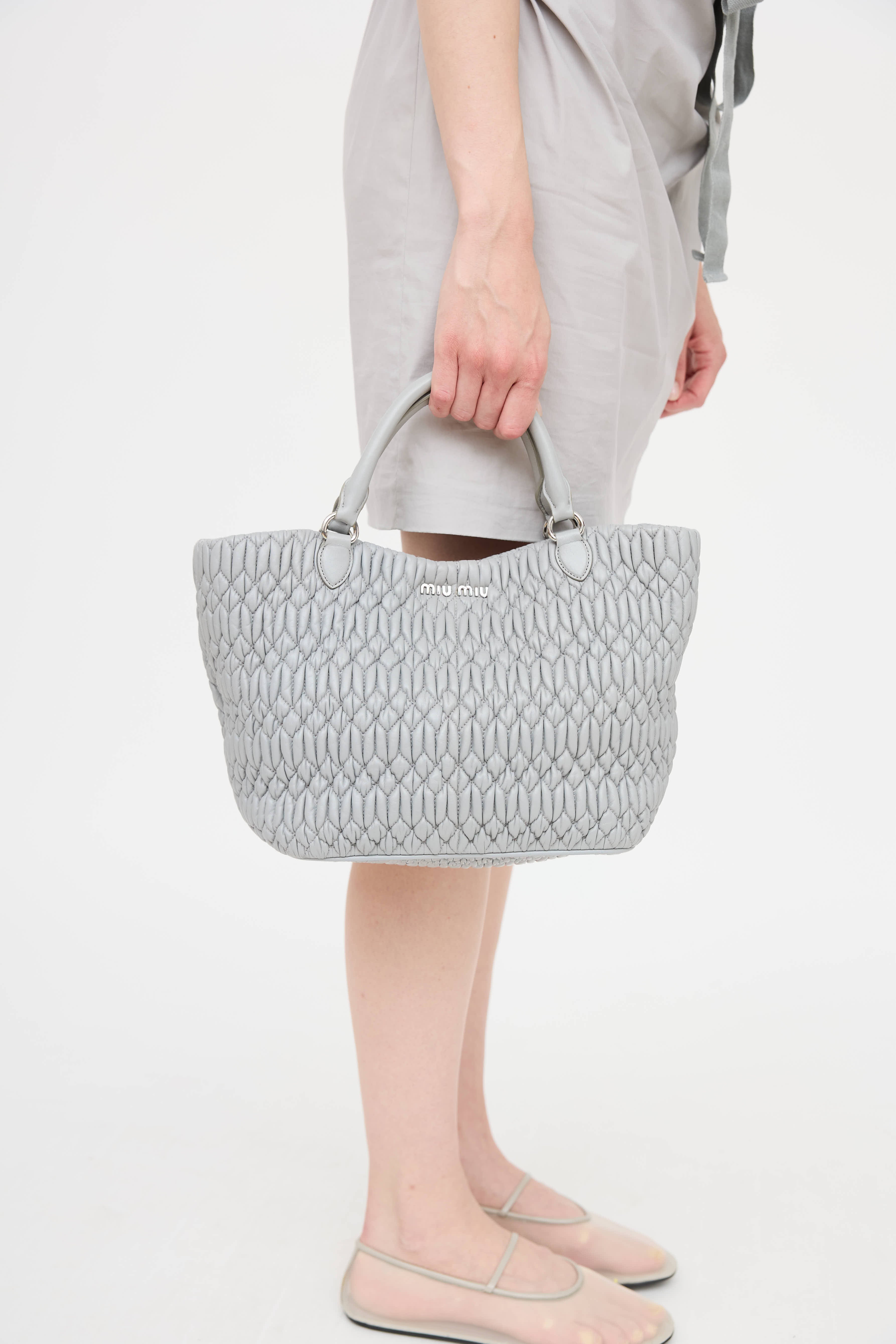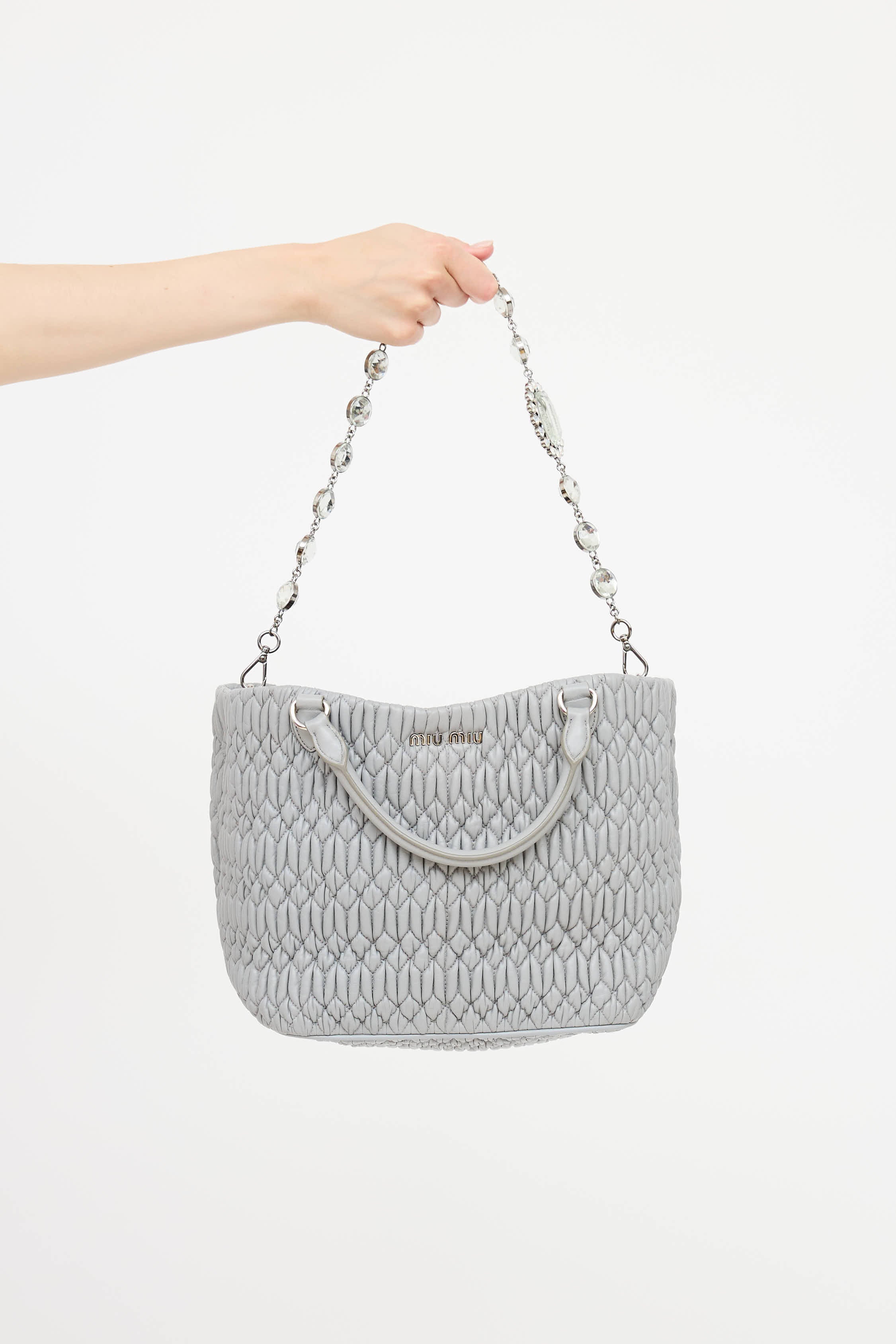 Pre-owned Miu Miu grey Mattelasse tote bag in Nappa leather featuring two rolled handles, one leather crossbody strap, one crystal shoulder strap, metal feet at bottom, open compartment with snap closure. Interior lined in textile with one zipper pocket and two slip pockets.