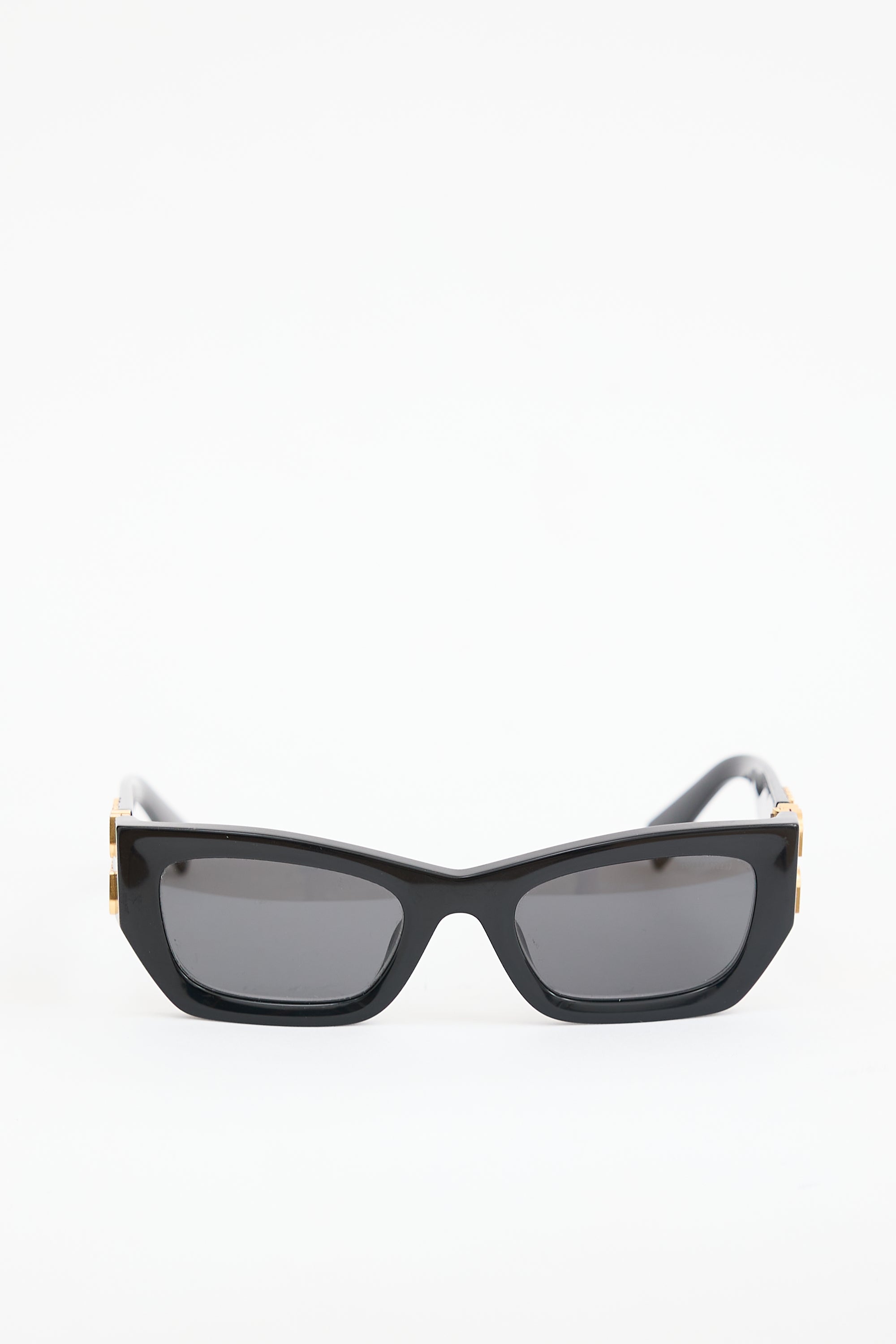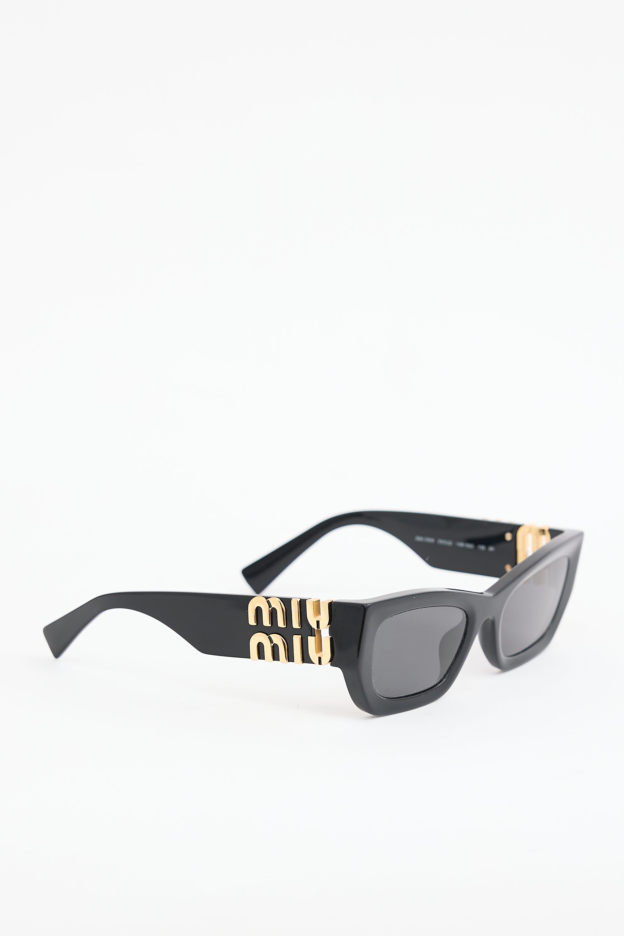 Pre-owned Miu Miu SMU09W sunglasses featuring grey tinted lenses, black geometric cat eye frame, and gold tone logo hardware at temples. Comes with original box.