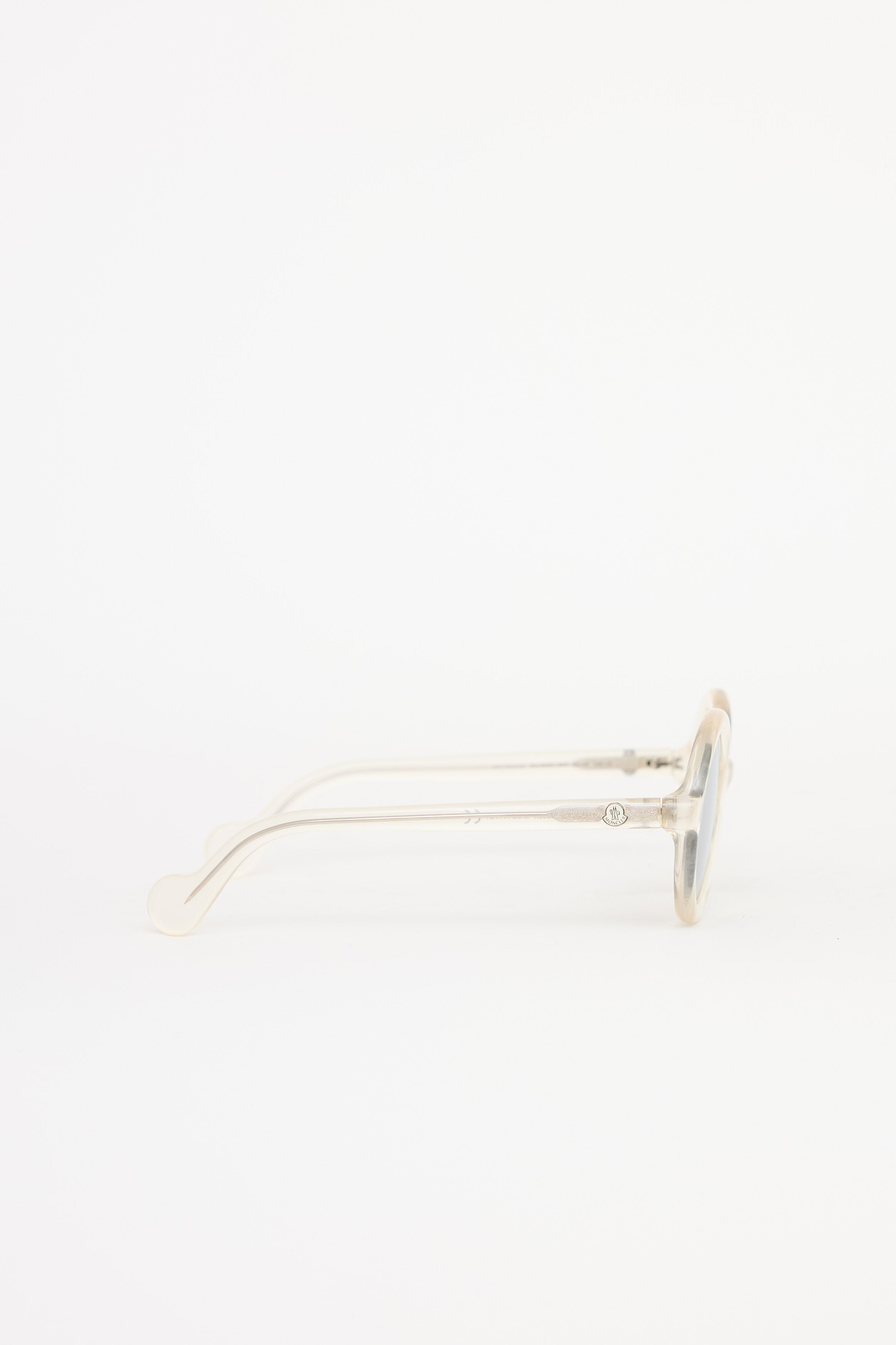 Pre-owned Moncler white Mrs Moncler white sunglasses featuring a round frame, tinted reflective lenses, nose pads, and logo hardware at temples.