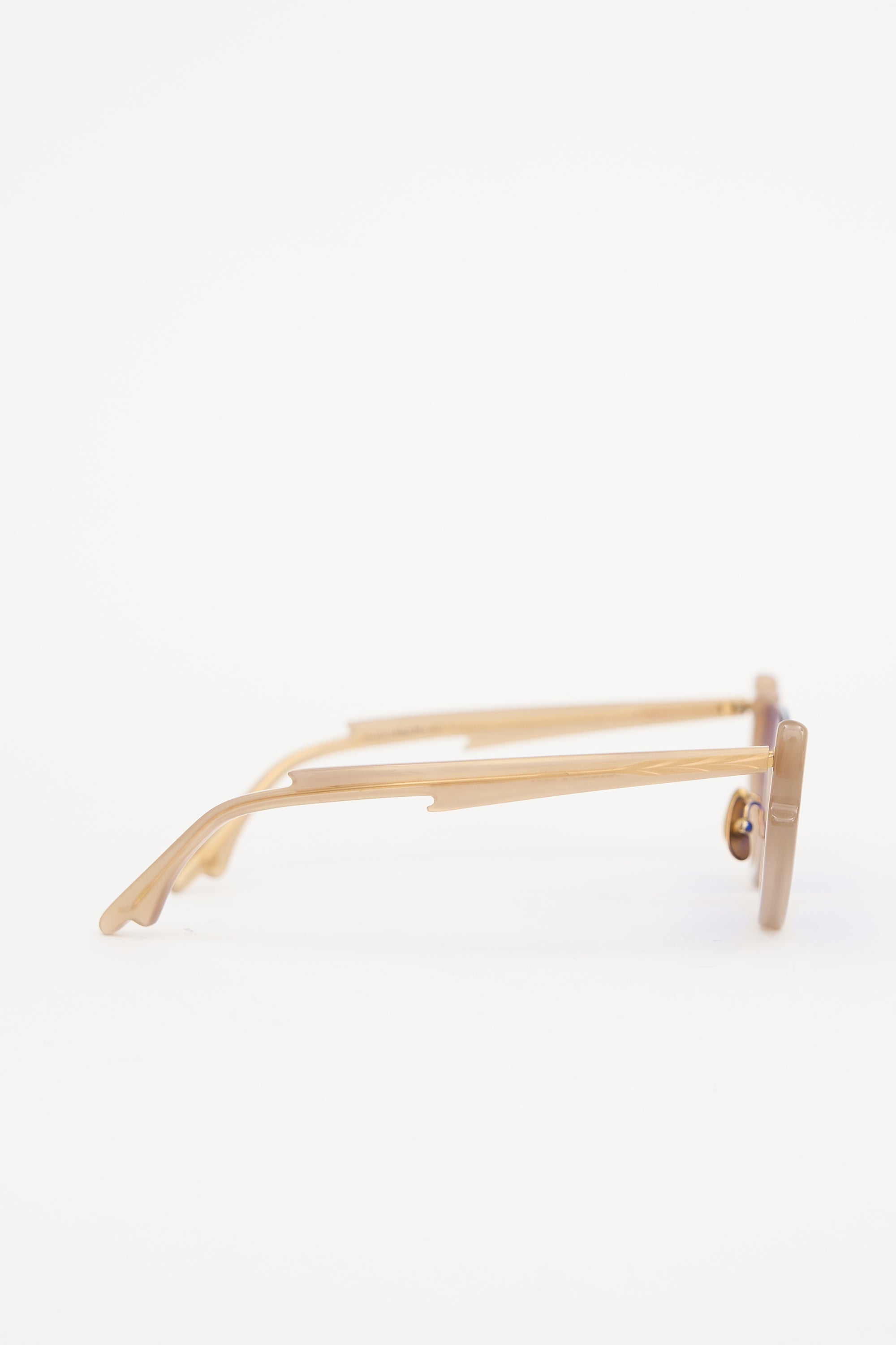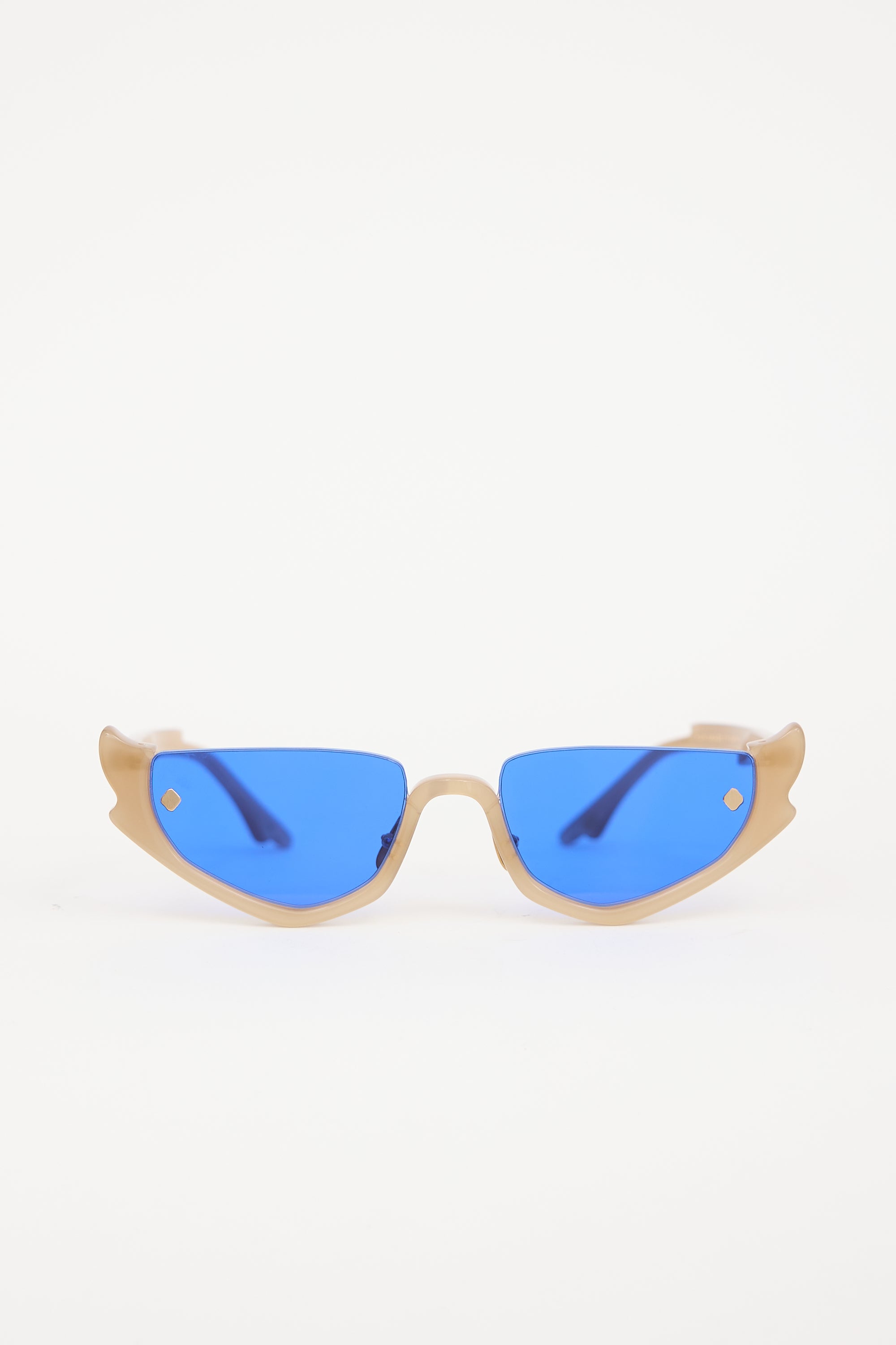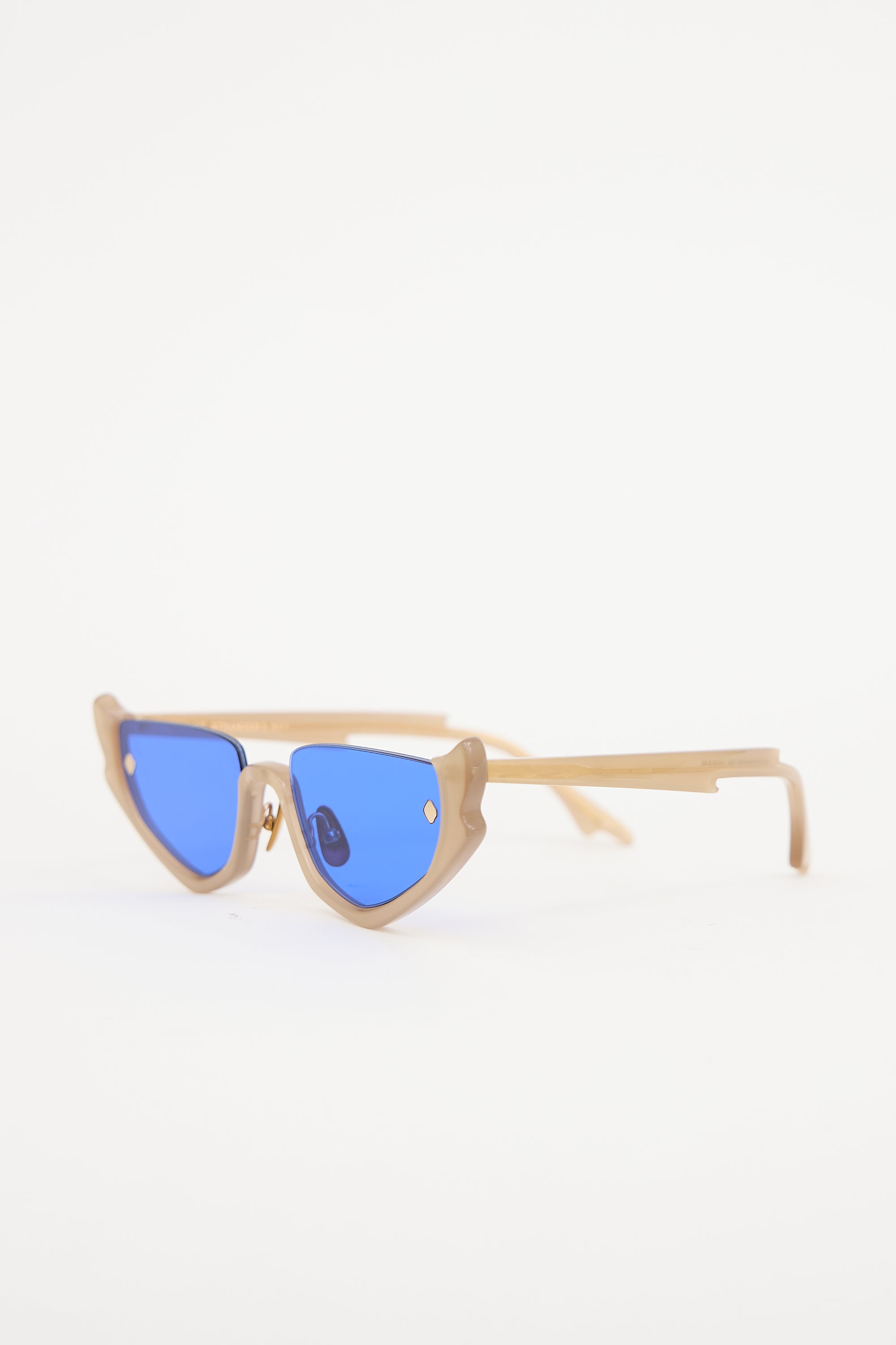 Pre-owned Moy Atelier Stranger's Ray sunglasses featuring blue tinted lenses, beige acetate sculptural cateye frame, sculptural arms, and inset gold tone circle logo at left arm tip. Comes with box, case, pouch, and wipe cloth.