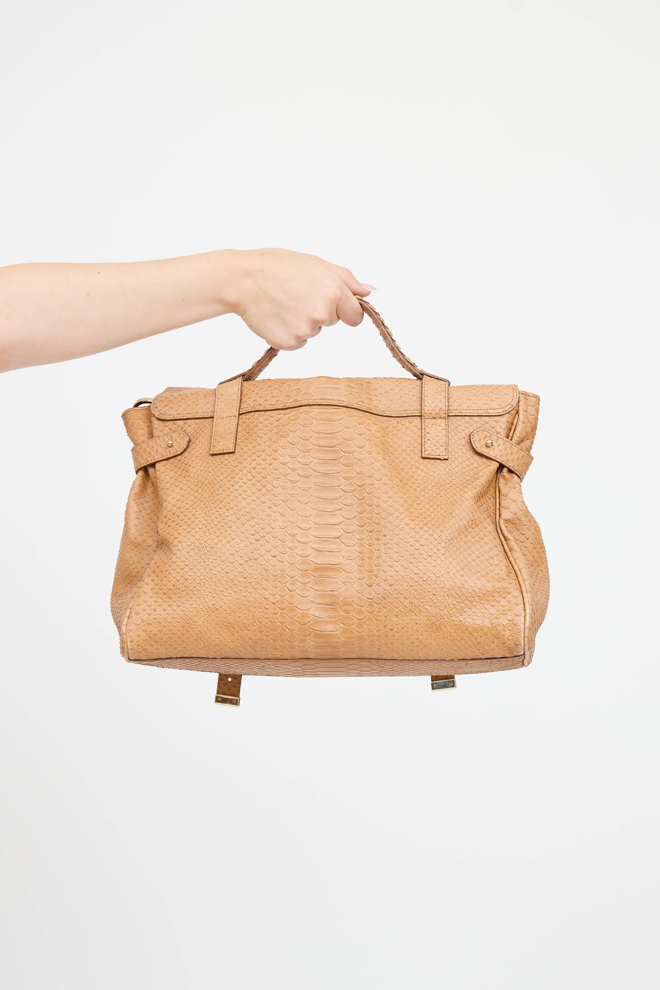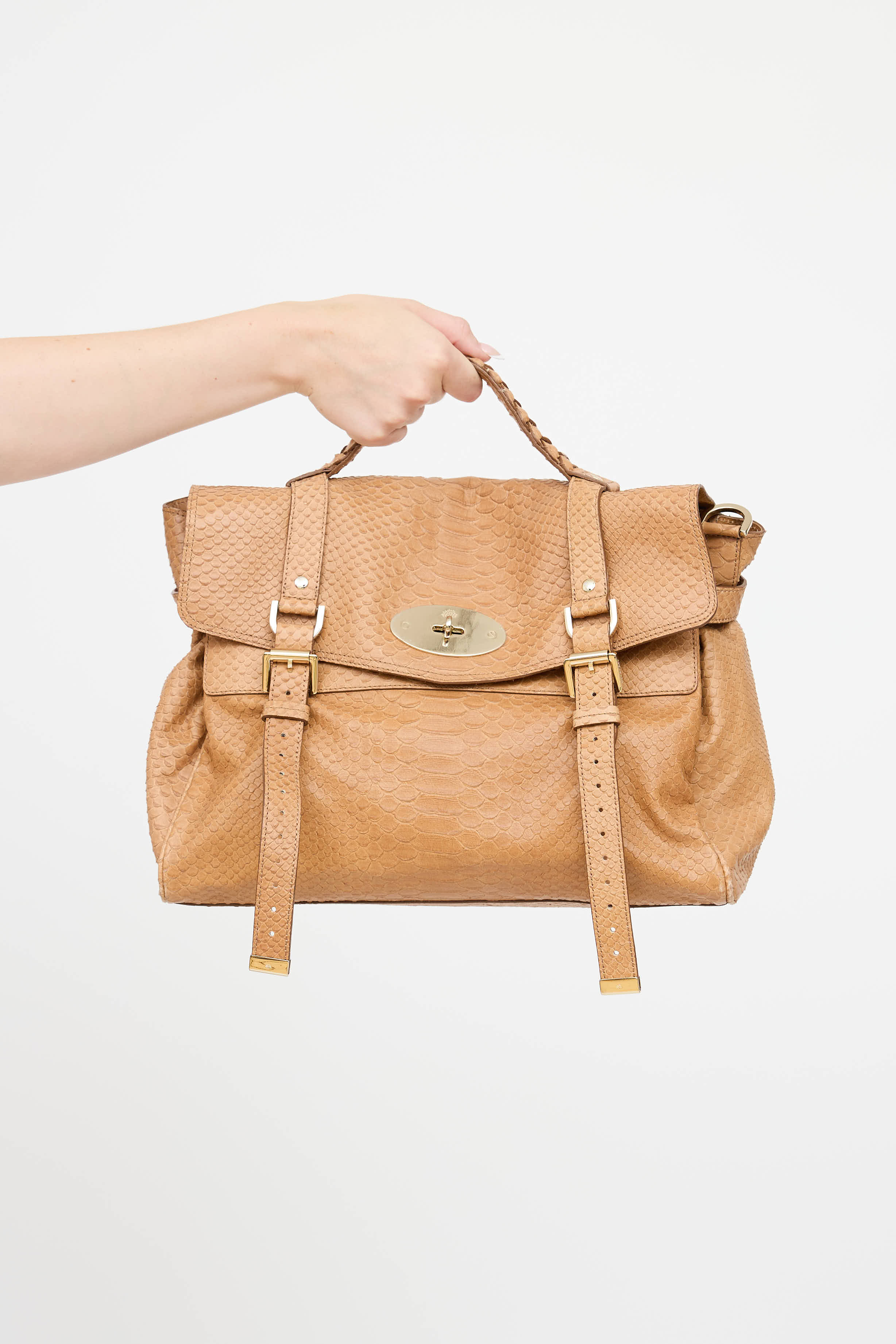 Pre-owned Mulberry brown snakeskin leather Alexa bag featuring singular flat braided top handle, silver tone hardware, turn lock closure with snaps, detachable and adjustable crossbody strap, and one main compartment with one slip pocket and one zip pocket. Item can only be shipped within Canada.