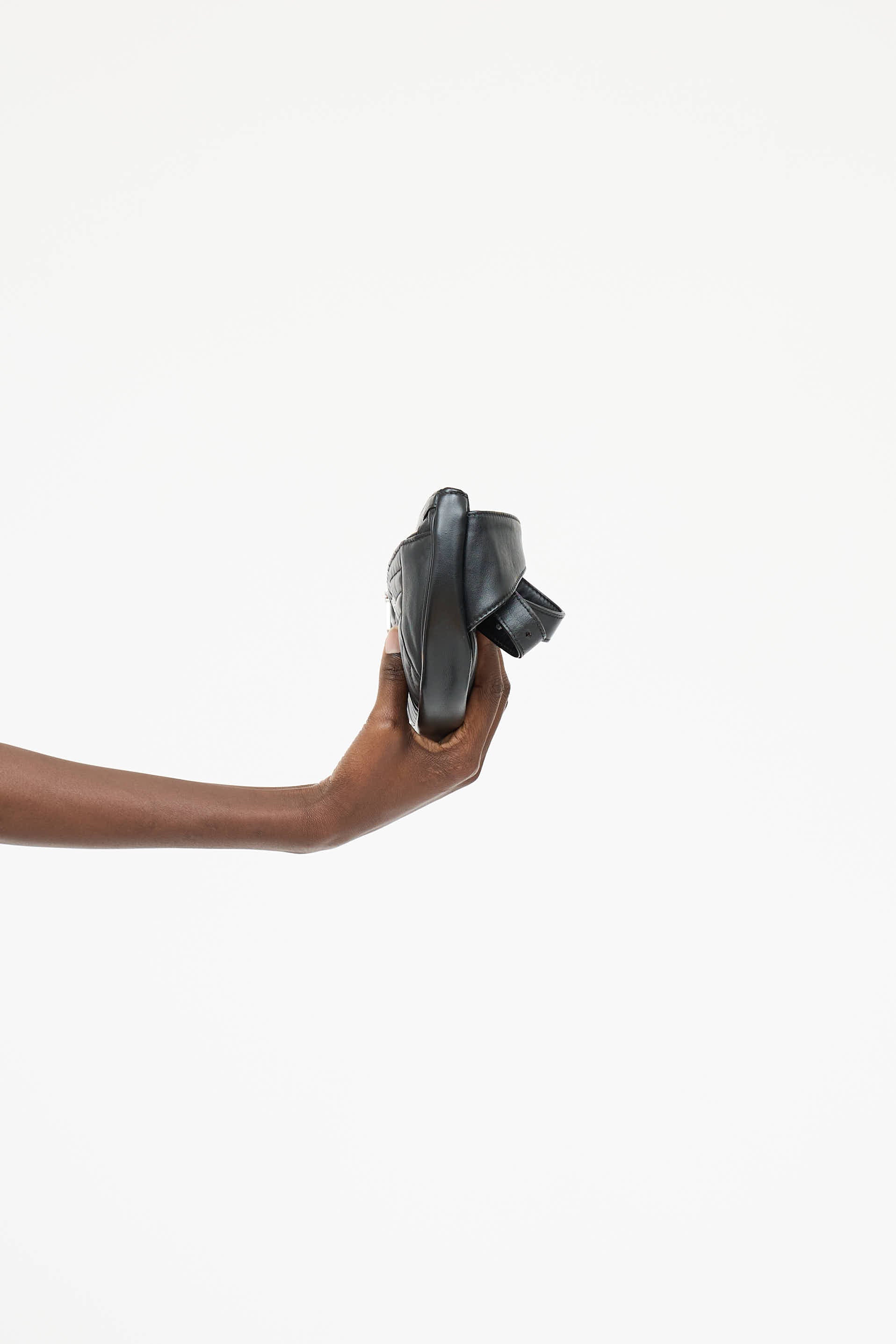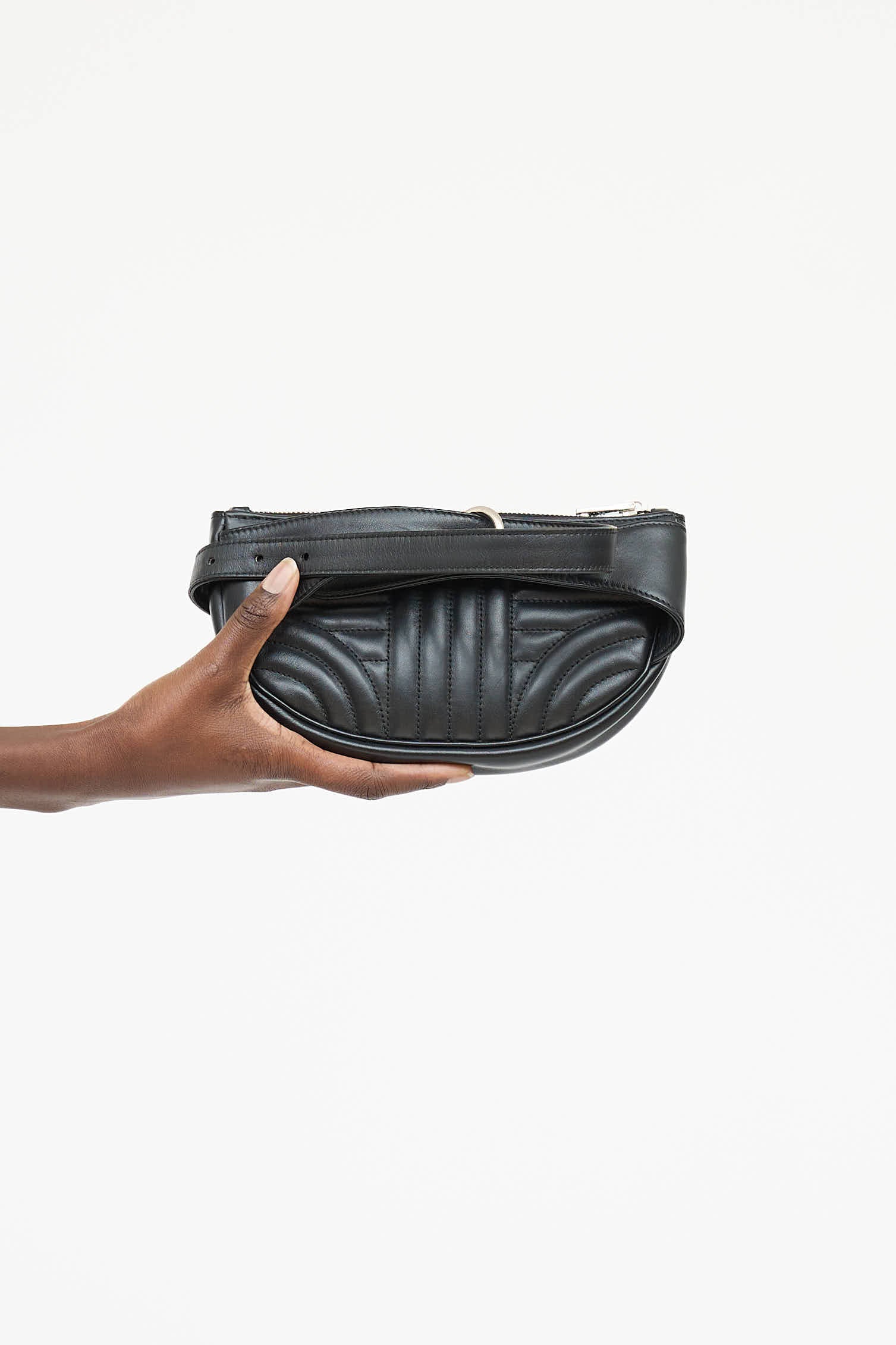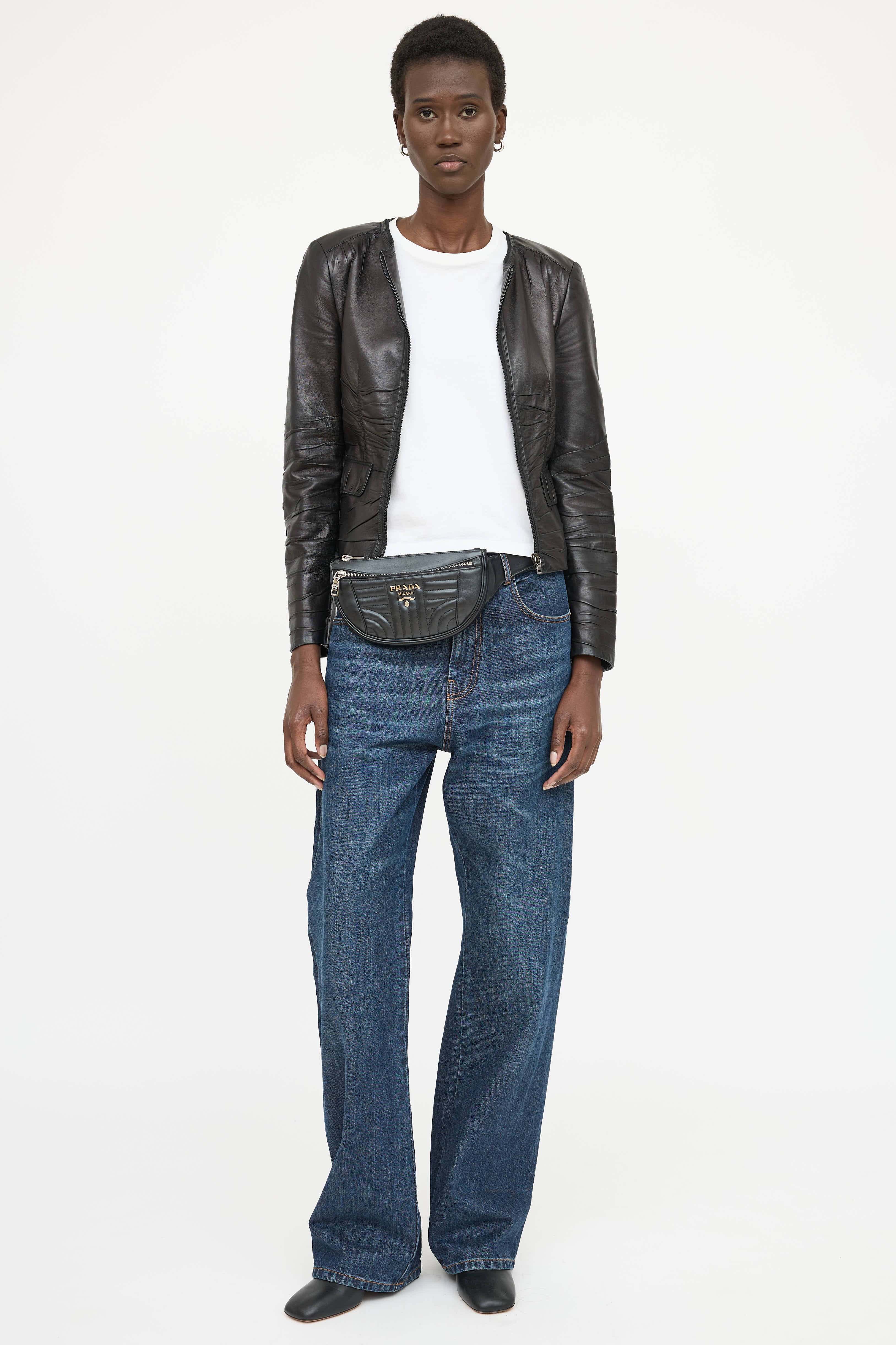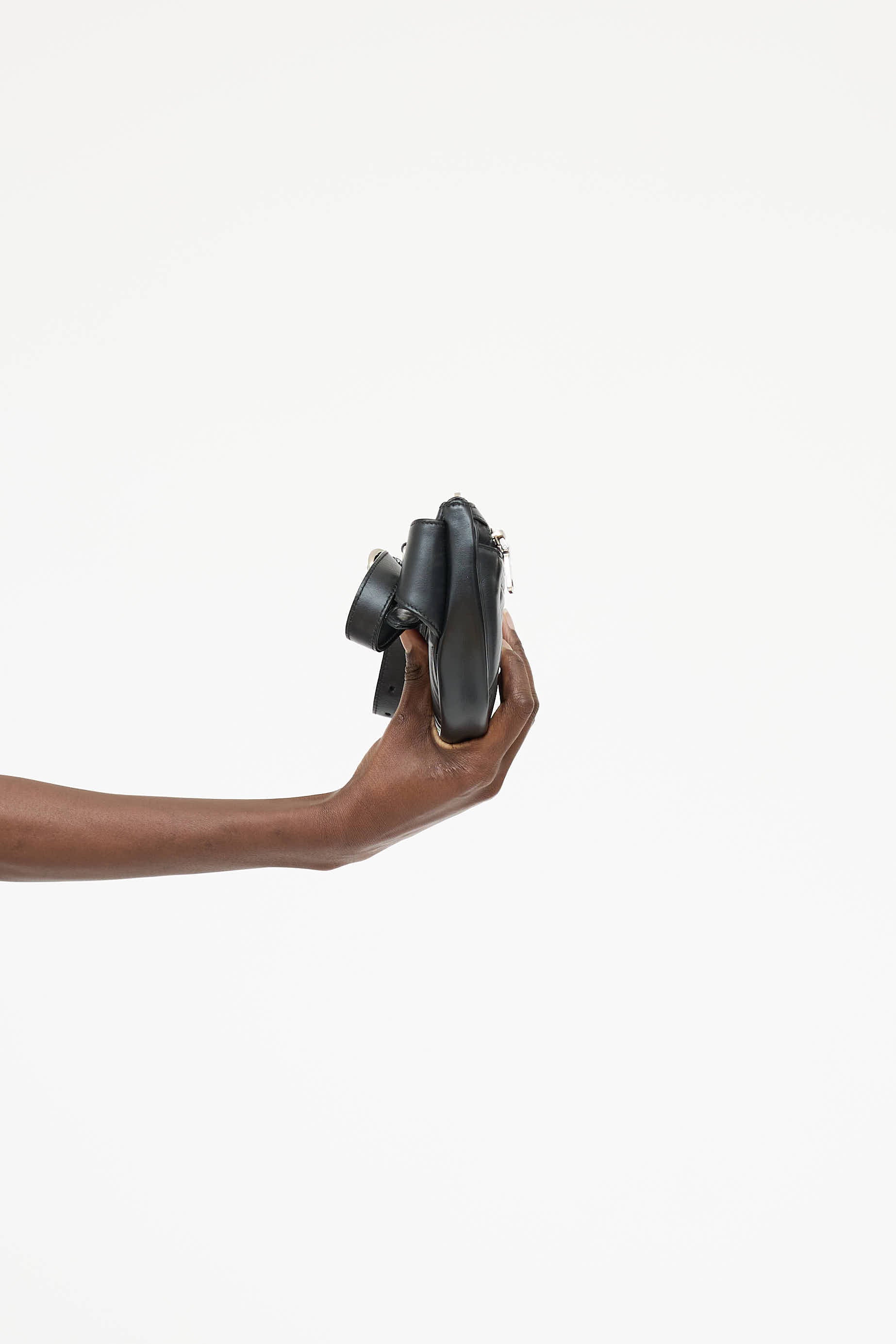 Pre-owned Prada black leather Impunture Diagramme belt bag featuring adjustable strap, silver tone hardware, front zip pocket, top zip closure, and one main compartment.