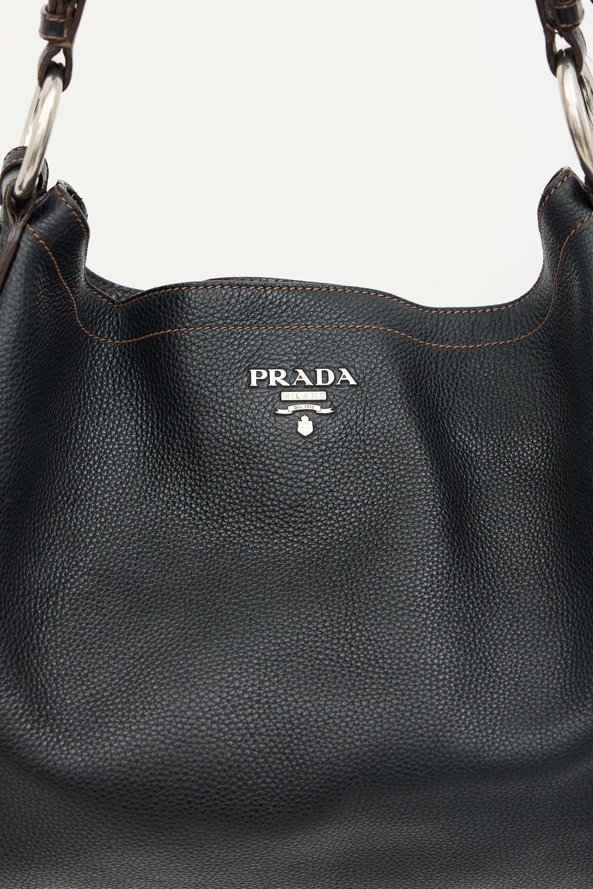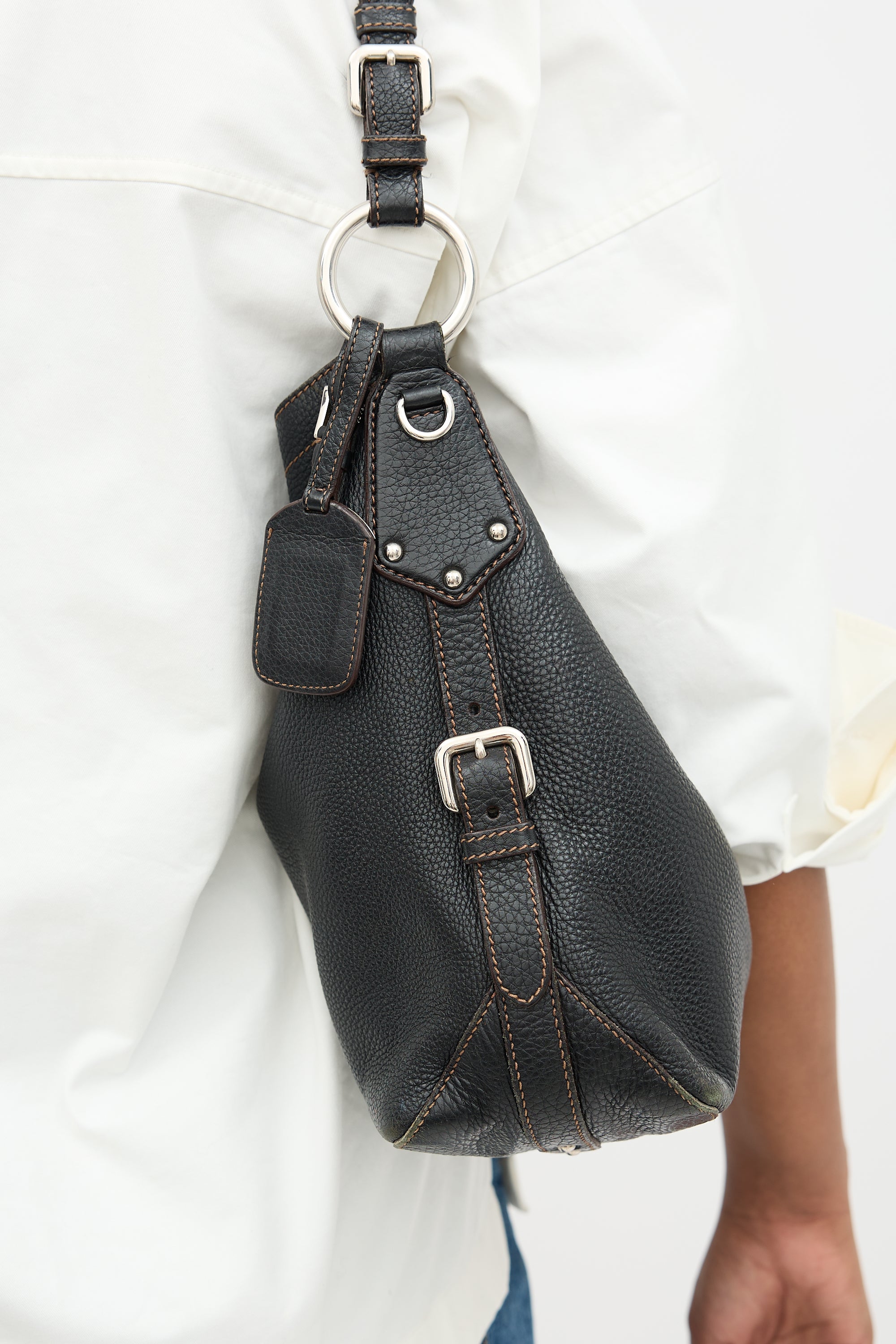 Pre-owned Prada black leather shoulder bag featuring brown contrast stitching, silver tone hardware, front logo embellishment, side buckle detail, single carry handle, removable tag, magnetic top closure, stamped logo at interior topline, and one lined main compartment with one zip pocket.
