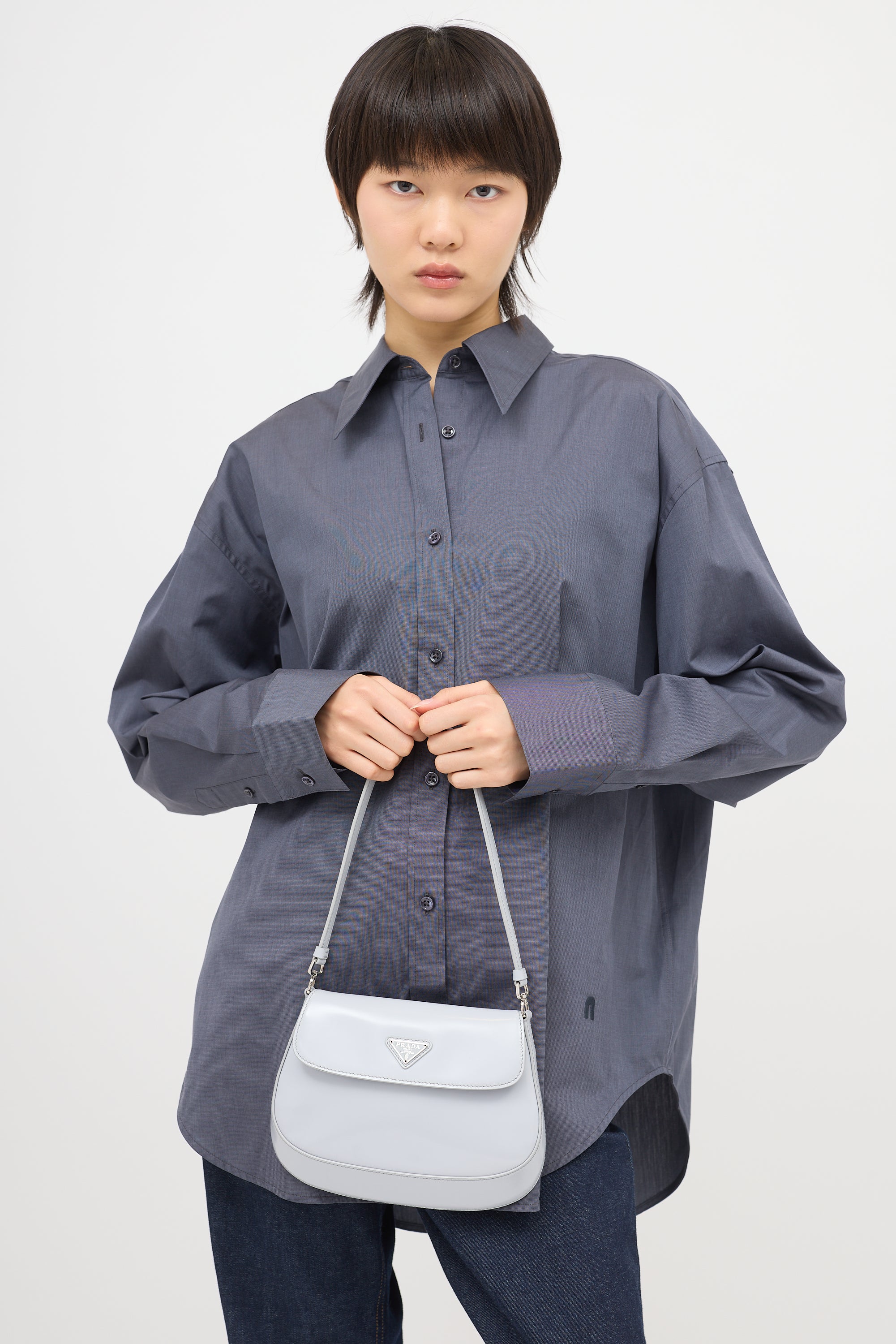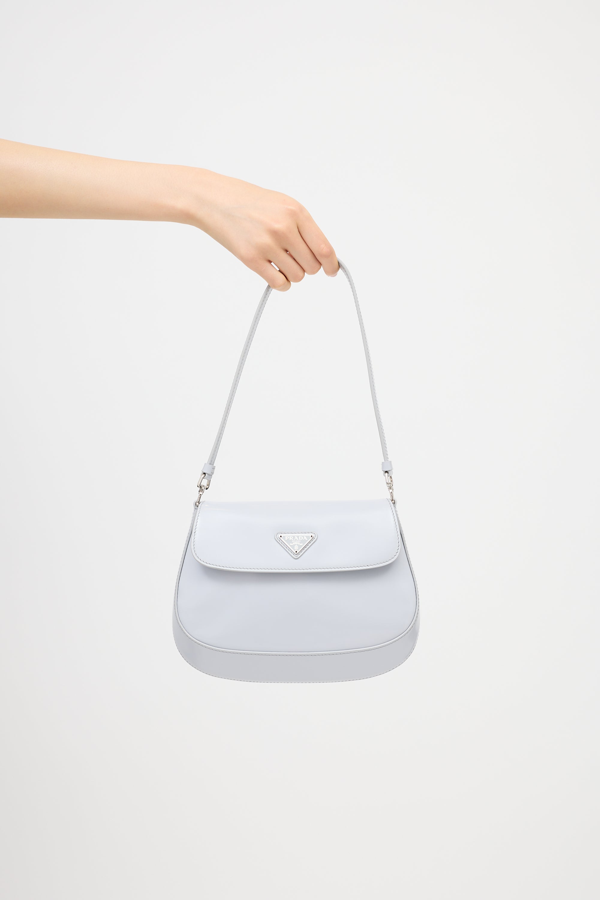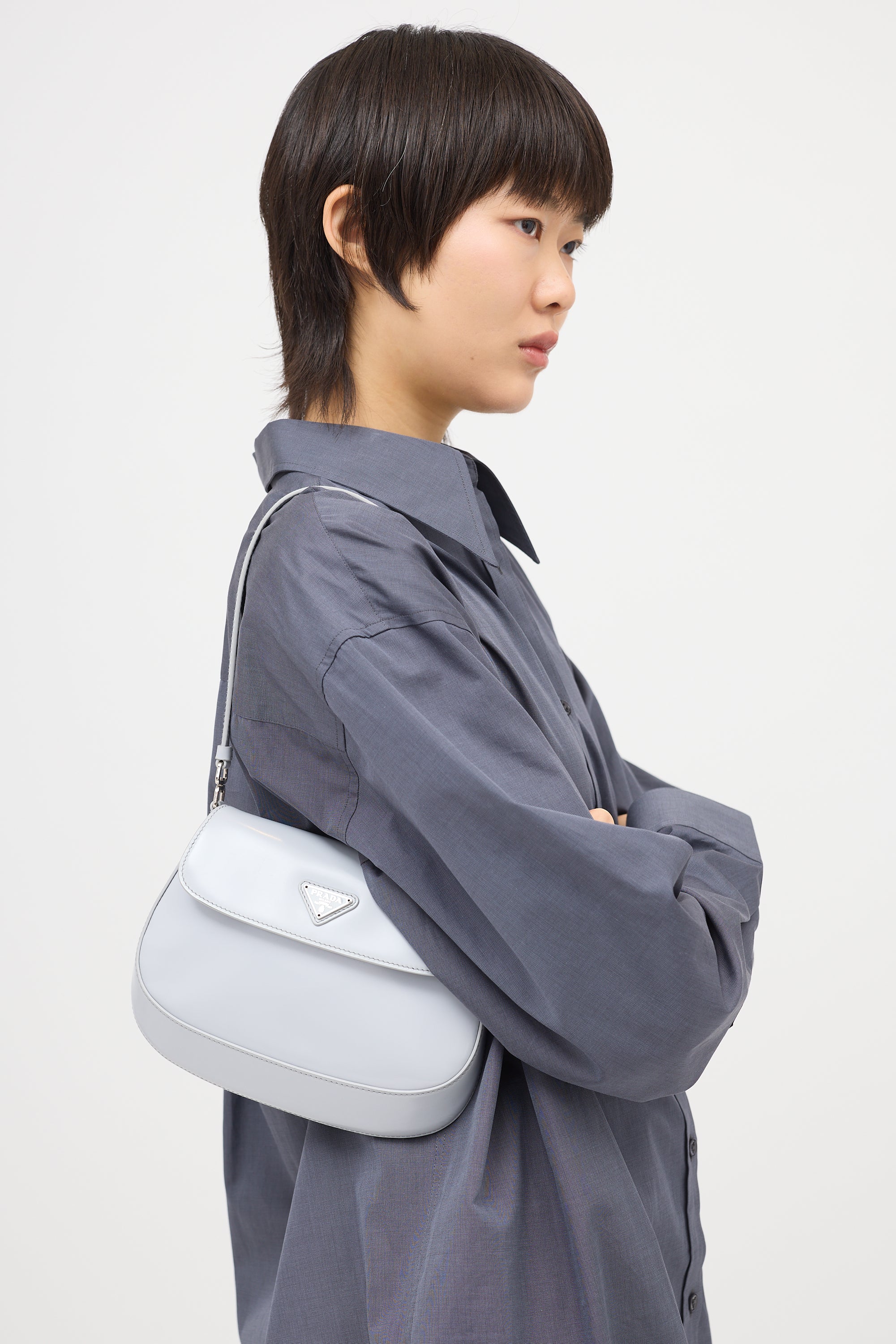 Pre-owned Prada grey brushed leather Mini Cleo bag featuring silver tone hardware, flat top handle, top flap with snap closure, signature triangle logo plaque and front face, back slip pocket, and two lined main compartments. Comes with original dust bag.