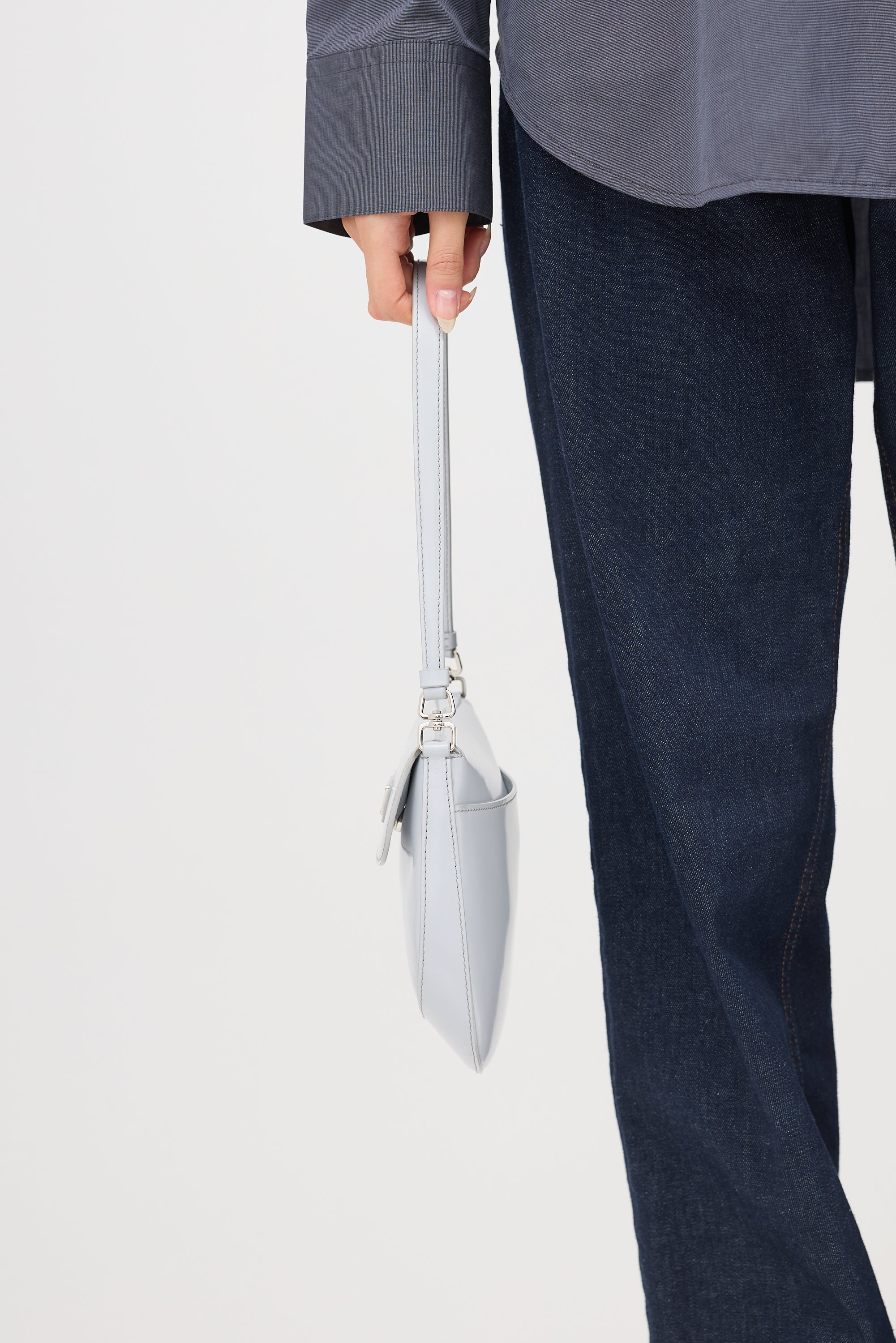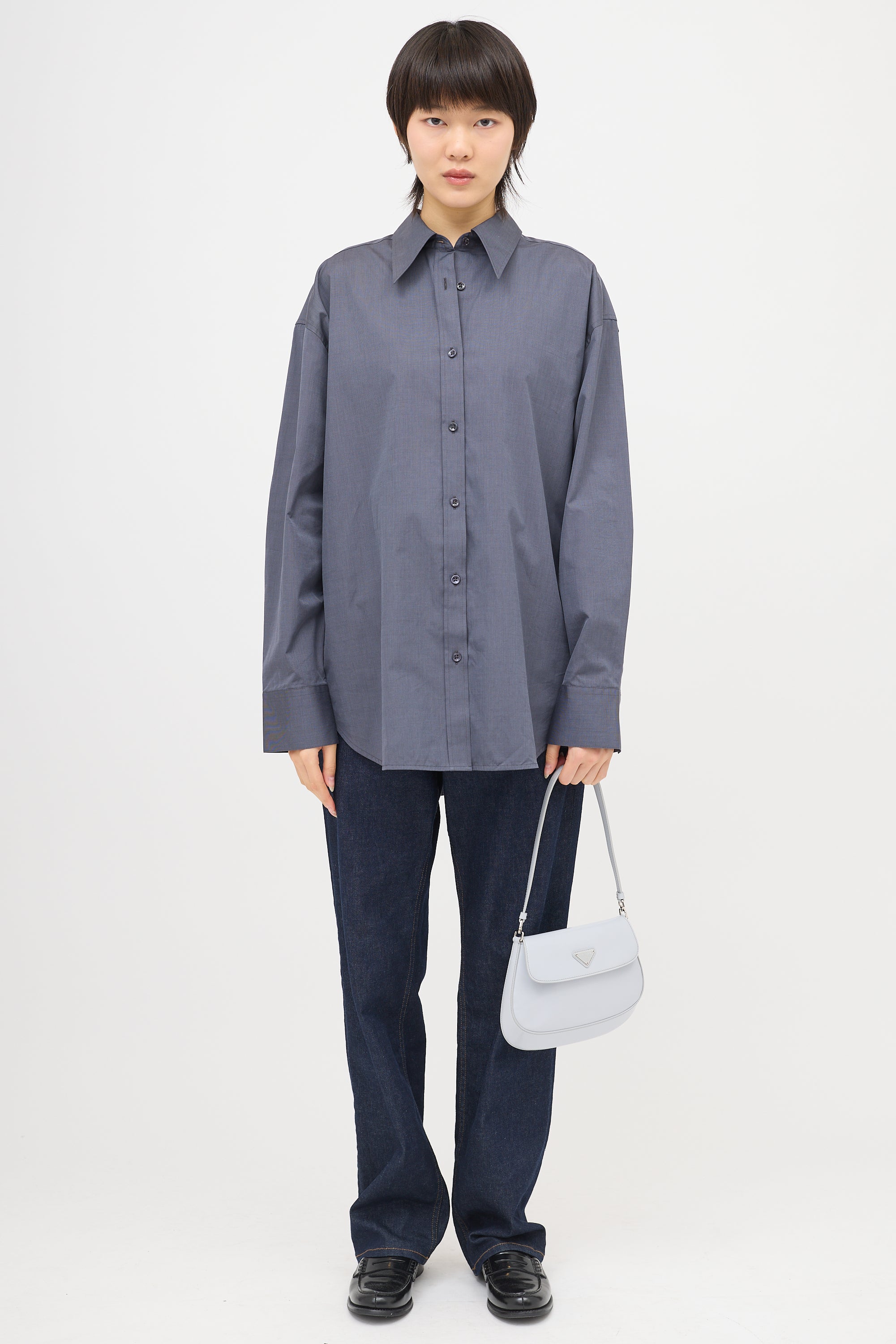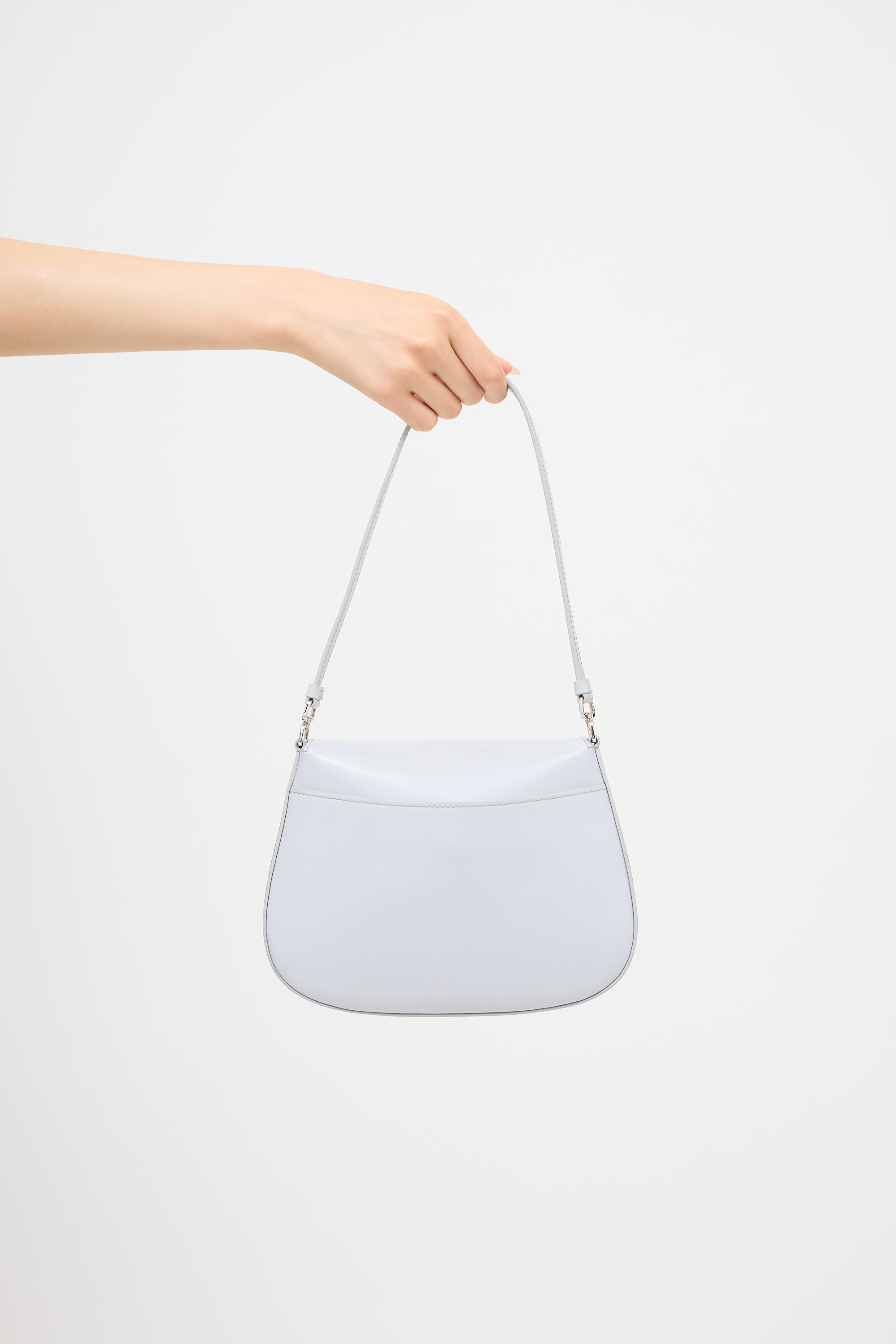 Pre-owned Prada grey brushed leather Mini Cleo bag featuring silver tone hardware, flat top handle, top flap with snap closure, signature triangle logo plaque and front face, back slip pocket, and two lined main compartments. Comes with original dust bag.